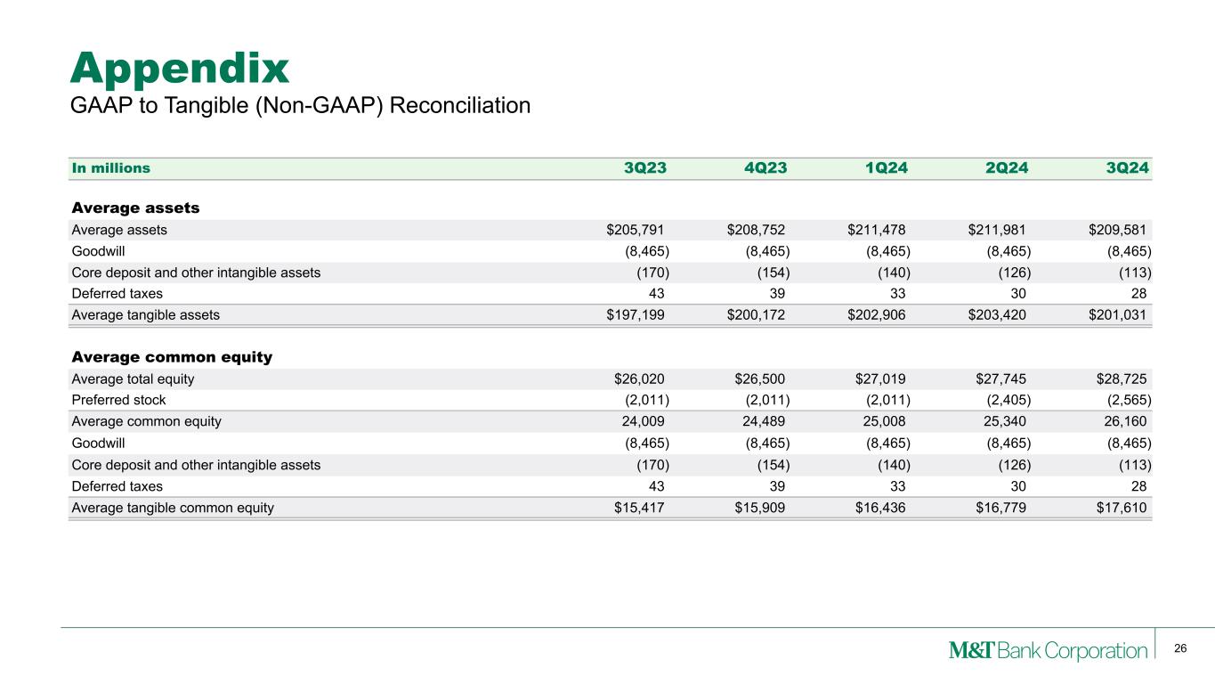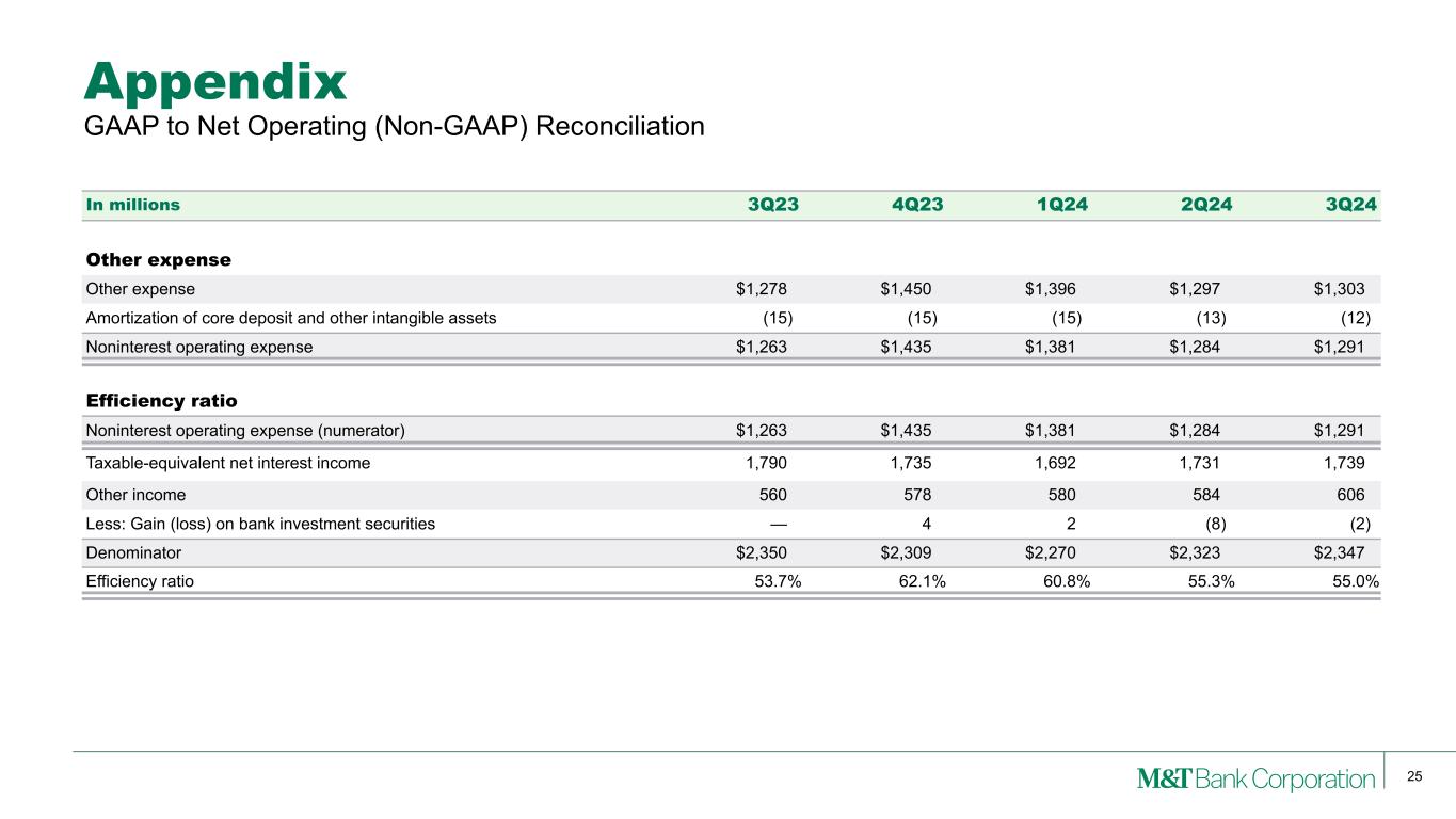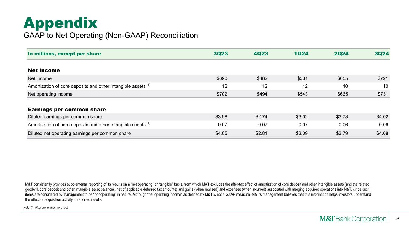 24 M&T consistently provides supplemental reporting of its results on a “net operating” or “tangible” basis, from which M&T excludes the after-tax effect of amortization of core deposit and other intangible assets (and the related goodwill, core deposit and other intangible asset balances, net of applicable deferred tax amounts) and gains (when realized) and expenses (when incurred) associated with merging acquired operations into M&T, since such items are considered by management to be “nonoperating” in nature. Although “net operating income” as defined by M&T is not a GAAP measure, M&T’s management believes that this information helps investors understand the effect of acquisition activity in reported results. Appendix Note: (1) After any related tax effect GAAP to Net Operating (Non-GAAP) Reconciliation In millions, except per share 3Q23 4Q23 1Q24 2Q24 3Q24 Net income Net income $690 $482 $531 $655 $721 Amortization of core deposits and other intangible assets (1) 12 12 12 10 10 Net operating income $702 $494 $543 $665 $731 Earnings per common share Diluted earnings per common share $3.98 $2.74 $3.02 $3.73 $4.02 Amortization of core deposits and other intangible assets (1) 0.07 0.07 0.07 0.06 0.06 Diluted net operating earnings per common share $4.05 $2.81 $3.09 $3.79 $4.08