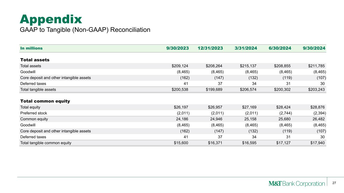 26 Appendix In millions 3Q23 4Q23 1Q24 2Q24 3Q24 Average assets Average assets $205,791 $208,752 $211,478 $211,981 $209,581 Goodwill (8,465) (8,465) (8,465) (8,465) (8,465) Core deposit and other intangible assets (170) (154) (140) (126) (113) Deferred taxes 43 39 33 30 28 Average tangible assets $197,199 $200,172 $202,906 $203,420 $201,031 Average common equity Average total equity $26,020 $26,500 $27,019 $27,745 $28,725 Preferred stock (2,011) (2,011) (2,011) (2,405) (2,565) Average common equity 24,009 24,489 25,008 25,340 26,160 Goodwill (8,465) (8,465) (8,465) (8,465) (8,465) Core deposit and other intangible assets (170) (154) (140) (126) (113) Deferred taxes 43 39 33 30 28 Average tangible common equity $15,417 $15,909 $16,436 $16,779 $17,610 GAAP to Tangible (Non-GAAP) Reconciliation