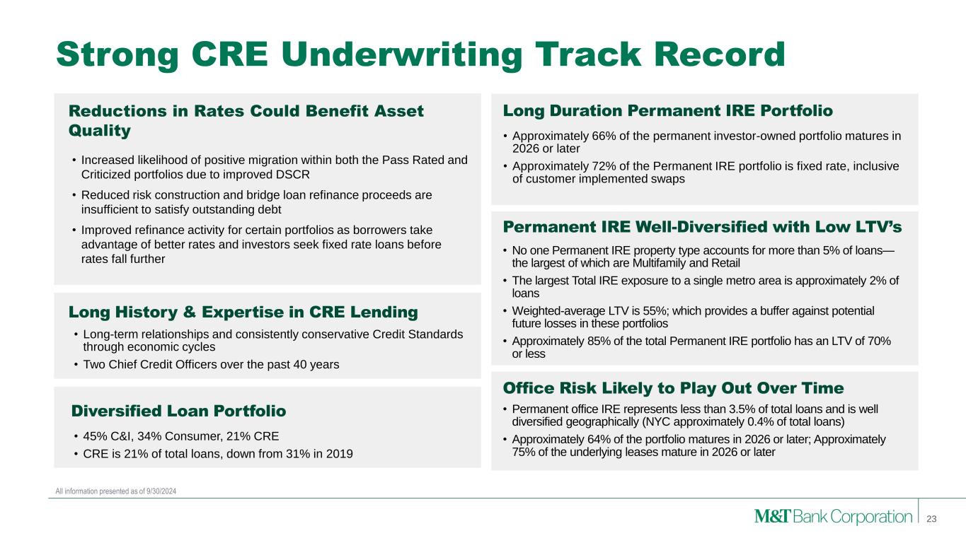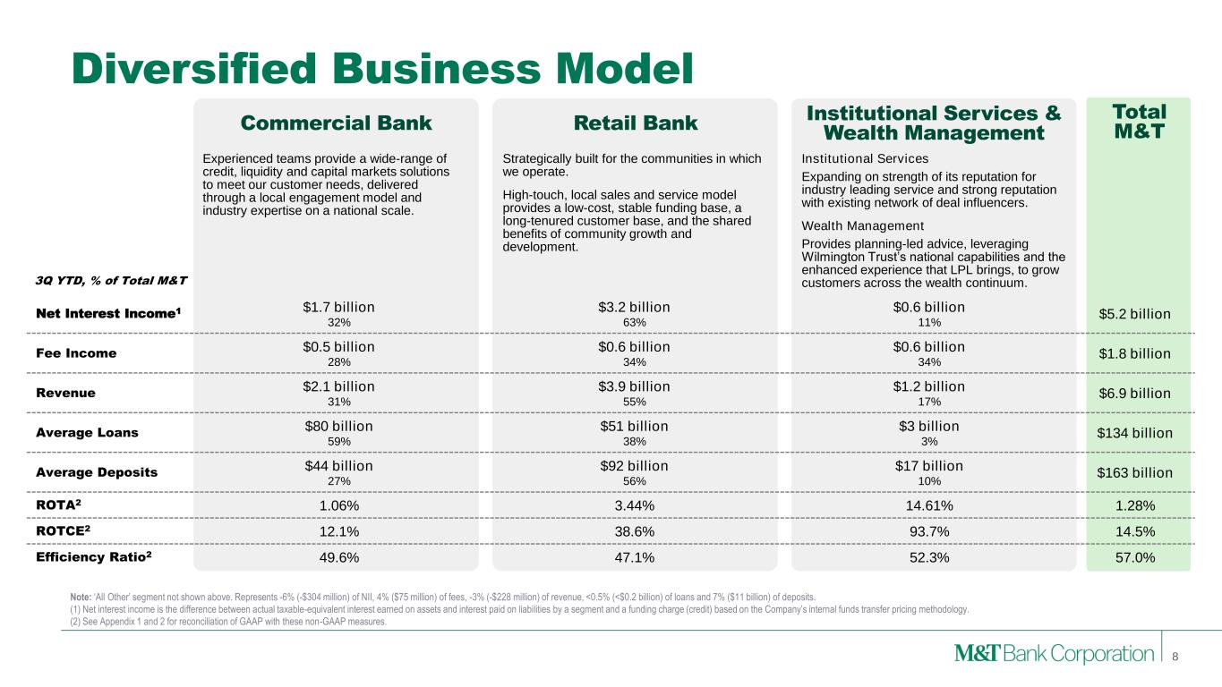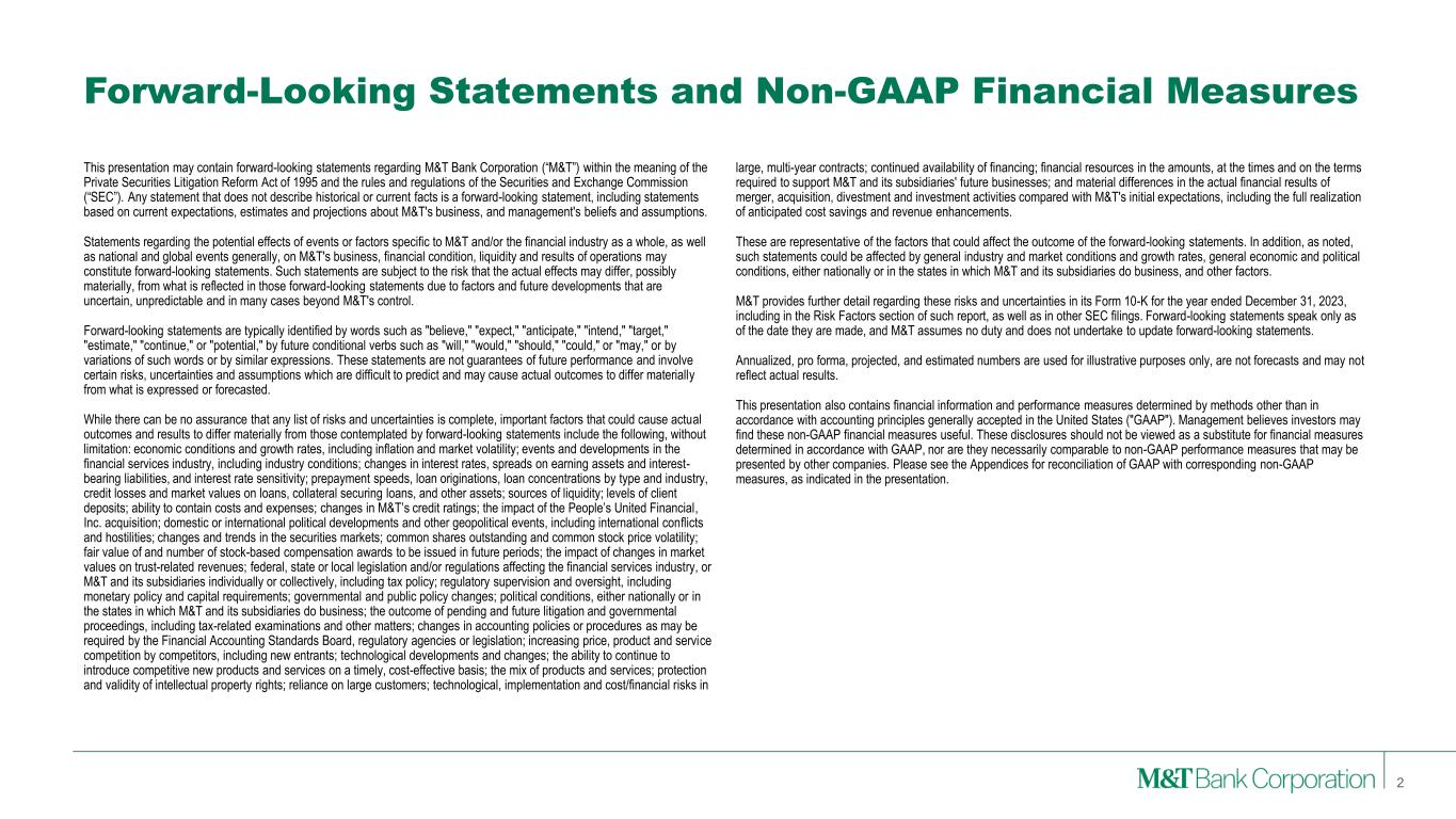 Forward-Looking Statements and Non-GAAP Financial Measures This presentation may contain forward-looking statements regarding M&T Bank Corporation (“M&T”) within the meaning of the Private Securities Litigation Reform Act of 1995 and the rules and regulations of the Securities and Exchange Commission (“SEC”). Any statement that does not describe historical or current facts is a forward-looking statement, including statements based on current expectations, estimates and projections about M&T's business, and management's beliefs and assumptions. Statements regarding the potential effects of events or factors specific to M&T and/or the financial industry as a whole, as well as national and global events generally, on M&T's business, financial condition, liquidity and results of operations may constitute forward-looking statements. Such statements are subject to the risk that the actual effects may differ, possibly materially, from what is reflected in those forward-looking statements due to factors and future developments that are uncertain, unpredictable and in many cases beyond M&T's control. Forward-looking statements are typically identified by words such as "believe," "expect," "anticipate," "intend," "target," "estimate," "continue," or "potential," by future conditional verbs such as "will," "would," "should," "could," or "may," or by variations of such words or by similar expressions. These statements are not guarantees of future performance and involve certain risks, uncertainties and assumptions which are difficult to predict and may cause actual outcomes to differ materially from what is expressed or forecasted. While there can be no assurance that any list of risks and uncertainties is complete, important factors that could cause actual outcomes and results to differ materially from those contemplated by forward-looking statements include the following, without limitation: economic conditions and growth rates, including inflation and market volatility; events and developments in the financial services industry, including industry conditions; changes in interest rates, spreads on earning assets and interest- bearing liabilities, and interest rate sensitivity; prepayment speeds, loan originations, loan concentrations by type and industry, credit losses and market values on loans, collateral securing loans, and other assets; sources of liquidity; levels of client deposits; ability to contain costs and expenses; changes in M&T’s credit ratings; the impact of the People’s United Financial, Inc. acquisition; domestic or international political developments and other geopolitical events, including international conflicts and hostilities; changes and trends in the securities markets; common shares outstanding and common stock price volatility; fair value of and number of stock-based compensation awards to be issued in future periods; the impact of changes in market values on trust-related revenues; federal, state or local legislation and/or regulations affecting the financial services industry, or M&T and its subsidiaries individually or collectively, including tax policy; regulatory supervision and oversight, including monetary policy and capital requirements; governmental and public policy changes; political conditions, either nationally or in the states in which M&T and its subsidiaries do business; the outcome of pending and future litigation and governmental proceedings, including tax-related examinations and other matters; changes in accounting policies or procedures as may be required by the Financial Accounting Standards Board, regulatory agencies or legislation; increasing price, product and service competition by competitors, including new entrants; technological developments and changes; the ability to continue to introduce competitive new products and services on a timely, cost-effective basis; the mix of products and services; protection and validity of intellectual property rights; reliance on large customers; technological, implementation and cost/financial risks in large, multi-year contracts; continued availability of financing; financial resources in the amounts, at the times and on the terms required to support M&T and its subsidiaries' future businesses; and material differences in the actual financial results of merger, acquisition, divestment and investment activities compared with M&T's initial expectations, including the full realization of anticipated cost savings and revenue enhancements. These are representative of the factors that could affect the outcome of the forward-looking statements. In addition, as noted, such statements could be affected by general industry and market conditions and growth rates, general economic and political conditions, either nationally or in the states in which M&T and its subsidiaries do business, and other factors. M&T provides further detail regarding these risks and uncertainties in its Form 10-K for the year ended December 31, 2023, including in the Risk Factors section of such report, as well as in other SEC filings. Forward-looking statements speak only as of the date they are made, and M&T assumes no duty and does not undertake to update forward-looking statements. Annualized, pro forma, projected, and estimated numbers are used for illustrative purposes only, are not forecasts and may not reflect actual results. This presentation also contains financial information and performance measures determined by methods other than in accordance with accounting principles generally accepted in the United States ("GAAP"). Management believes investors may find these non-GAAP financial measures useful. These disclosures should not be viewed as a substitute for financial measures determined in accordance with GAAP, nor are they necessarily comparable to non-GAAP performance measures that may be presented by other companies. Please see the Appendices for reconciliation of GAAP with corresponding non-GAAP measures, as indica