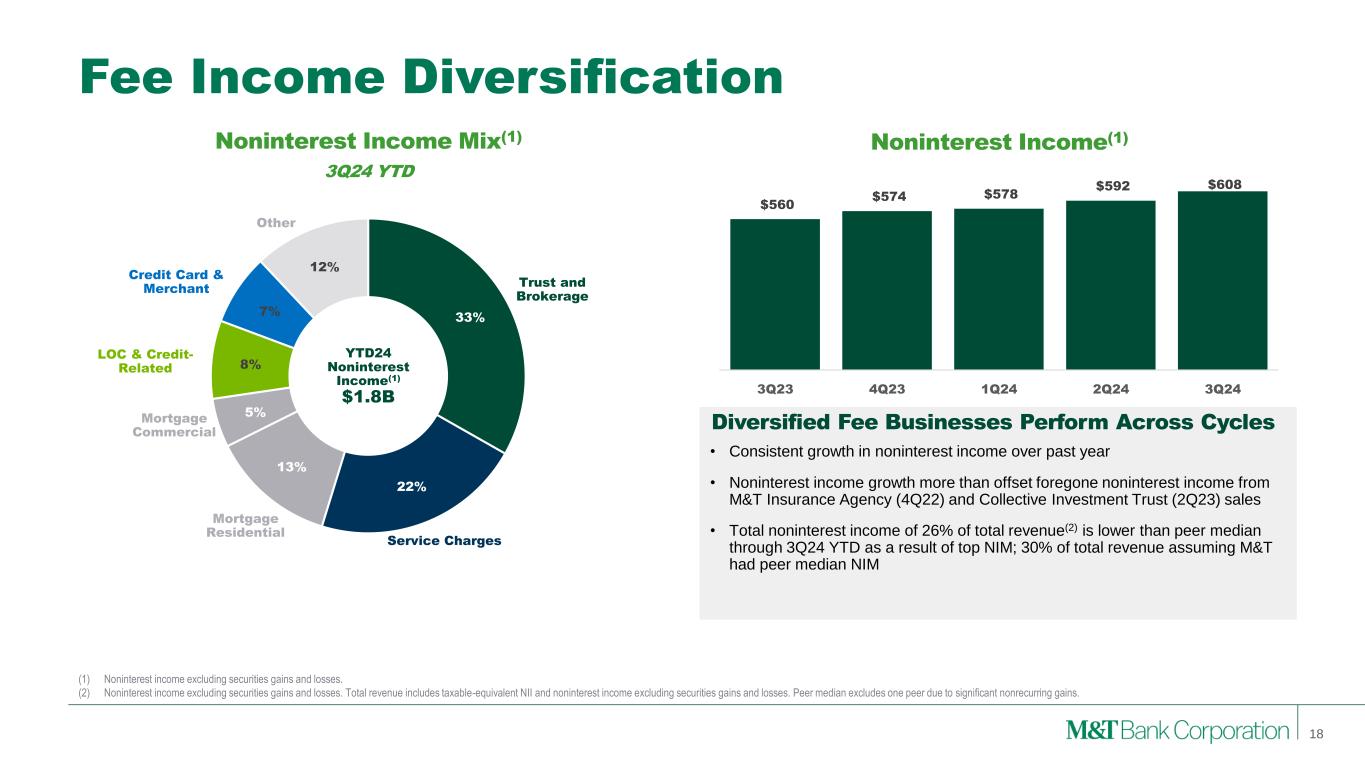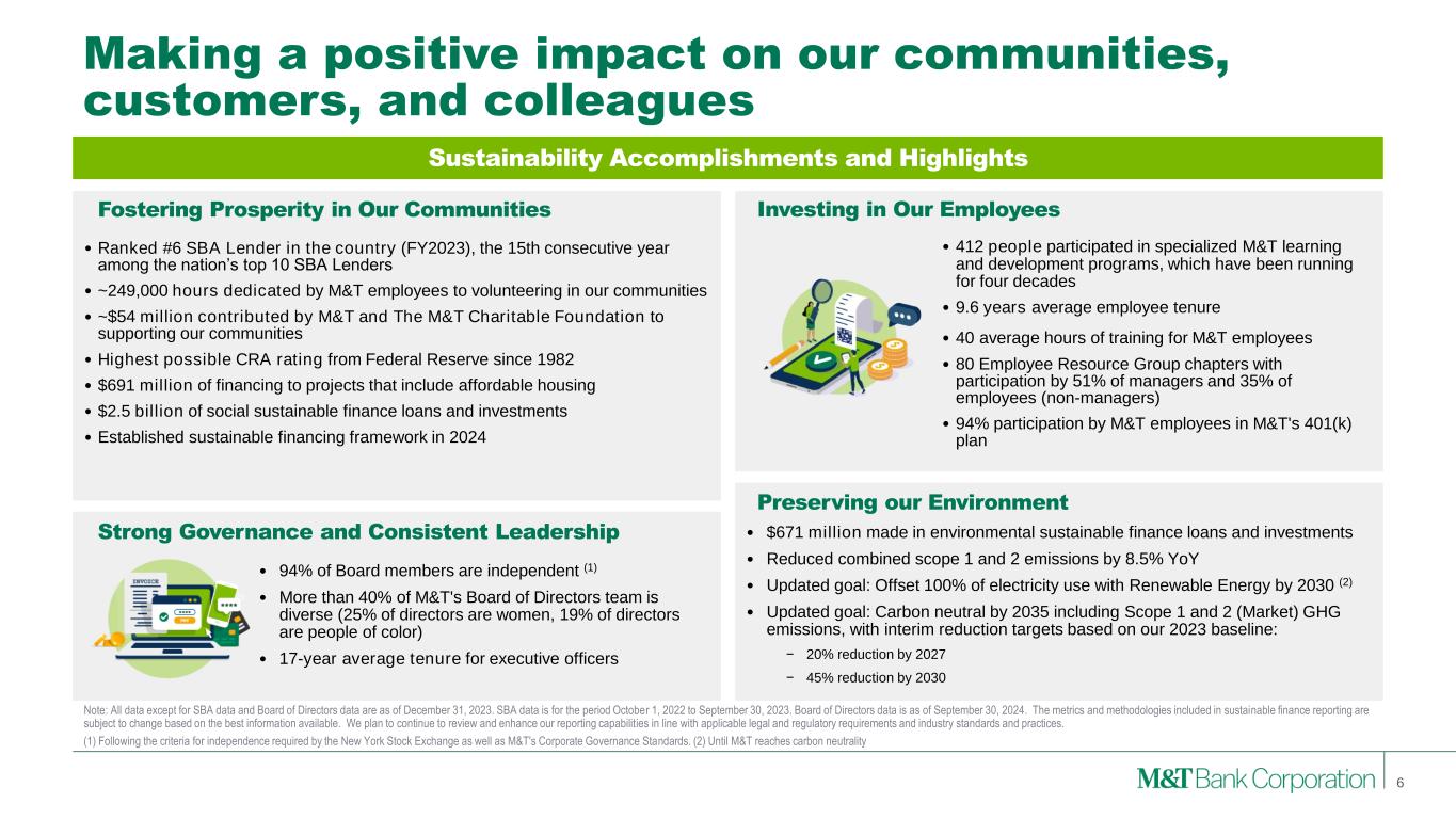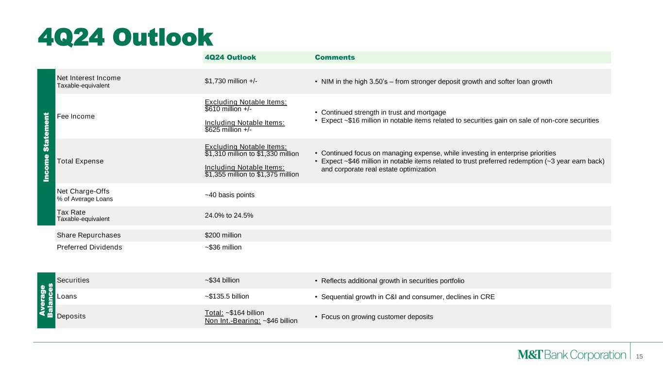 Forward-Looking Statements and Non-GAAP Financial Measures This presentation may contain forward-looking statements regarding M&T Bank Corporation (“M&T”) within the meaning of the Private Securities Litigation Reform Act of 1995 and the rules and regulations of the Securities and Exchange Commission (“SEC”). Any statement that does not describe historical or current facts is a forward-looking statement, including statements based on current expectations, estimates and projections about M&T's business, and management's beliefs and assumptions. Statements regarding the potential effects of events or factors specific to M&T and/or the financial industry as a whole, as well as national and global events generally, on M&T's business, financial condition, liquidity and results of operations may constitute forward-looking statements. Such statements are subject to the risk that the actual effects may differ, possibly materially, from what is reflected in those forward-looking statements due to factors and future developments that are uncertain, unpredictable and in many cases beyond M&T's control. Forward-looking statements are typically identified by words such as "believe," "expect," "anticipate," "intend," "target," "estimate," "continue," or "potential," by future conditional verbs such as "will," "would," "should," "could," or "may," or by variations of such words or by similar expressions. These statements are not guarantees of future performance and involve certain risks, uncertainties and assumptions which are difficult to predict and may cause actual outcomes to differ materially from what is expressed or forecasted. While there can be no assurance that any list of risks and uncertainties is complete, important factors that could cause actual outcomes and results to differ materially from those contemplated by forward-looking statements include the following, without limitation: economic conditions and growth rates, including inflation and market volatility; events and developments in the financial services industry, including industry conditions; changes in interest rates, spreads on earning assets and interest- bearing liabilities, and interest rate sensitivity; prepayment speeds, loan originations, loan concentrations by type and industry, credit losses and market values on loans, collateral securing loans, and other assets; sources of liquidity; levels of client deposits; ability to contain costs and expenses; changes in M&T’s credit ratings; the impact of the People’s United Financial, Inc. acquisition; domestic or international political developments and other geopolitical events, including international conflicts and hostilities; changes and trends in the securities markets; common shares outstanding and common stock price volatility; fair value of and number of stock-based compensation awards to be issued in future periods; the impact of changes in market values on trust-related revenues; federal, state or local legislation and/or regulations affecting the financial services industry, or M&T and its subsidiaries individually or collectively, including tax policy; regulatory supervision and oversight, including monetary policy and capital requirements; governmental and public policy changes; political conditions, either nationally or in the states in which M&T and its subsidiaries do business; the outcome of pending and future litigation and governmental proceedings, including tax-related examinations and other matters; changes in accounting policies or procedures as may be required by the Financial Accounting Standards Board, regulatory agencies or legislation; increasing price, product and service competition by competitors, including new entrants; technological developments and changes; the ability to continue to introduce competitive new products and services on a timely, cost-effective basis; the mix of products and services; protection and validity of intellectual property rights; reliance on large customers; technological, implementation and cost/financial risks in large, multi-year contracts; continued availability of financing; financial resources in the amounts, at the times and on the terms required to support M&T and its subsidiaries' future businesses; and material differences in the actual financial results of merger, acquisition, divestment and investment activities compared with M&T's initial expectations, including the full realization of anticipated cost savings and revenue enhancements. These are representative of the factors that could affect the outcome of the forward-looking statements. In addition, as noted, such statements could be affected by general industry and market conditions and growth rates, general economic and political conditions, either nationally or in the states in which M&T and its subsidiaries do business, and other factors. M&T provides further detail regarding these risks and uncertainties in its Form 10-K for the year ended December 31, 2023, including in the Risk Factors section of such report, as well as in other SEC filings. Forward-looking statements speak only as of the date they are made, and M&T assumes no duty and does not undertake to update forward-looking statements. Annualized, pro forma, projected, and estimated numbers are used for illustrative purposes only, are not forecasts and may not reflect actual results. This presentation also contains financial information and performance measures determined by methods other than in accordance with accounting principles generally accepted in the United States ("GAAP"). Management believes investors may find these non-GAAP financial measures useful. These disclosures should not be viewed as a substitute for financial measures determined in accordance with GAAP, nor are they necessarily comparable to non-GAAP performance measures that may be presented by other companies. Please see the Appendices for reconciliation of GAAP with corresponding non-GAAP measures, as indica