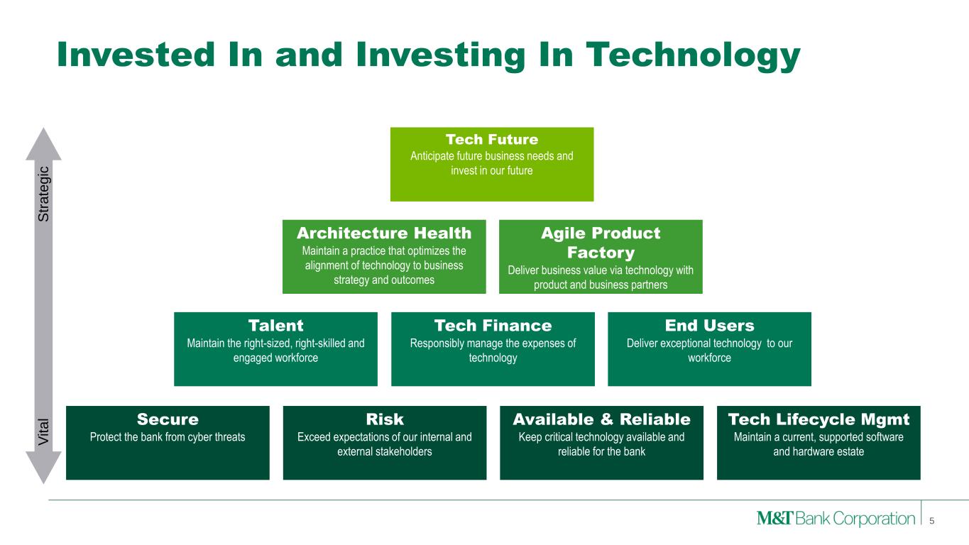 Focused on Four Priorities 4 Build our New England and Long Island Markets Optimize our Resources through Simplification Make our Systems and Processes Resilient and Scalable Continue to Develop and Scale our Capability to Manage Risk We continue our mission to simplify M&T and make investments that will improve the experience of our customers and colleagues — and help us maintain our differentiated community bank approach