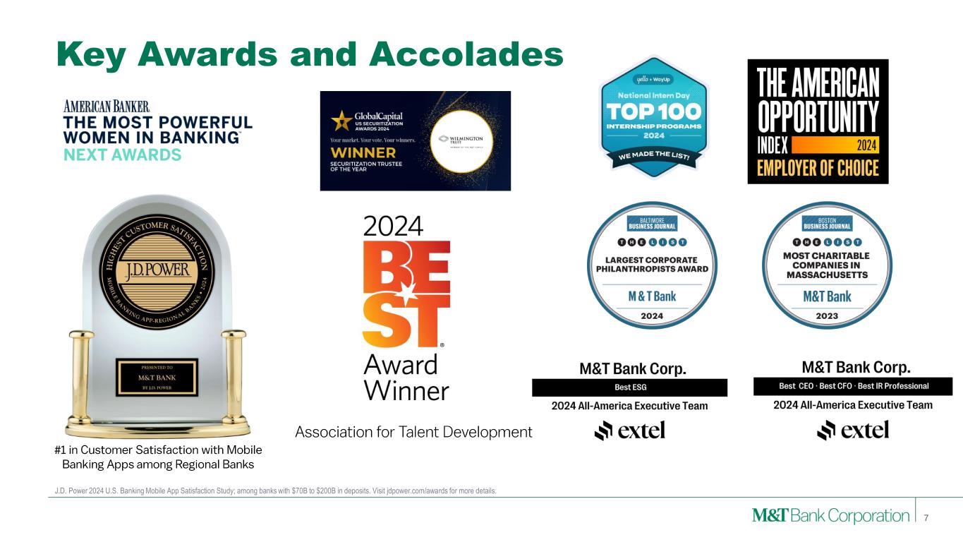 Making a positive impact on our communities, customers, and colleagues Fostering Prosperity in Our Communities Investing in Our Employees Strong Governance and Consistent Leadership Preserving our Environment Sustainability Accomplishments and Highlights (1) Following the criteria for independence required by the New York Stock Exchange as well as M&T's Corporate Governance Standards. (2) Until M&T reaches carbon neutrality • 412 people participated in specialized M&T learning and development programs, which have been running for four decades • 9.6 years average employee tenure • 40 average hours of training for M&T employees • 80 Employee Resource Group chapters with participation by 51% of managers and 35% of employees (non-managers) • 94% participation by M&T employees in M&T's 401(k) plan • Ranked #6 SBA Lender in the country (FY2023), the 15th consecutive year among the nation’s top 10 SBA Lenders • ~249,000 hours dedicated by M&T employees to volunteering in our communities • ~$54 million contributed by M&T and The M&T Charitable Foundation to supporting our communities • Highest possible CRA rating from Federal Reserve since 1982 • $691 million of financing to projects that include affordable housing • $2.5 billion of social sustainable finance loans and investments • Established sustainable financing framework in 2024 • 94% of Board members are independent (1) • More than 40% of M&T's Board of Directors team is diverse (25% of directors are women, 19% of directors are people of color) • 17-year average tenure for executive officers • $671 million made in environmental sustainable finance loans and investments • Reduced combined scope 1 and 2 emissions by 8.5% YoY • Updated goal: Offset 100% of electricity use with Renewable Energy by 2030 (2) • Updated goal: Carbon neutral by 2035 including Scope 1 and 2 (Market) GHG emissions, with interim reduction targets based on our 2023 baseline: − 20% reduction by 2027 − 45% reduction by 2030 6 Note: All data except for SBA data and Board of Directors data are as of December 31, 2023. SBA data is for the period October 1, 2022 to September 30, 2023. Board of Directors data is as of September 30, 2024. The metrics and methodologies included in sustainable finance reporting are subject to change based on the best information available. We plan to continue to review and enhance our reporting capabilities in line with applicable legal and regulatory requirements and industry standards and practices.