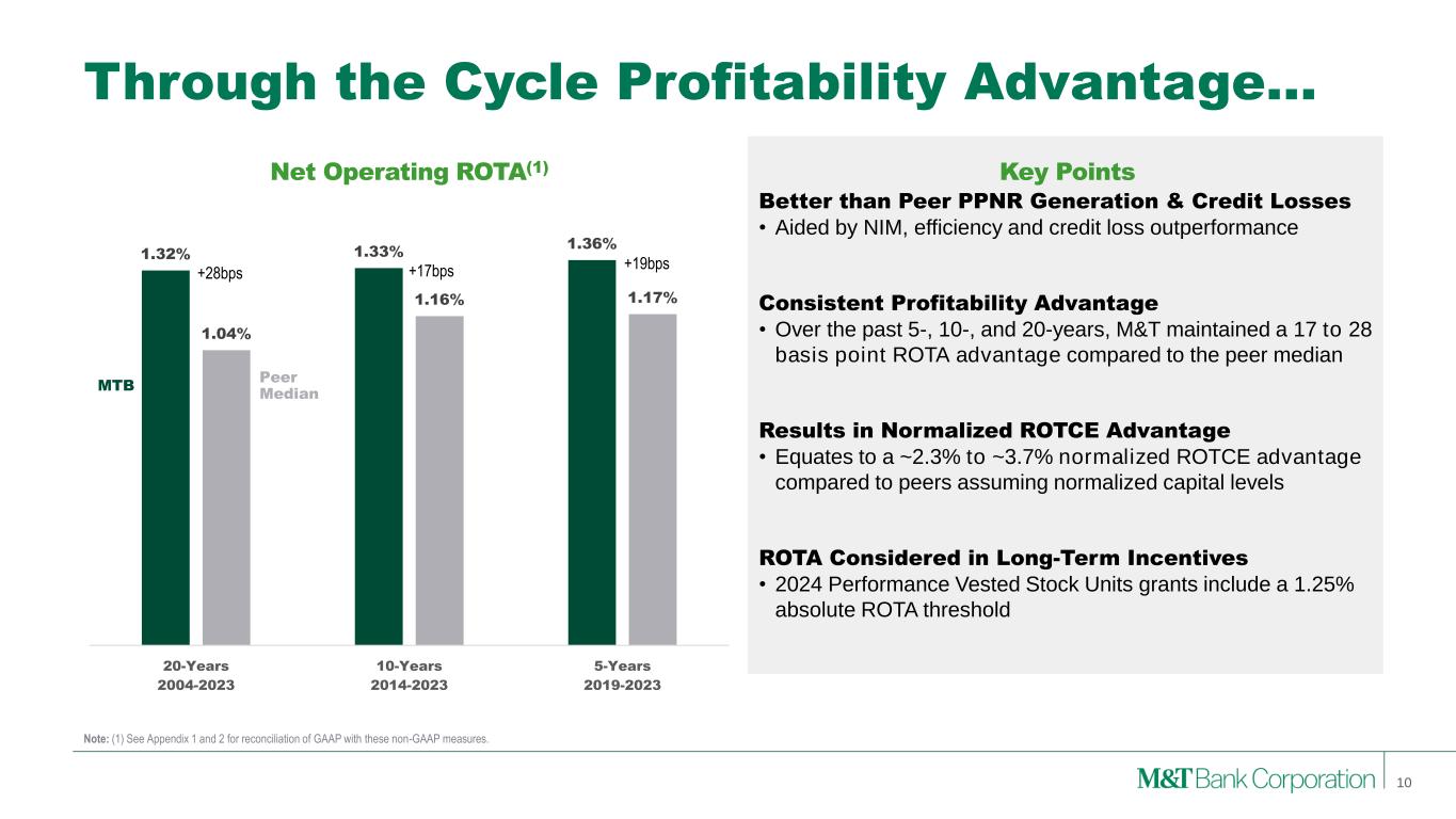 Local Scale in Key Markets 9 Source: S&P Global Market Intelligence, FDIC Summary of Deposits (1) Top banks and thrifts by number of branches in Northeast / Mid-Atlantic regions (CT, DC, DE, MA, MD, ME, NH, NJ, NY, PA, RI, VA, VT, WV). M&T as of 10/25/2024, excludes two domestic branches outside of Northeast footprint. % of Deposits in MSAs with #1 or #2 Deposit Rank Peer 1 66% Peer 2 62% Peer 3 60% MTB 59% Peer 4 57% Peer 5 53% Peer 6 45% Peer 7 43% Peer 8 39% Peer 9 37% Peer 10 34% Peer 11 10% Top Northeast Banks by Branches1 Branches 1 JPMorgan Chase & Co. 1,143 2 Bank of America Corp. 1,045 3 M&T Bank Corp. 953 4 Toronto-Dominion Bank 913 5 Citizens Financial Group 865 6 Wells Fargo & Co. 807 7 PNC Financial Services 694 8 Truist Financial Corp. 614 9 KeyCorp 416 10 Banco Santander SA​ 403 Dense Northeast network covers a geography with only a 300-mile radius but approximately 22% of U.S. population and 25% of GDP Community Banking Approach… …With Market Leading Franchises… …and Dense, Efficient Network