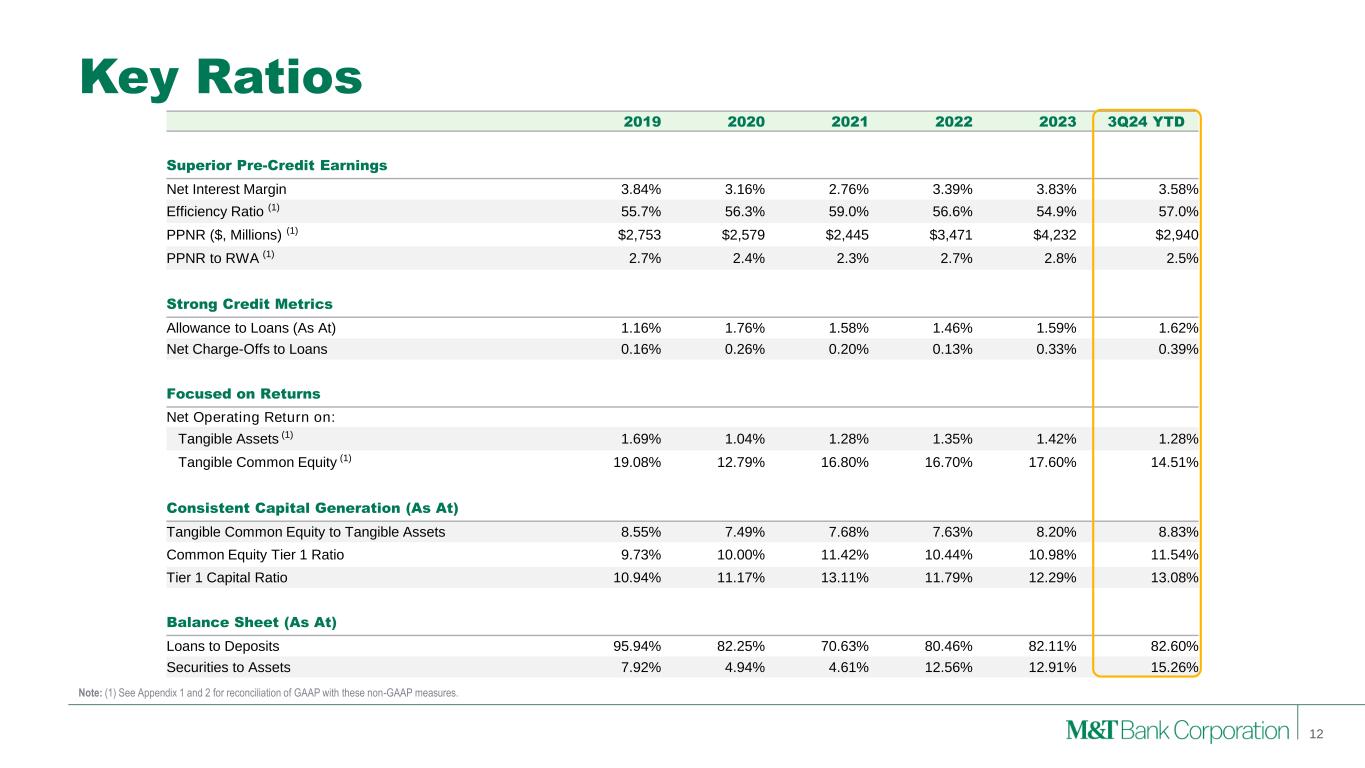 $21.97 $98.54 $- $20 $40 $60 $80 $100 $120 2003 2008 2013 2018 2023 $1.20 $5.20 $- $1 $2 $3 $4 $5 $6 2003 2008 2013 2018 2023 …Combined with Consistent Growth Dividend Per Share Tangible Book Value Per Share MTB: 7.6% CAGR Peer Median: 1.3%CAGR MTB: 7.8% CAGR Peer Median: 1.5% CAGR 10.5% 10.0% 11.9% 4.5% 7.3% 6.7% 20-Years YE03-YE23 10-Years YE13-YE23 5-Years YE18-YE23 CAGR – TBVPS Growth plus Dividends MTB Peer Median Consistently Delivering Value and Growth • Consistent dividend and TBVPS growth compared to peers • Results in higher than peer CAGR for TBVPS growth plus dividends over 5-, 10-, and 20-years Key Points 11