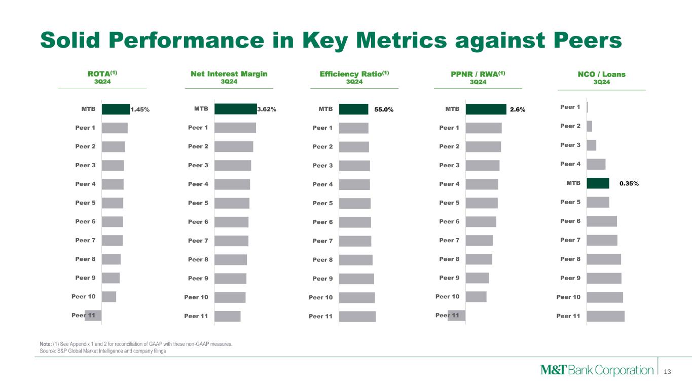2019 2020 2021 2022 2023 3Q24 YTD Superior Pre-Credit Earnings Net Interest Margin 3.84% 3.16% 2.76% 3.39% 3.83% 3.58% Efficiency Ratio (1) 55.7% 56.3% 59.0% 56.6% 54.9% 57.0% PPNR ($, Millions) (1) $2,753 $2,579 $2,445 $3,471 $4,232 $2,940 PPNR to RWA (1) 2.7% 2.4% 2.3% 2.7% 2.8% 2.5% Strong Credit Metrics Allowance to Loans (As At) 1.16% 1.76% 1.58% 1.46% 1.59% 1.62% Net Charge-Offs to Loans 0.16% 0.26% 0.20% 0.13% 0.33% 0.39% Focused on Returns Net Operating Return on: Tangible Assets (1) 1.69% 1.04% 1.28% 1.35% 1.42% 1.28% Tangible Common Equity (1) 19.08% 12.79% 16.80% 16.70% 17.60% 14.51% Consistent Capital Generation (As At) Tangible Common Equity to Tangible Assets 8.55% 7.49% 7.68% 7.63% 8.20% 8.83% Common Equity Tier 1 Ratio 9.73% 10.00% 11.42% 10.44% 10.98% 11.54% Tier 1 Capital Ratio 10.94% 11.17% 13.11% 11.79% 12.29% 13.08% Balance Sheet (As At) Loans to Deposits 95.94% 82.25% 70.63% 80.46% 82.11% 82.60% Securities to Assets 7.92% 4.94% 4.61% 12.56% 12.91% 15.26% Key Ratios 12 Note: (1) See Appendix 1 and 2 for reconciliation of GAAP with these non-GAAP measures.