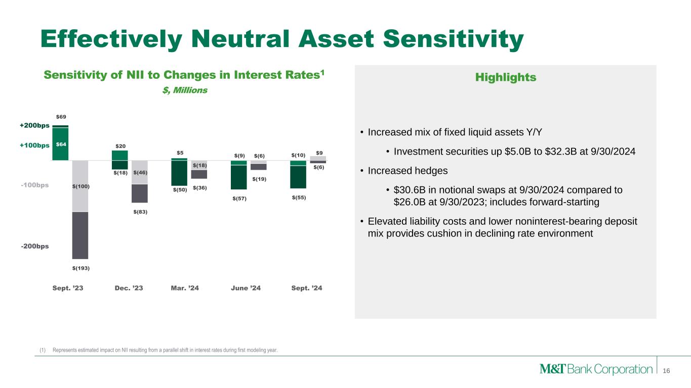 4Q24 Outlook Comments In c o m e S ta te m e n t Net Interest Income Taxable-equivalent $1,730 million +/- • NIM in the high 3.50’s – from stronger deposit growth and softer loan growth Fee Income Excluding Notable Items: $610 million +/- Including Notable Items: $625 million +/- • Continued strength in trust and mortgage • Expect ~$16 million in notable items related to securities gain on sale of non-core securities Total Expense Excluding Notable Items: $1,310 million to $1,330 million Including Notable Items: $1,355 million to $1,375 million • Continued focus on managing expense, while investing in enterprise priorities • Expect ~$46 million in notable items related to trust preferred redemption (~3 year earn back) and corporate real estate optimization Net Charge-Offs % of Average Loans ~40 basis points Tax Rate Taxable-equivalent 24.0% to 24.5% Share Repurchases $200 million Preferred Dividends ~$36 million A v e ra g e B a la n c e s Securities ~$34 billion • Reflects additional growth in securities portfolio Loans ~$135.5 billion • Sequential growth in C&I and consumer, declines in CRE Deposits Total: ~$164 billion Non Int.-Bearing: ~$46 billion • Focus on growing customer deposits 4Q24 Outlook 15