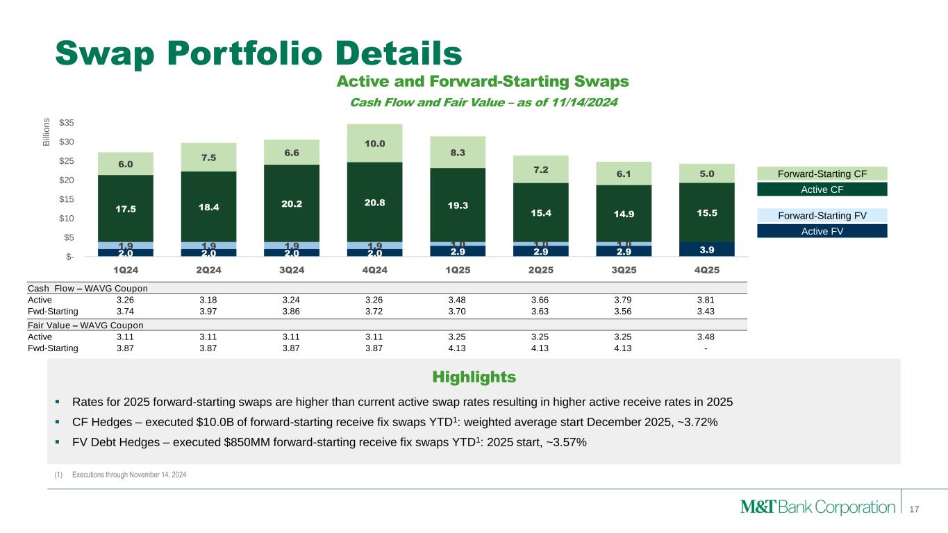 Effectively Neutral Asset Sensitivity (1) Represents estimated impact on NII resulting from a parallel shift in interest rates during first modeling year. Sensitivity of NII to Changes in Interest Rates1 $, Millions • Increased mix of fixed liquid assets Y/Y • Investment securities up $5.0B to $32.3B at 9/30/2024 • Increased hedges • $30.6B in notional swaps at 9/30/2024 compared to $26.0B at 9/30/2023; includes forward-starting • Elevated liability costs and lower noninterest-bearing deposit mix provides cushion in declining rate environment Highlights 16 +200bps +100bps -100bps -200bps Sept. ’23 Dec. ’23 Mar. ’24 June ’24 Sept. ’24 $64 $(100) $20 $(46) $5 $(18) $(9) $(6) $(10) $9 $(18) $(50) $(6) $69 $(193) $(83) $(36) $(57) $(19) $(55)