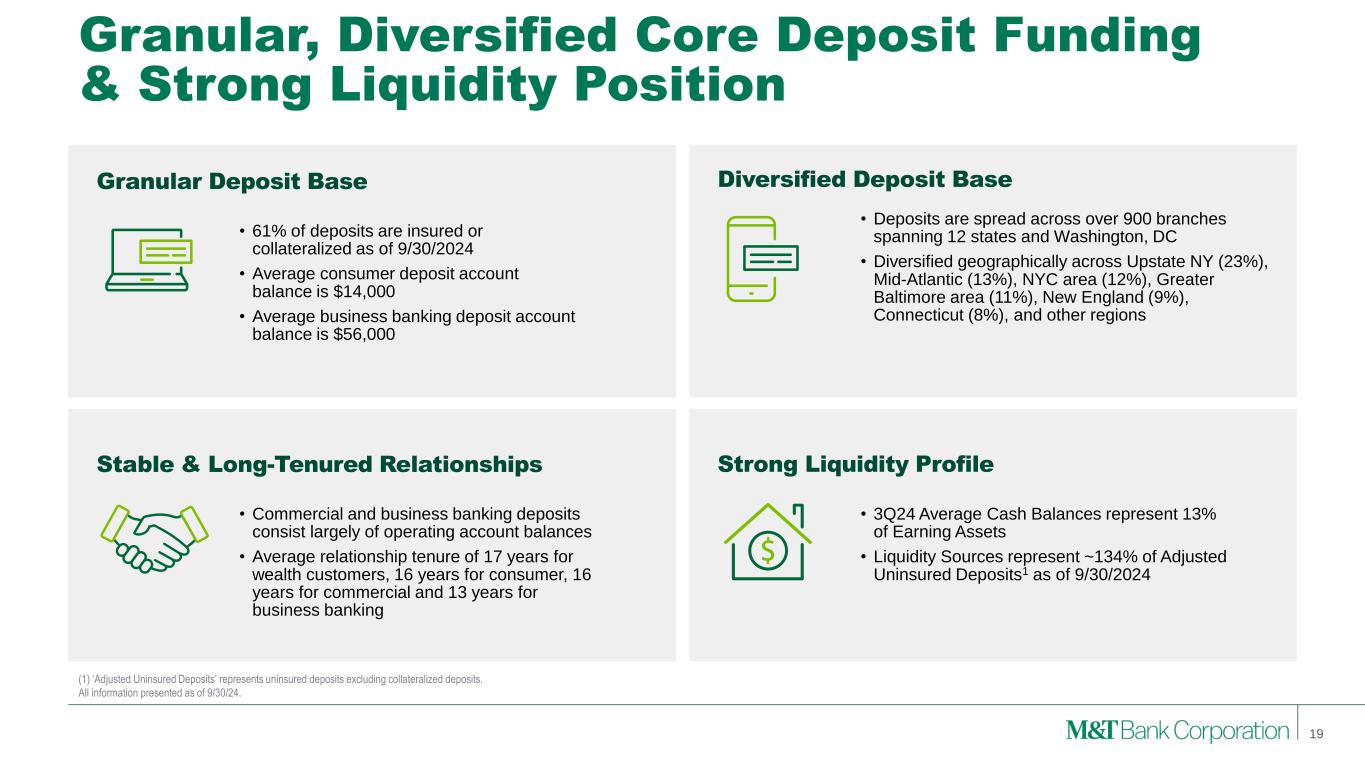 Fee Income Diversification 18 • Consistent growth in noninterest income over past year • Noninterest income growth more than offset foregone noninterest income from M&T Insurance Agency (4Q22) and Collective Investment Trust (2Q23) sales • Total noninterest income of 26% of total revenue(2) is lower than peer median through 3Q24 YTD as a result of top NIM; 30% of total revenue assuming M&T had peer median NIM Noninterest Income Mix(1) 3Q24 YTD Noninterest Income(1) Trust and Brokerage Mortgage Residential Mortgage Commercial Service Charges LOC & Credit- Related Credit Card & Merchant Other YTD24 Noninterest Income(1) $1.8B Diversified Fee Businesses Perform Across Cycles (1) Noninterest income excluding securities gains and losses. (2) Noninterest income excluding securities gains and losses. Total revenue includes taxable-equivalent NII and noninterest income excluding securities gains and losses. Peer median excludes one peer due to significant nonrecurring gains. 33% 22% 13% 5% 8% 7% 12% $560 $574 $578 $592 $608 3Q23 4Q23 1Q24 2Q24 3Q24