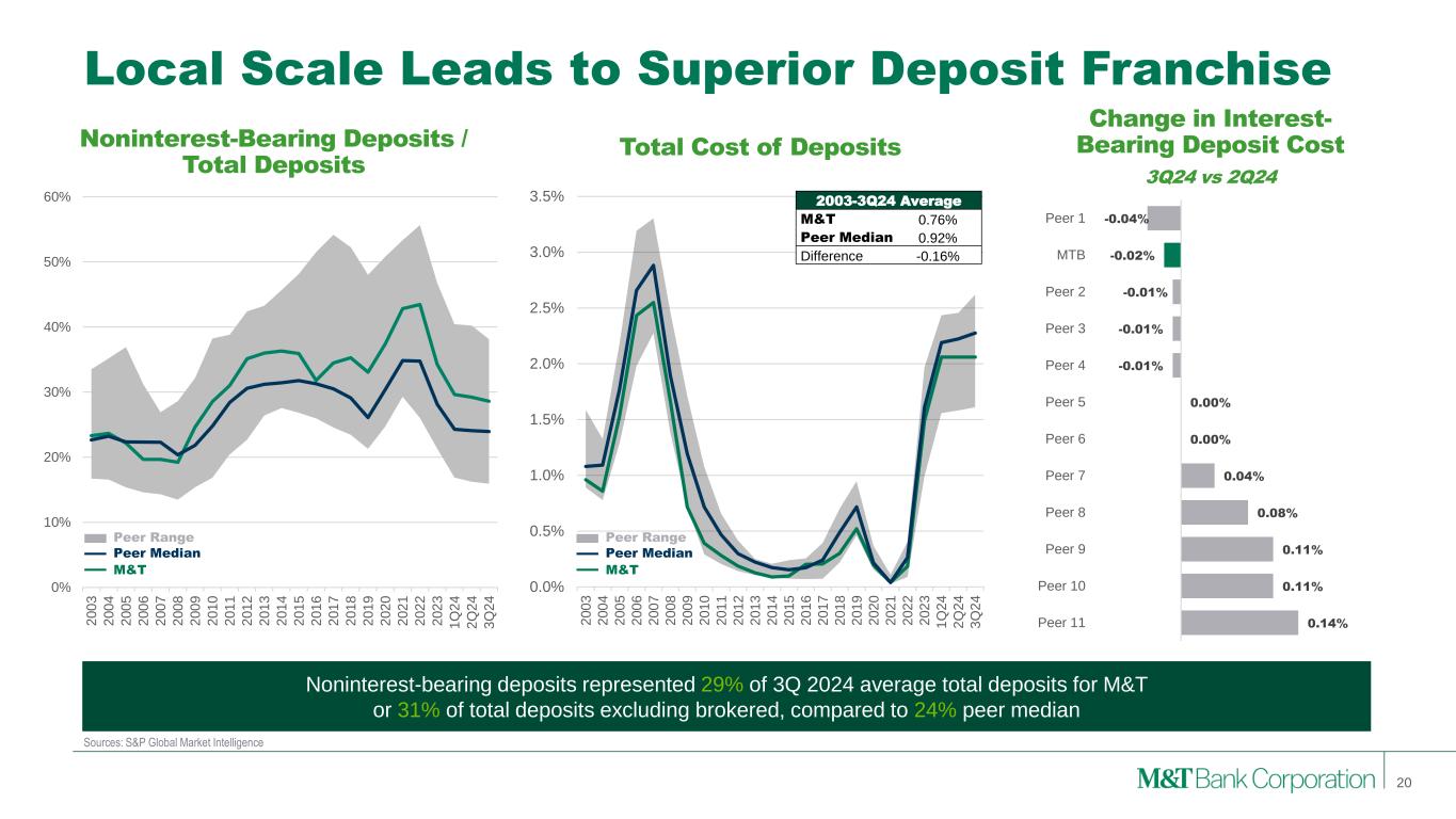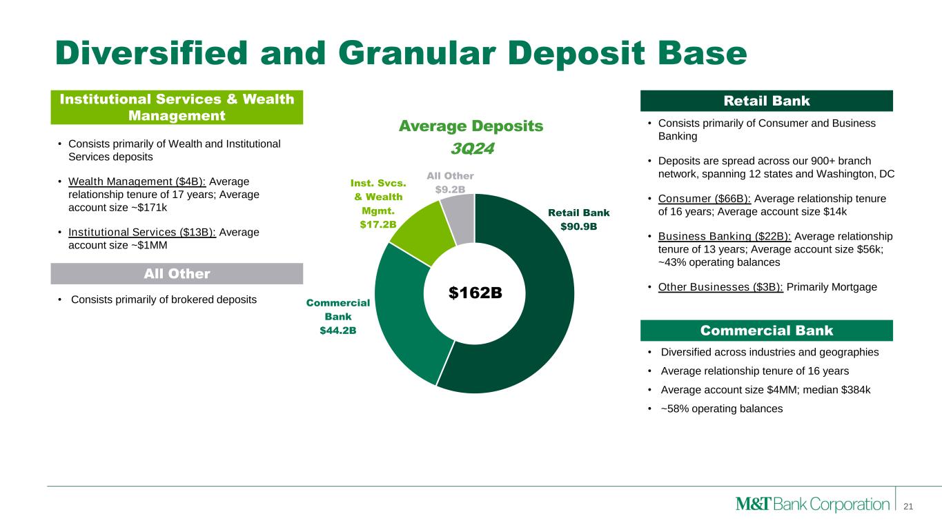 0.14% 0.11% 0.11% 0.08% 0.04% 0.00% 0.00% -0.01% -0.01% -0.01% -0.02% -0.04% Peer 11 Peer 10 Peer 9 Peer 8 Peer 7 Peer 6 Peer 5 Peer 4 Peer 3 Peer 2 MTB Peer 1 0.0% 0.5% 1.0% 1.5% 2.0% 2.5% 3.0% 3.5% 2 0 0 3 2 0 0 4 2 0 0 5 2 0 0 6 2 0 0 7 2 0 0 8 2 0 0 9 2 0 1 0 2 0 1 1 2 0 1 2 2 0 1 3 2 0 1 4 2 0 1 5 2 0 1 6 2 0 1 7 2 0 1 8 2 0 1 9 2 0 2 0 2 0 2 1 2 0 2 2 2 0 2 3 1 Q 2 4 2 Q 2 4 3 Q 2 4 0% 10% 20% 30% 40% 50% 60% 2 0 0 3 2 0 0 4 2 0 0 5 2 0 0 6 2 0 0 7 2 0 0 8 2 0 0 9 2 0 1 0 2 0 1 1 2 0 1 2 2 0 1 3 2 0 1 4 2 0 1 5 2 0 1 6 2 0 1 7 2 0 1 8 2 0 1 9 2 0 2 0 2 0 2 1 2 0 2 2 2 0 2 3 1 Q 2 4 2 Q 2 4 3 Q 2 4 Sources: S&P Global Market Intelligence Local Scale Leads to Superior Deposit Franchise Noninterest-bearing deposits represented 29% of 3Q 2024 average total deposits for M&T or 31% of total deposits excluding brokered, compared to 24% peer median 2003-3Q24 Average M&T 0.76% Peer Median 0.92% Difference -0.16% Noninterest-Bearing Deposits / Total Deposits Total Cost of Deposits 20 M&T Peer Median Peer Range Change in Interest- Bearing Deposit Cost 3Q24 vs 2Q24 M&T Peer Median Peer Range