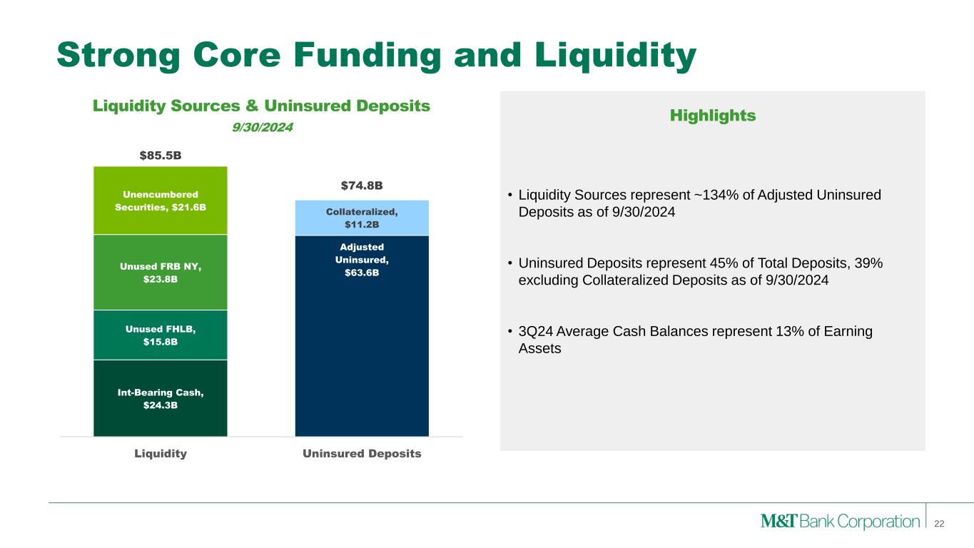 Diversified and Granular Deposit Base • Diversified across industries and geographies • Average relationship tenure of 16 years • Average account size $4MM; median $384k • ~58% operating balances Average Deposits 3Q24 Institutional Services & Wealth Management Retail Bank Commercial Bank • Consists primarily of Consumer and Business Banking • Deposits are spread across our 900+ branch network, spanning 12 states and Washington, DC • Consumer ($66B): Average relationship tenure of 16 years; Average account size $14k • Business Banking ($22B): Average relationship tenure of 13 years; Average account size $56k; ~43% operating balances • Other Businesses ($3B): Primarily Mortgage • Consists primarily of Wealth and Institutional Services deposits • Wealth Management ($4B): Average relationship tenure of 17 years; Average account size ~$171k • Institutional Services ($13B): Average account size ~$1MM 21 $162B All Other • Consists primarily of brokered deposits Retail Bank $90.9B Commercial Bank $44.2B Inst. Svcs. & Wealth Mgmt. $17.2B All Other $9.2B