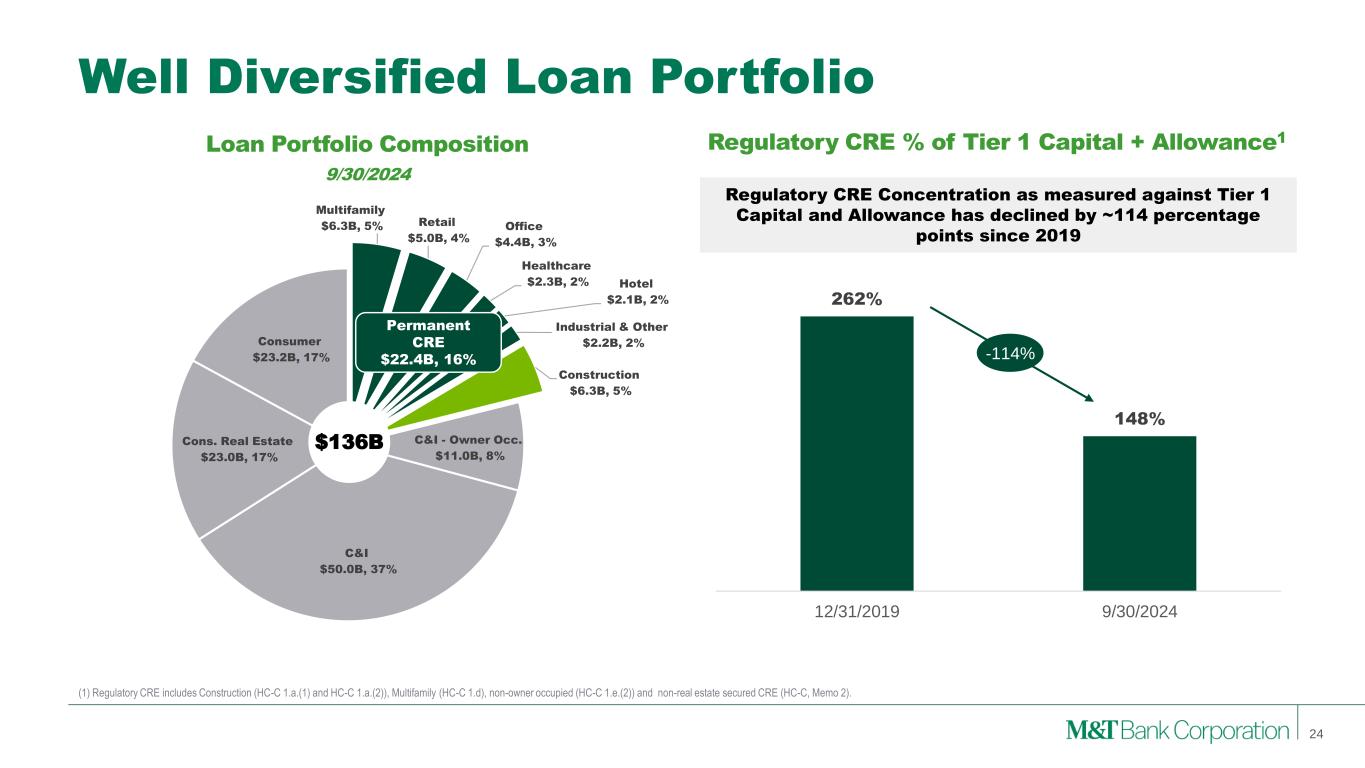 Multifamily $6.3B, 5% Retail $5.0B, 4% Office $4.4B, 3% Healthcare $2.3B, 2% Hotel $2.1B, 2% Industrial & Other $2.2B, 2% Construction $6.3B, 5% C&I - Owner Occ. $11.0B, 8% C&I $50.0B, 37% Cons. Real Estate $23.0B, 17% Consumer $23.2B, 17% Permanent CRE $22.4B, 16% Well Diversified Loan Portfolio (1) Regulatory CRE includes Construction (HC-C 1.a.(1) and HC-C 1.a.(2)), Multifamily (HC-C 1.d), non-owner occupied (HC-C 1.e.(2)) and non-real estate secured CRE (HC-C, Memo 2). Loan Portfolio Composition 9/30/2024 Regulatory CRE % of Tier 1 Capital + Allowance1 Regulatory CRE Concentration as measured against Tier 1 Capital and Allowance has declined by ~114 percentage points since 2019 $136B 24 262% 148% 12/31/2019 9/30/2024 -114%