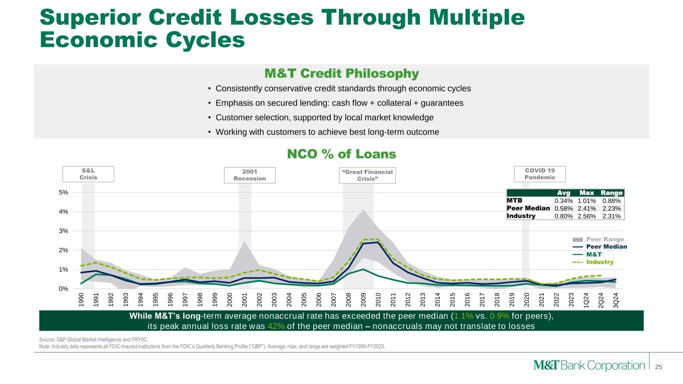 Source: S&P Global Market Intelligence and FRY9C. Note: Industry data represents all FDIC-insured institutions from the FDIC’s Quarterly Banking Profile (“QBP”). Average, max, and range are weighted FY1990-FY2023. Superior Credit Losses Through Multiple Economic Cycles M&T Credit Philosophy NCO % of Loans • Consistently conservative credit standards through economic cycles • Emphasis on secured lending: cash flow + collateral + guarantees • Customer selection, supported by local market knowledge • Working with customers to achieve best long-term outcome “Great Financial Crisis” 2001 Recession S&L Crisis While M&T’s long-term average nonaccrual rate has exceeded the peer median (1.1% vs. 0.9% for peers), its peak annual loss rate was 42% of the peer median – nonaccruals may not translate to losses 25 COVID 19 Pandemic 0% 1% 2% 3% 4% 5% 1 9 9 0 1 9 9 1 1 9 9 2 1 9 9 3 1 9 9 4 1 9 9 5 1 9 9 6 1 9 9 7 1 9 9 8 1 9 9 9 2 0 0 0 2 0 0 1 2 0 0 2 2 0 0 3 2 0 0 4 2 0 0 5 2 0 0 6 2 0 0 7 2 0 0 8 2 0 0 9 2 0 1 0 2 0 1 1 2 0 1 2 2 0 1 3 2 0 1 4 2 0 1 5 2 0 1 6 2 0 1 7 2 0 1 8 2 0 1 9 2 0 2 0 2 0 2 1 2 0 2 2 2 0 2 3 1 Q 2 4 2 Q 2 4 3 Q 2 4 Avg Max Range MTB 0.34% 1.01% 0.88% Peer Median 0.58% 2.41% 2.23% Industry 0.80% 2.56% 2.31% M&T Peer Median Peer Range Industry