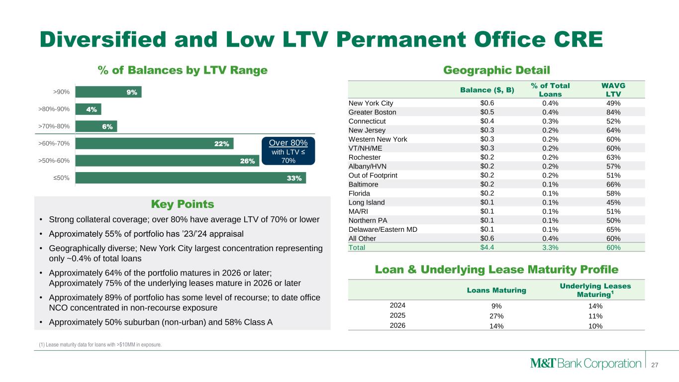 Spotlight on Permanent IRE • Hallmark of structures requires material upfront ‘skin in the game’ to ensure alignment and provide a buffer against potential future losses • Weighted-average LTV is 55%; approximately 85% of the total Permanent IRE portfolio has an LTV of 70% or less • Approximately 72% of the Permanent IRE portfolio is fixed rate, inclusive of customer implemented swaps • The risk from a decline in commercial real estate values is likely to play out over a long period of time • Approximately 66% of the permanent investor-owned portfolio matures in 2026 or later • Total NYC Permanent Multifamily of $1.1B or <1% of total loans with WAVG LTV of 55% • Value declines in recent appraisals (2023/2024) compared to prior appraisals (2022 or earlier) are -7% for total CRE with larger declines for retail (-11%), and office (-15%) % of Loans Maturing Balance ($, B) WAVG LTV 2024 2025 2026 Multifamily $6.3 56% 7% 24% 13% Retail $5.0 52% 7% 21% 18% Office $4.4 60% 9% 27% 14% Healthcare $2.3 56% 17% 31% 19% Hotel $2.1 50% 18% 33% 17% Industrial $1.9 51% 4% 22% 15% Other $0.3 67% 6% 15% 27% Permanent $22.4 55% 9% 25% 16% Permanent IRE Details 9/30/2024 Key Points 26