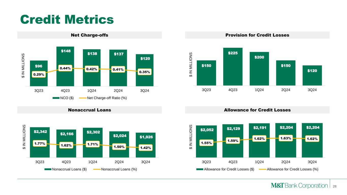 Diversified and Low LTV Permanent Office CRE (1) Lease maturity data for loans with >$10MM in exposure. Balance ($, B) % of Total Loans WAVG LTV New York City $0.6 0.4% 49% Greater Boston $0.5 0.4% 84% Connecticut $0.4 0.3% 52% New Jersey $0.3 0.2% 64% Western New York $0.3 0.2% 60% VT/NH/ME $0.3 0.2% 60% Rochester $0.2 0.2% 63% Albany/HVN $0.2 0.2% 57% Out of Footprint $0.2 0.2% 51% Baltimore $0.2 0.1% 66% Florida $0.2 0.1% 58% Long Island $0.1 0.1% 45% MA/RI $0.1 0.1% 51% Northern PA $0.1 0.1% 50% Delaware/Eastern MD $0.1 0.1% 65% All Other $0.6 0.4% 60% Total $4.4 3.3% 60% Loans Maturing Underlying Leases Maturing1 2024 9% 14% 2025 27% 11% 2026 14% 10% • Strong collateral coverage; over 80% have average LTV of 70% or lower • Approximately 55% of portfolio has ’23/’24 appraisal • Geographically diverse; New York City largest concentration representing only ~0.4% of total loans • Approximately 64% of the portfolio matures in 2026 or later; Approximately 75% of the underlying leases mature in 2026 or later • Approximately 89% of portfolio has some level of recourse; to date office NCO concentrated in non-recourse exposure • Approximately 50% suburban (non-urban) and 58% Class A % of Balances by LTV Range Key Points Loan & Underlying Lease Maturity Profile Geographic Detail Over 80% with LTV ≤ 70% 27 33% 26% 22% 6% 4% 9% ≤50% >50%-60% >60%-70% >70%-80% >80%-90% >90%