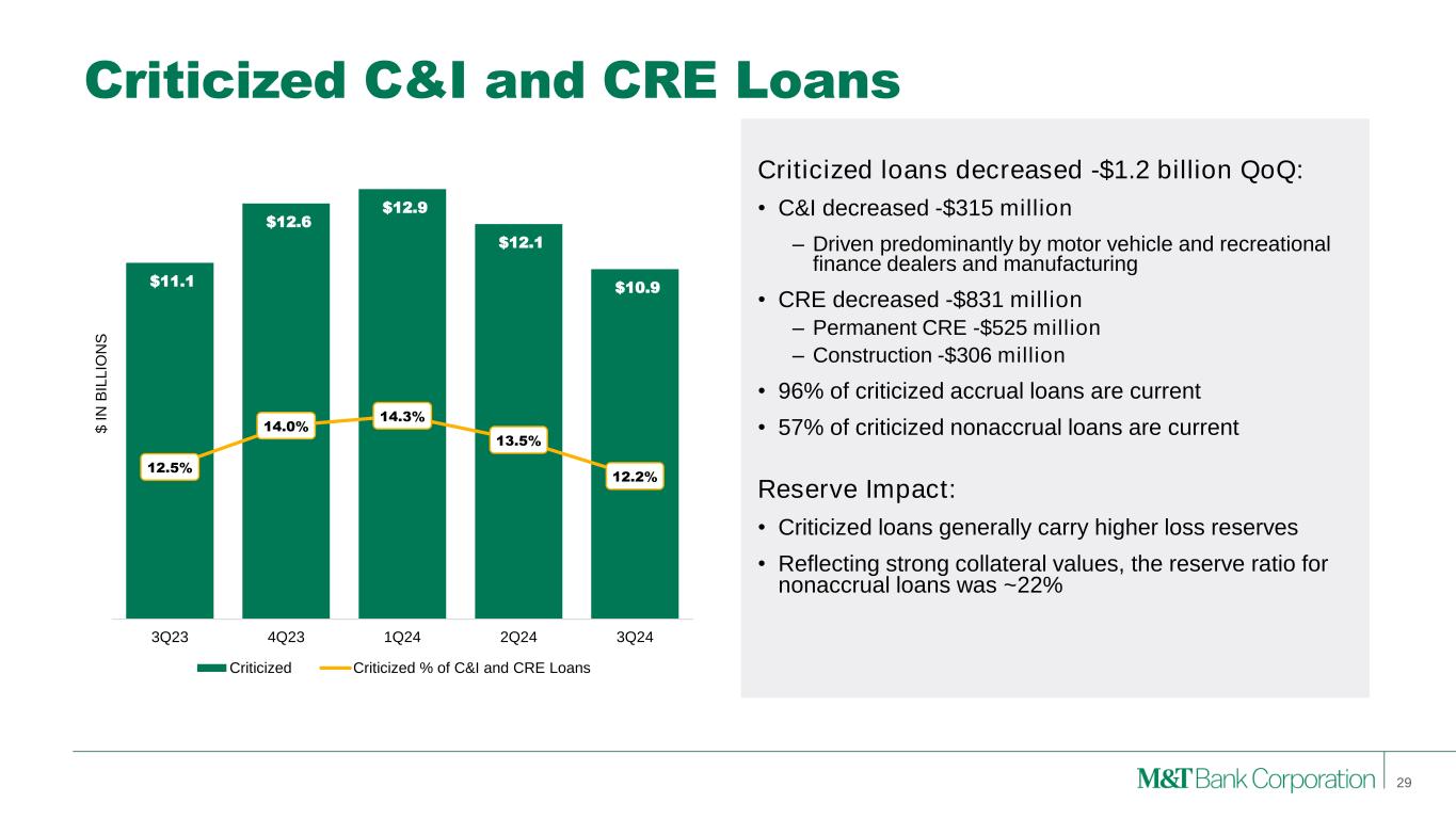 Credit Metrics Nonaccrual Loans Net Charge-offs Provision for Credit Losses Allowance for Credit Losses 28 $150 $225 $200 $150 $120 3Q23 4Q23 1Q24 2Q24 3Q24 $ I N M IL L IO N S $96 $148 $138 $137 $120 0.29% 0.44% 0.42% 0.41% 0.35% 3Q23 4Q23 1Q24 2Q24 3Q24 $ I N M IL L IO N S NCO ($) Net Charge-off Ratio (%) $2,342 $2,166 $2,302 $2,024 $1,926 1.77% 1.62% 1.71% 1.50% 1.42% 3Q23 4Q23 1Q24 2Q24 3Q24 $ I N M IL L IO N S Nonaccrual Loans ($) Nonaccrual Loans (%) $2,052 $2,129 $2,191 $2,204 $2,204 1.55% 1.59% 1.62% 1.63% 1.62% 3Q23 4Q23 1Q24 2Q24 3Q24 $ I N M IL L IO N S Allowance for Credit Losses ($) Allowance for Credit Losses (%)