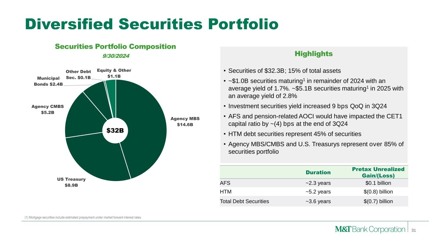 Agency MBS $14.6B US Treasury $8.9B Agency CMBS $5.2B Municipal Bonds $2.4B Other Debt Sec. $0.1B Equity & Other $1.1B Diversified Securities Portfolio (1) Mortgage securities include estimated prepayment under market forward interest rates. $32B Securities Portfolio Composition 9/30/2024 • Securities of $32.3B; 15% of total assets • ~$1.0B securities maturing1 in remainder of 2024 with an average yield of 1.7%. ~$5.1B securities maturing1 in 2025 with an average yield of 2.8% • Investment securities yield increased 9 bps QoQ in 3Q24 • AFS and pension-related AOCI would have impacted the CET1 capital ratio by ~(4) bps at the end of 3Q24 • HTM debt securities represent 45% of securities • Agency MBS/CMBS and U.S. Treasurys represent over 85% of securities portfolio Duration Pretax Unrealized Gain/(Loss) AFS ~2.3 years $0.1 billion HTM ~5.2 years $(0.8) billion Total Debt Securities ~3.6 years $(0.7) billion Highlights 31