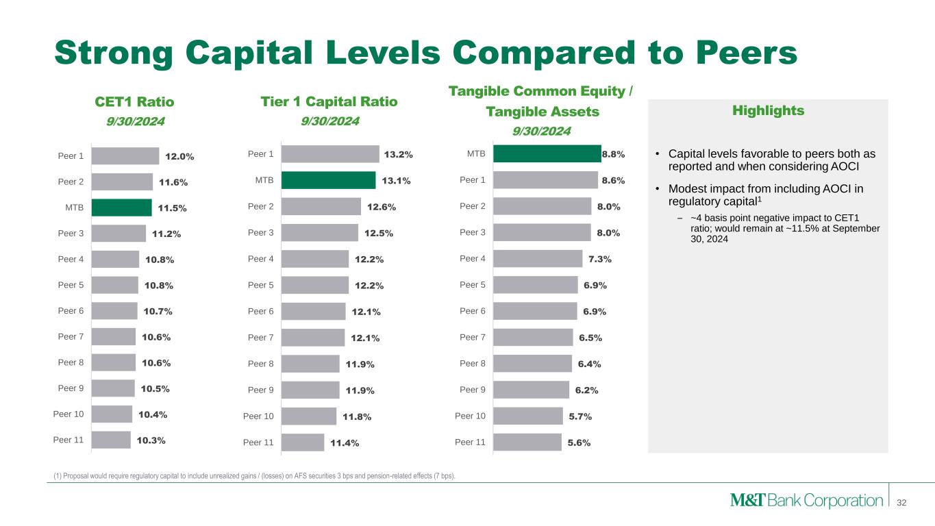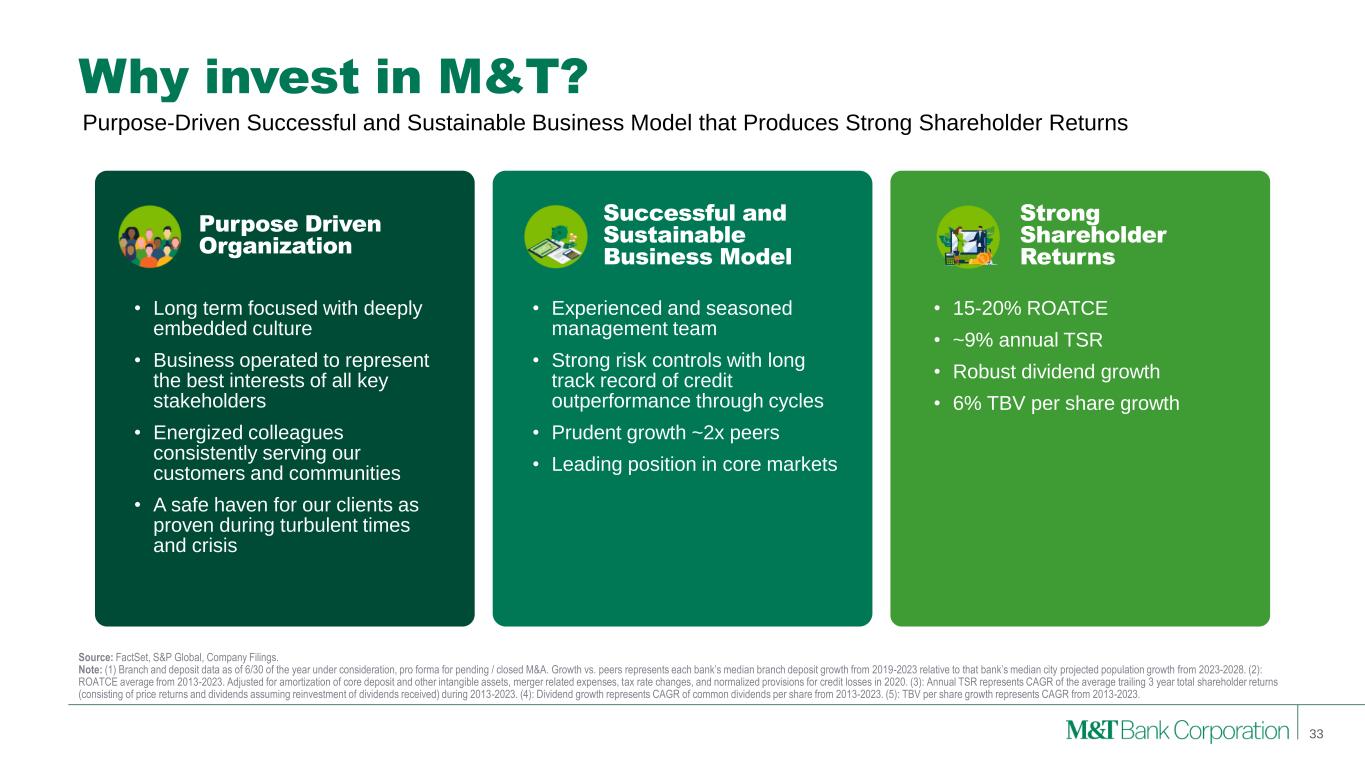 5.6% 5.7% 6.2% 6.4% 6.5% 6.9% 6.9% 7.3% 8.0% 8.0% 8.6% 8.8% Peer 11 Peer 10 Peer 9 Peer 8 Peer 7 Peer 6 Peer 5 Peer 4 Peer 3 Peer 2 Peer 1 MTB Strong Capital Levels Compared to Peers • Capital levels favorable to peers both as reported and when considering AOCI • Modest impact from including AOCI in regulatory capital1 – ~4 basis point negative impact to CET1 ratio; would remain at ~11.5% at September 30, 2024 (1) Proposal would require regulatory capital to include unrealized gains / (losses) on AFS securities 3 bps and pension-related effects (7 bps). CET1 Ratio 9/30/2024 Tangible Common Equity / Tangible Assets 9/30/2024 Highlights 32 Tier 1 Capital Ratio 9/30/2024 10.3% 10.4% 10.5% 10.6% 10.6% 10.7% 10.8% 10.8% 11.2% 11.5% 11.6% 12.0% Peer 11 Peer 10 Peer 9 Peer 8 Peer 7 Peer 6 Peer 5 Peer 4 Peer 3 MTB Peer 2 Peer 1 11.4% 11.8% 11.9% 11.9% 12.1% 12.1% 12.2% 12.2% 12.5% 12.6% 13.1% 13.2% Peer 11 Peer 10 Peer 9 Peer 8 Peer 7 Peer 6 Peer 5 Peer 4 Peer 3 Peer 2 MTB Peer 1