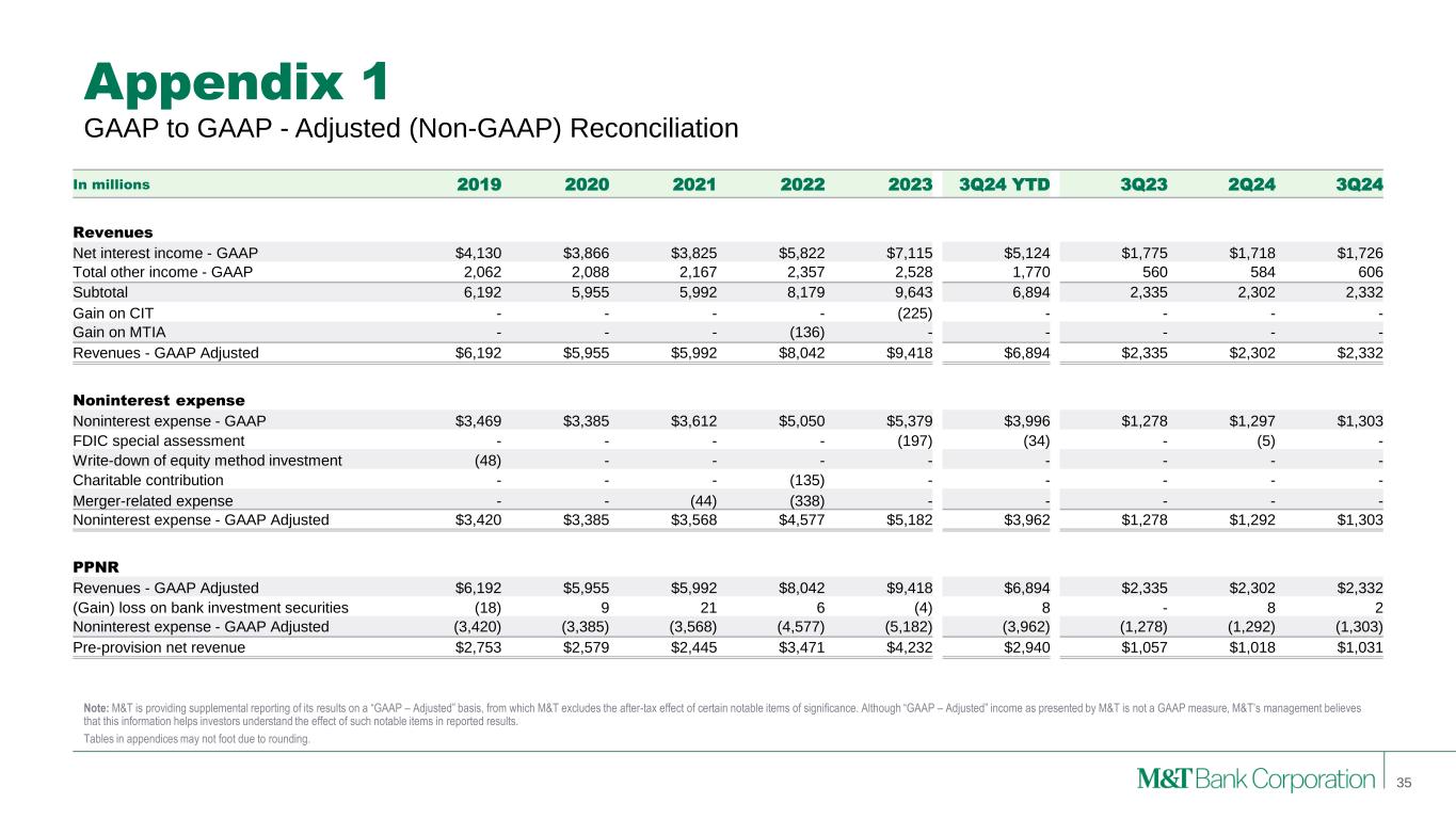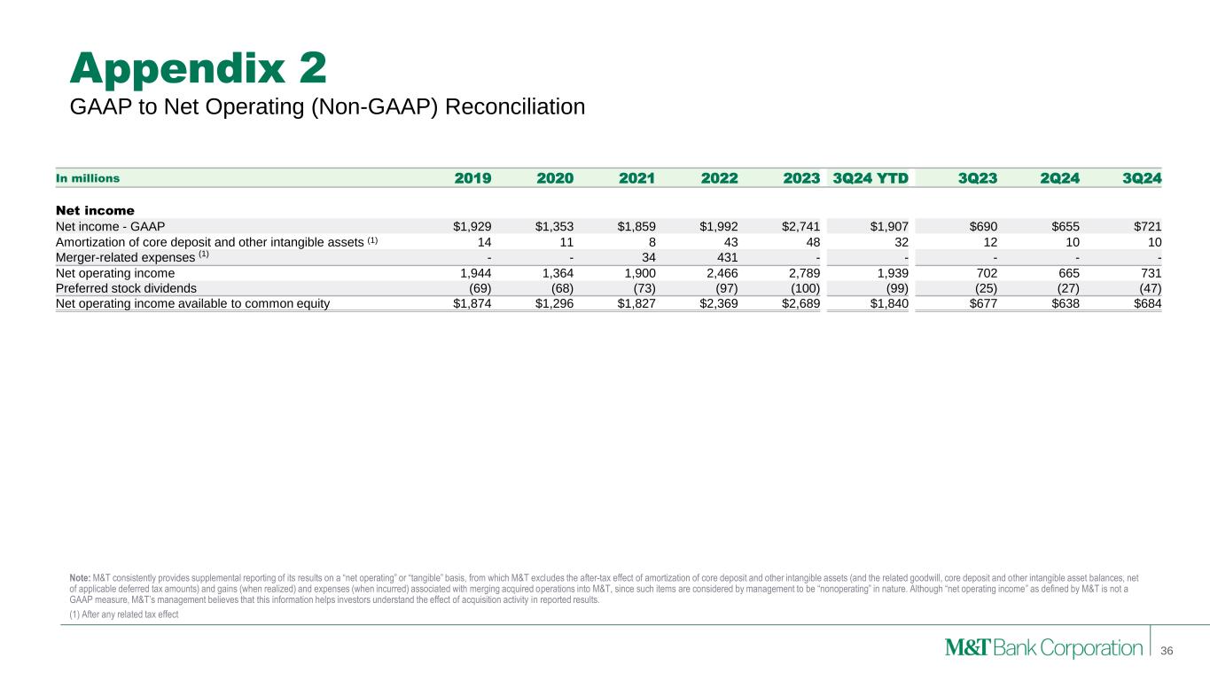 Appendix 1 Note: M&T is providing supplemental reporting of its results on a “GAAP – Adjusted” basis, from which M&T excludes the after-tax effect of certain notable items of significance. Although “GAAP – Adjusted” income as presented by M&T is not a GAAP measure, M&T’s management believes that this information helps investors understand the effect of such notable items in reported results. Tables in appendices may not foot due to rounding. GAAP to GAAP - Adjusted (Non-GAAP) Reconciliation 35 In millions 2019 2020 2021 2022 2023 3Q24 YTD 3Q23 2Q24 3Q24 Revenues Net interest income - GAAP $4,130 $3,866 $3,825 $5,822 $7,115 $5,124 $1,775 $1,718 $1,726 Total other income - GAAP 2,062 2,088 2,167 2,357 2,528 1,770 560 584 606 Subtotal 6,192 5,955 5,992 8,179 9,643 6,894 2,335 2,302 2,332 Gain on CIT - - - - (225) - - - - Gain on MTIA - - - (136) - - - - - Revenues - GAAP Adjusted $6,192 $5,955 $5,992 $8,042 $9,418 $6,894 $2,335 $2,302 $2,332 Noninterest expense Noninterest expense - GAAP $3,469 $3,385 $3,612 $5,050 $5,379 $3,996 $1,278 $1,297 $1,303 FDIC special assessment - - - - (197) (34) - (5) - Write-down of equity method investment (48) - - - - - - - - Charitable contribution - - - (135) - - - - - Merger-related expense - - (44) (338) - - - - - Noninterest expense - GAAP Adjusted $3,420 $3,385 $3,568 $4,577 $5,182 $3,962 $1,278 $1,292 $1,303 PPNR Revenues - GAAP Adjusted $6,192 $5,955 $5,992 $8,042 $9,418 $6,894 $2,335 $2,302 $2,332 (Gain) loss on bank investment securities (18) 9 21 6 (4) 8 - 8 2 Noninterest expense - GAAP Adjusted (3,420) (3,385) (3,568) (4,577) (5,182) (3,962) (1,278) (1,292) (1,303) Pre-provision net revenue $2,753 $2,579 $2,445 $3,471 $4,232 $2,940 $1,057 $1,018 $1,031
