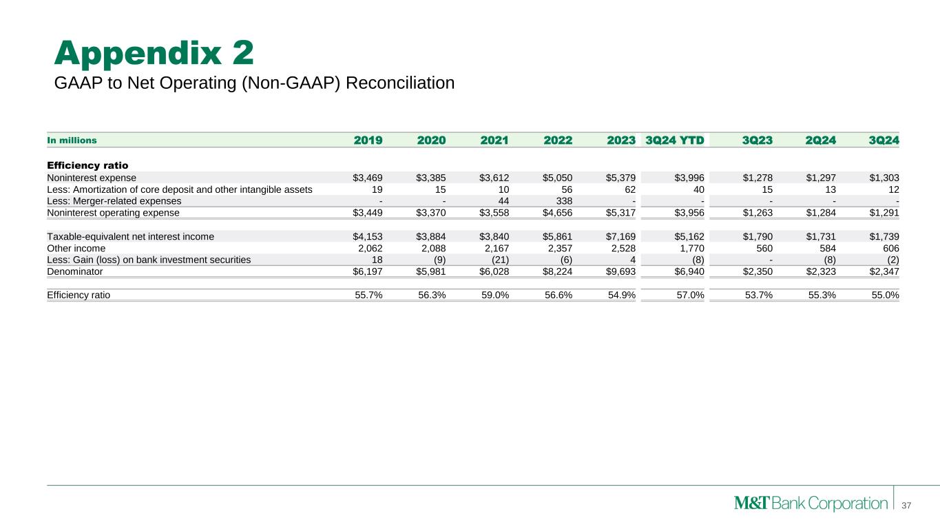 Appendix 2 Note: M&T consistently provides supplemental reporting of its results on a “net operating” or “tangible” basis, from which M&T excludes the after-tax effect of amortization of core deposit and other intangible assets (and the related goodwill, core deposit and other intangible asset balances, net of applicable deferred tax amounts) and gains (when realized) and expenses (when incurred) associated with merging acquired operations into M&T, since such items are considered by management to be “nonoperating” in nature. Although “net operating income” as defined by M&T is not a GAAP measure, M&T’s management believes that this information helps investors understand the effect of acquisition activity in reported results. (1) After any related tax effect 36 GAAP to Net Operating (Non-GAAP) Reconciliation In millions 2019 2020 2021 2022 2023 3Q24 YTD 3Q23 2Q24 3Q24 Net income Net income - GAAP $1,929 $1,353 $1,859 $1,992 $2,741 $1,907 $690 $655 $721 Amortization of core deposit and other intangible assets (1) 14 11 8 43 48 32 12 10 10 Merger-related expenses (1) - - 34 431 - - - - - Net operating income 1,944 1,364 1,900 2,466 2,789 1,939 702 665 731 Preferred stock dividends (69) (68) (73) (97) (100) (99) (25) (27) (47) Net operating income available to common equity $1,874 $1,296 $1,827 $2,369 $2,689 $1,840 $677 $638 $684