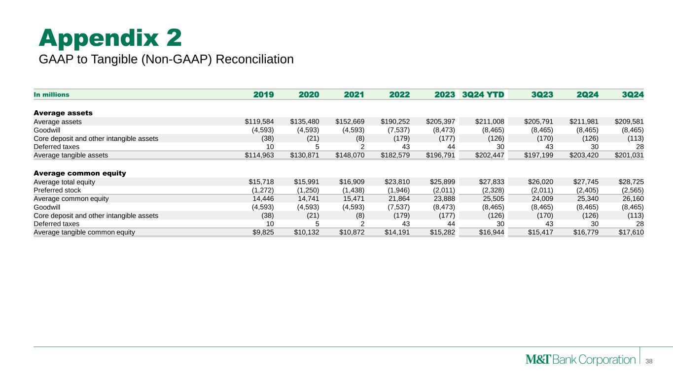 Appendix 2 GAAP to Net Operating (Non-GAAP) Reconciliation 37 In millions 2019 2020 2021 2022 2023 3Q24 YTD 3Q23 2Q24 3Q24 Efficiency ratio Noninterest expense $3,469 $3,385 $3,612 $5,050 $5,379 $3,996 $1,278 $1,297 $1,303 Less: Amortization of core deposit and other intangible assets 19 15 10 56 62 40 15 13 12 Less: Merger-related expenses - - 44 338 - - - - - Noninterest operating expense $3,449 $3,370 $3,558 $4,656 $5,317 $3,956 $1,263 $1,284 $1,291 Taxable-equivalent net interest income $4,153 $3,884 $3,840 $5,861 $7,169 $5,162 $1,790 $1,731 $1,739 Other income 2,062 2,088 2,167 2,357 2,528 1,770 560 584 606 Less: Gain (loss) on bank investment securities 18 (9) (21) (6) 4 (8) - (8) (2) Denominator $6,197 $5,981 $6,028 $8,224 $9,693 $6,940 $2,350 $2,323 $2,347 Efficiency ratio 55.7% 56.3% 59.0% 56.6% 54.9% 57.0% 53.7% 55.3% 55.0%