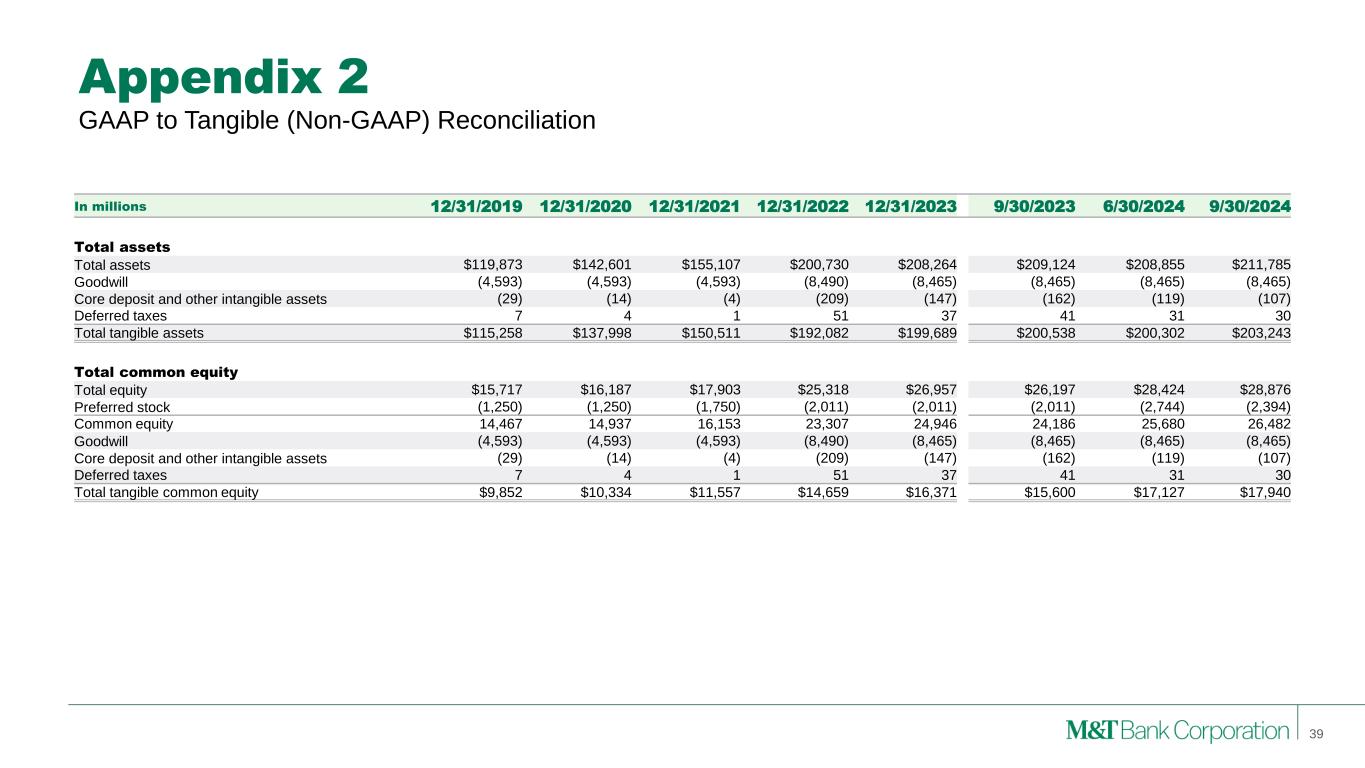 Appendix 2 GAAP to Tangible (Non-GAAP) Reconciliation 38 In millions 2019 2020 2021 2022 2023 3Q24 YTD 3Q23 2Q24 3Q24 Average assets Average assets $119,584 $135,480 $152,669 $190,252 $205,397 $211,008 $205,791 $211,981 $209,581 Goodwill (4,593) (4,593) (4,593) (7,537) (8,473) (8,465) (8,465) (8,465) (8,465) Core deposit and other intangible assets (38) (21) (8) (179) (177) (126) (170) (126) (113) Deferred taxes 10 5 2 43 44 30 43 30 28 Average tangible assets $114,963 $130,871 $148,070 $182,579 $196,791 $202,447 $197,199 $203,420 $201,031 Average common equity Average total equity $15,718 $15,991 $16,909 $23,810 $25,899 $27,833 $26,020 $27,745 $28,725 Preferred stock (1,272) (1,250) (1,438) (1,946) (2,011) (2,328) (2,011) (2,405) (2,565) Average common equity 14,446 14,741 15,471 21,864 23,888 25,505 24,009 25,340 26,160 Goodwill (4,593) (4,593) (4,593) (7,537) (8,473) (8,465) (8,465) (8,465) (8,465) Core deposit and other intangible assets (38) (21) (8) (179) (177) (126) (170) (126) (113) Deferred taxes 10 5 2 43 44 30 43 30 28 Average tangible common equity $9,825 $10,132 $10,872 $14,191 $15,282 $16,944 $15,417 $16,779 $17,610