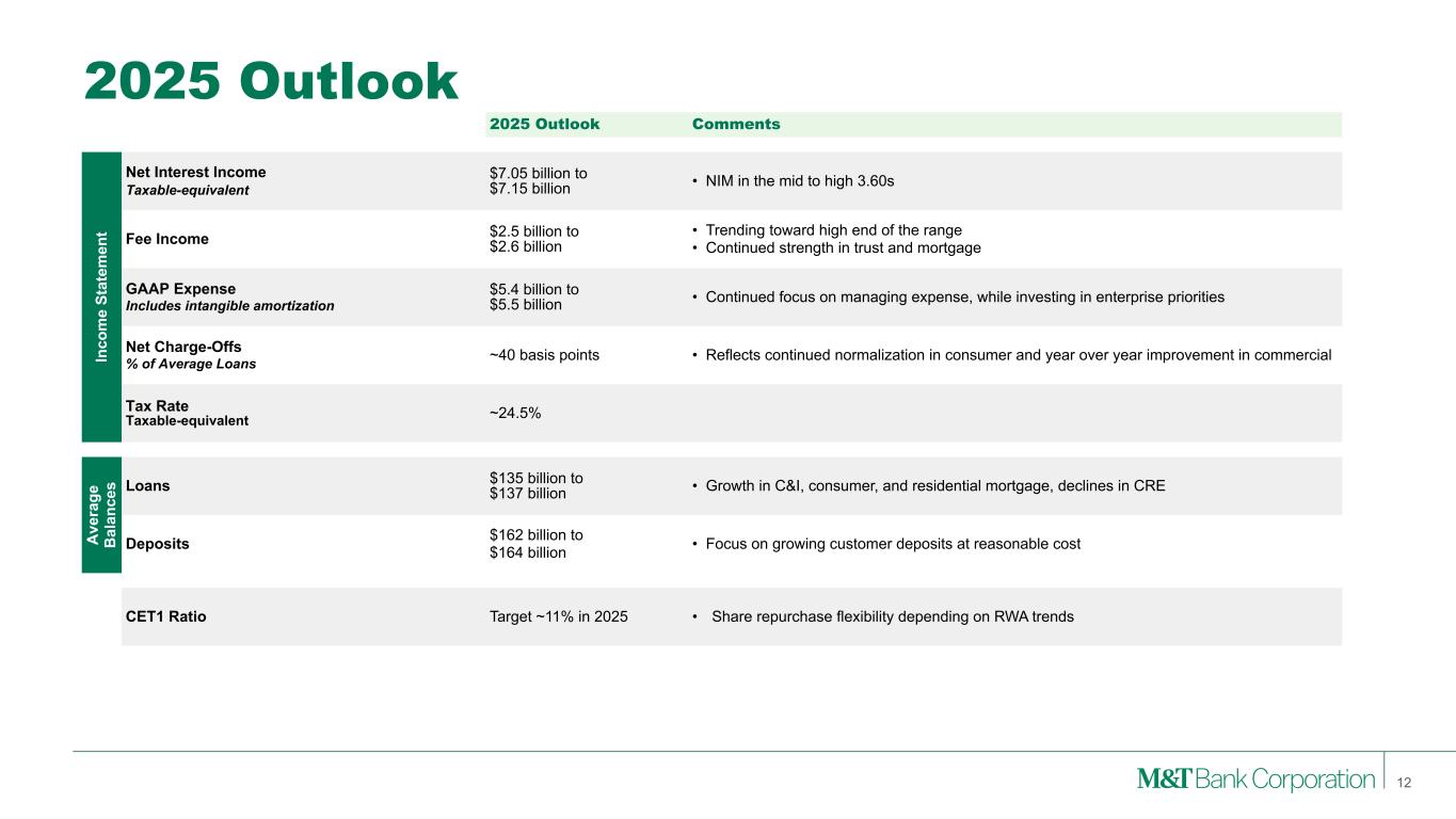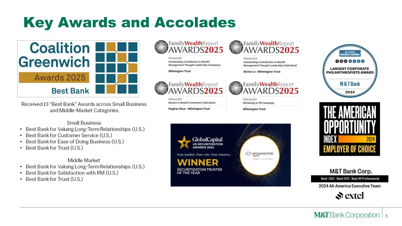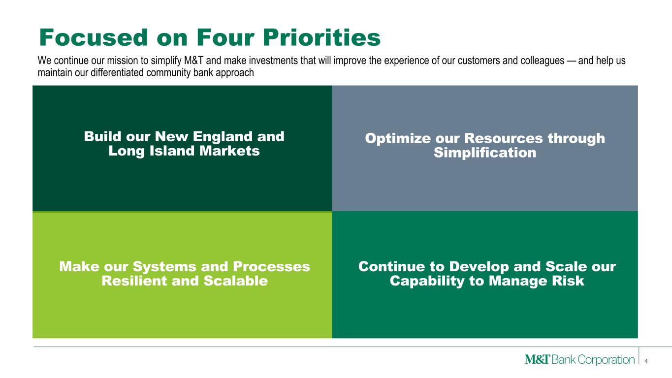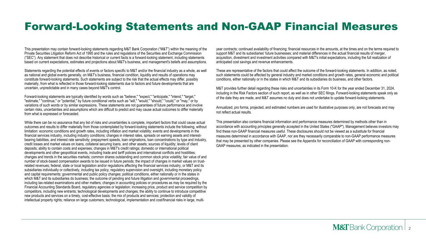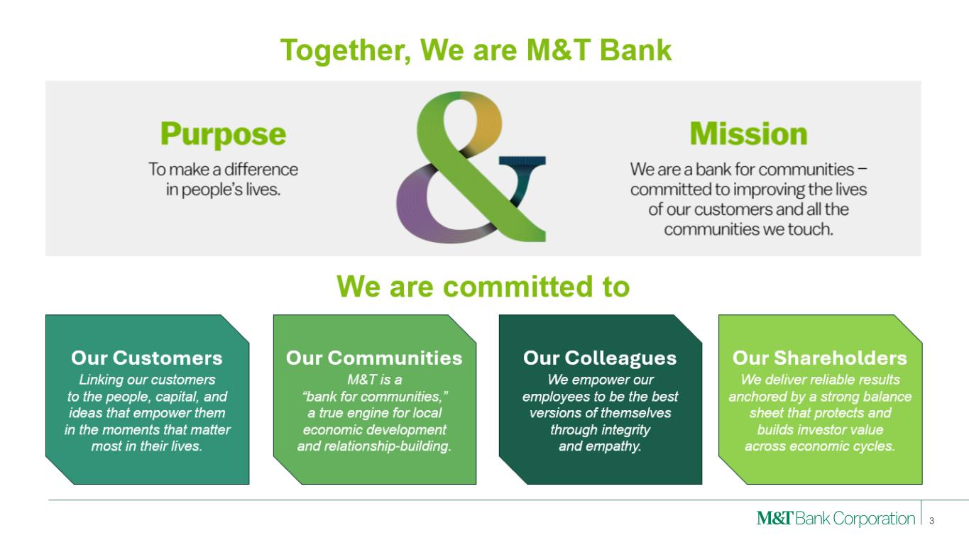 Forward-Looking Statements and Non-GAAP Financial Measures This presentation may contain forward-looking statements regarding M&T Bank Corporation (“M&T”) within the meaning of the Private Securities Litigation Reform Act of 1995 and the rules and regulations of the Securities and Exchange Commission (“SEC”). Any statement that does not describe historical or current facts is a forward-looking statement, including statements based on current expectations, estimates and projections about M&T's business, and management's beliefs and assumptions. Statements regarding the potential effects of events or factors specific to M&T and/or the financial industry as a whole, as well as national and global events generally, on M&T's business, financial condition, liquidity and results of operations may constitute forward-looking statements. Such statements are subject to the risk that the actual effects may differ, possibly materially, from what is reflected in those forward-looking statements due to factors and future developments that are uncertain, unpredictable and in many cases beyond M&T's control. Forward-looking statements are typically identified by words such as "believe," "expect," "anticipate," "intend," "target," "estimate," "continue," or "potential," by future conditional verbs such as "will," "would," "should," "could," or "may," or by variations of such words or by similar expressions. These statements are not guarantees of future performance and involve certain risks, uncertainties and assumptions which are difficult to predict and may cause actual outcomes to differ materially from what is expressed or forecasted. While there can be no assurance that any list of risks and uncertainties is complete, important factors that could cause actual outcomes and results to differ materially from those contemplated by forward-looking statements include the following, without limitation: economic conditions and growth rates, including inflation and market volatility; events and developments in the financial services industry, including industry conditions; changes in interest rates, spreads on earning assets and interest- bearing liabilities, and interest rate sensitivity; prepayment speeds, loan originations, loan concentrations by type and industry, credit losses and market values on loans, collateral securing loans, and other assets; sources of liquidity; levels of client deposits; ability to contain costs and expenses; changes in M&T's credit ratings; domestic or international political developments and other geopolitical events, including trade and tariff policies and international conflicts and hostilities; changes and trends in the securities markets; common shares outstanding and common stock price volatility; fair value of and number of stock-based compensation awards to be issued in future periods; the impact of changes in market values on trust- related revenues; federal, state or local legislation and/or regulations affecting the financial services industry, or M&T and its subsidiaries individually or collectively, including tax policy; regulatory supervision and oversight, including monetary policy and capital requirements; governmental and public policy changes; political conditions, either nationally or in the states in which M&T and its subsidiaries do business; the outcome of pending and future litigation and governmental proceedings, including tax-related examinations and other matters; changes in accounting policies or procedures as may be required by the Financial Accounting Standards Board, regulatory agencies or legislation; increasing price, product and service competition by competitors, including new entrants; technological developments and changes; the ability to continue to introduce competitive new products and services on a timely, cost-effective basis; the mix of products and services; protection and validity of intellectual property rights; reliance on large customers; technological, implementation and cost/financial risks in large, multi- 2 year contracts; continued availability of financing; financial resources in the amounts, at the times and on the terms required to support M&T and its subsidiaries' future businesses; and material differences in the actual financial results of merger, acquisition, divestment and investment activities compared with M&T's initial expectations, including the full realization of anticipated cost savings and revenue enhancements. These are representative of the factors that could affect the outcome of the forward-looking statements. In addition, as noted, such statements could be affected by general industry and market conditions and growth rates, general economic and political conditions, either nationally or in the states in which M&T and its subsidiaries do business, and other factors. M&T provides further detail regarding these risks and uncertainties in its Form 10-K for the year ended December 31, 2024, including in the Risk Factors section of such report, as well as in other SEC filings. Forward-looking statements speak only as of the date they are made, and M&T assumes no duty and does not undertake to update forward-looking statements. Annualized, pro forma, projected, and estimated numbers are used for illustrative purposes only, are not forecasts and may not reflect actual results. This presentation also contains financial information and performance measures determined by methods other than in accordance with accounting principles generally accepted in the United States ("GAAP"). Management believes investors may find these non-GAAP financial measures useful. These disclosures should not be viewed as a substitute for financial measures determined in accordance with GAAP, nor are they necessarily comparable to non-GAAP performance measures that may be presented by other companies. Please see the Appendix for reconciliation of GAAP with corresponding non- GAAP measures, as indicated in the presentation.