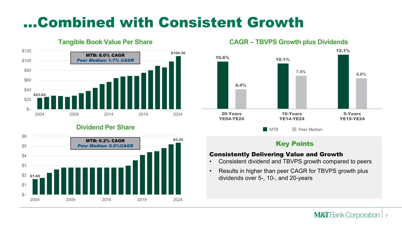 1.31% 1.34% 1.28% 1.01% 1.15% 1.10% MTB Peer Median 20-Years 2005-2024 10-Years 2015-2024 5-Years 2020-2024 Through the Cycle Profitability Advantage… 6 Note: (1) See Appendix 1 and 2 for reconciliation of GAAP with these non-GAAP measures. Net Operating ROTA(1) Better than Peer PPNR Generation & Credit Losses • Aided by NIM, efficiency and credit loss outperformance Consistent Profitability Advantage • Over the past 5-, 10-, and 20-years, M&T maintained an 18 to 30 basis point ROTA advantage compared to the peer median Results in Normalized ROTCE Advantage • Equates to a ~2.4% to ~3.9% normalized ROTCE advantage compared to peers assuming normalized capital levels ROTA Considered in Long-Term Incentives • Recent Performance Vested Stock Units grants include a 1.25% absolute ROTA threshold Key Points +30 bps +18 bps +18 bps