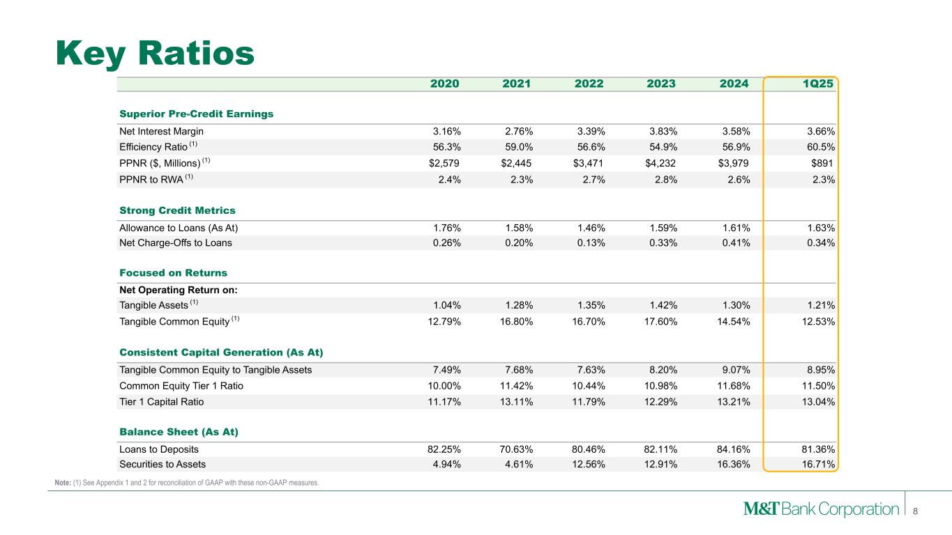 10.6% 10.1% 12.1% 4.4% 7.4% 6.8% MTB Peer Median 20-Years YE04-YE24 10-Years YE14-YE24 5-Years YE19-YE24 $1.60 $5.35 2004 2009 2014 2019 2024 $– $1 $2 $3 $4 $5 $6 $23.62 $109.36 2004 2009 2014 2019 2024 $– $20 $40 $60 $80 $100 $120 …Combined with Consistent Growth Dividend Per Share Tangible Book Value Per Share MTB: 6.2% CAGR Peer Median: 0.9%CAGR MTB: 8.0% CAGR Peer Median: 1.7% CAGR CAGR – TBVPS Growth plus Dividends Consistently Delivering Value and Growth • Consistent dividend and TBVPS growth compared to peers • Results in higher than peer CAGR for TBVPS growth plus dividends over 5-, 10-, and 20-years Key Points 7