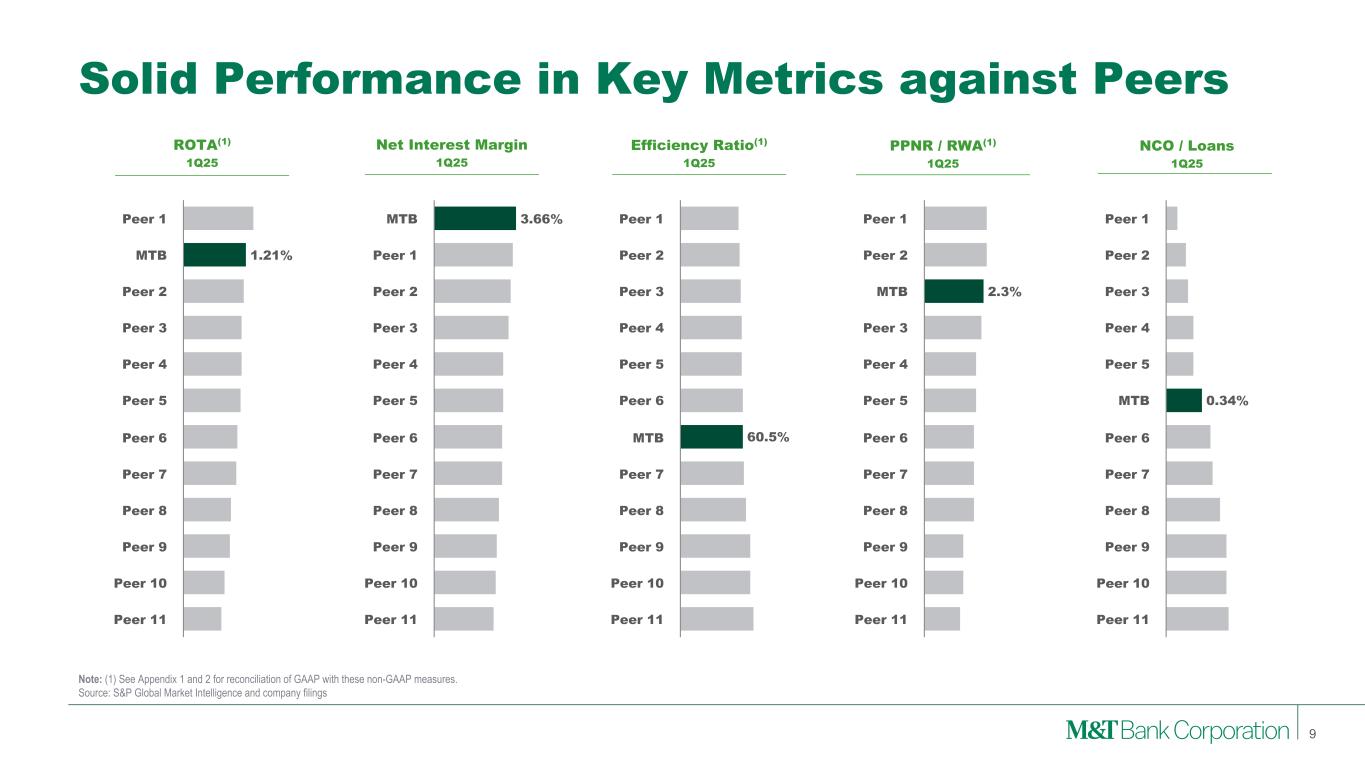2020 2021 2022 2023 2024 1Q25 Superior Pre-Credit Earnings Net Interest Margin 3.16 % 2.76 % 3.39 % 3.83 % 3.58 % 3.66 % Efficiency Ratio (1) 56.3 % 59.0 % 56.6 % 54.9 % 56.9 % 60.5 % PPNR ($, Millions) (1) $2,579 $2,445 $3,471 $4,232 $3,979 $891 PPNR to RWA (1) 2.4 % 2.3 % 2.7 % 2.8 % 2.6 % 2.3 % Strong Credit Metrics Allowance to Loans (As At) 1.76 % 1.58 % 1.46 % 1.59 % 1.61 % 1.63 % Net Charge-Offs to Loans 0.26 % 0.20 % 0.13 % 0.33 % 0.41 % 0.34 % Focused on Returns Net Operating Return on: Tangible Assets (1) 1.04 % 1.28 % 1.35 % 1.42 % 1.30 % 1.21 % Tangible Common Equity (1) 12.79 % 16.80 % 16.70 % 17.60 % 14.54 % 12.53 % Consistent Capital Generation (As At) Tangible Common Equity to Tangible Assets 7.49 % 7.68 % 7.63 % 8.20 % 9.07 % 8.95 % Common Equity Tier 1 Ratio 10.00 % 11.42 % 10.44 % 10.98 % 11.68 % 11.50 % Tier 1 Capital Ratio 11.17 % 13.11 % 11.79 % 12.29 % 13.21 % 13.04 % Balance Sheet (As At) Loans to Deposits 82.25 % 70.63 % 80.46 % 82.11 % 84.16 % 81.36 % Securities to Assets 4.94 % 4.61 % 12.56 % 12.91 % 16.36 % 16.71 % Key Ratios 8 Note: (1) See Appendix 1 and 2 for reconciliation of GAAP with these non-GAAP measures.