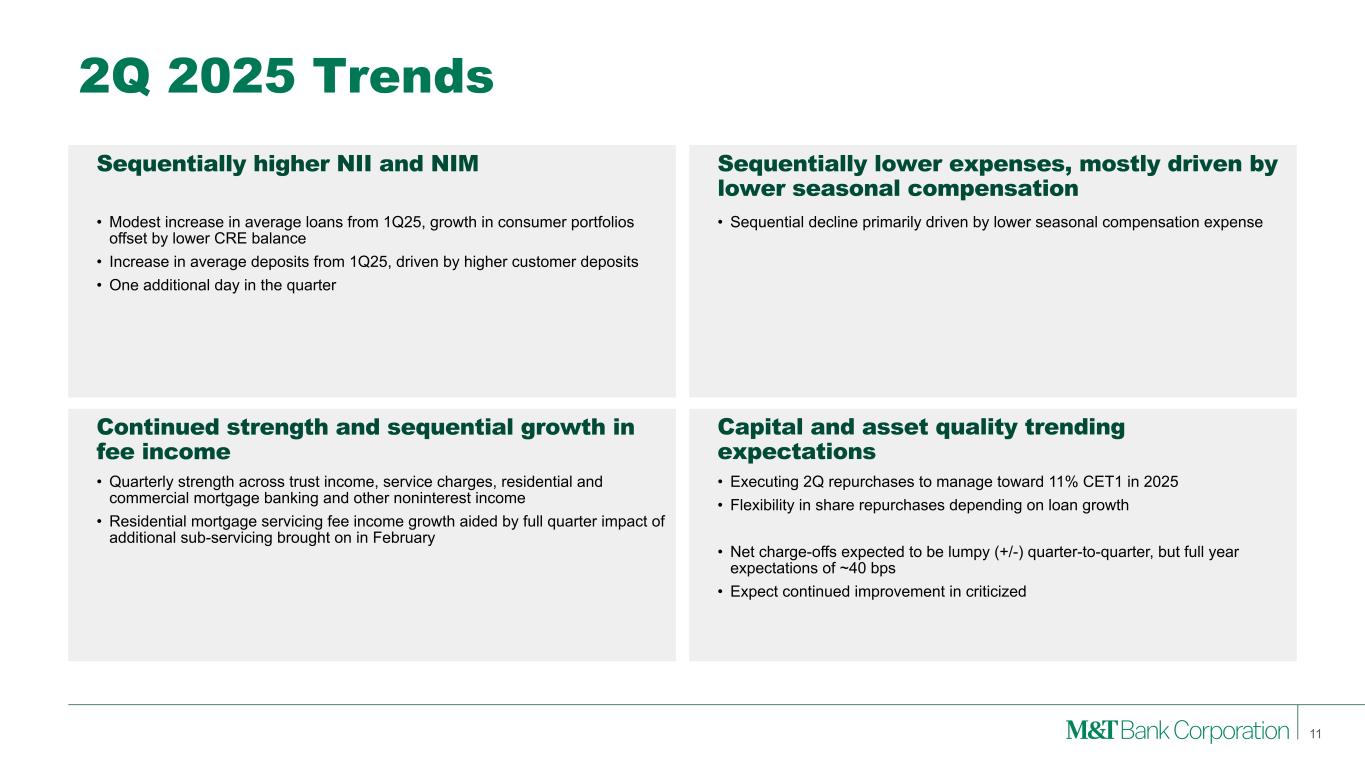 2Q 2025 Trends Sequentially higher NII and NIM Sequentially lower expenses, mostly driven by lower seasonal compensation Continued strength and sequential growth in fee income Capital and asset quality trending expectations • Sequential decline primarily driven by lower seasonal compensation expense • Modest increase in average loans from 1Q25, growth in consumer portfolios offset by lower CRE balance • Increase in average deposits from 1Q25, driven by higher customer deposits • One additional day in the quarter • Quarterly strength across trust income, service charges, residential and commercial mortgage banking and other noninterest income • Residential mortgage servicing fee income growth aided by full quarter impact of additional sub-servicing brought on in February • Executing 2Q repurchases to manage toward 11% CET1 in 2025 • Flexibility in share repurchases depending on loan growth • Net charge-offs expected to be lumpy (+/-) quarter-to-quarter, but full year expectations of ~40 bps • Expect continued improvement in criticized 11