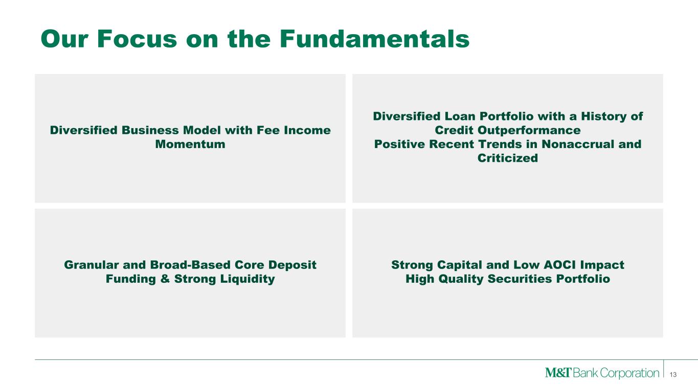 2025 Outlook 12 2025 Outlook Comments In co m e St at em en t Net Interest Income Taxable-equivalent $7.05 billion to $7.15 billion • NIM in the mid to high 3.60s Fee Income $2.5 billion to $2.6 billion • Trending toward high end of the range • Continued strength in trust and mortgage GAAP Expense Includes intangible amortization $5.4 billion to $5.5 billion • Continued focus on managing expense, while investing in enterprise priorities Net Charge-Offs % of Average Loans ~40 basis points • Reflects continued normalization in consumer and year over year improvement in commercial Tax Rate Taxable-equivalent ~24.5% A ve ra ge B al an ce s Loans $135 billion to $137 billion • Growth in C&I, consumer, and residential mortgage, declines in CRE Deposits $162 billion to $164 billion • Focus on growing customer deposits at reasonable cost CET1 Ratio Target ~11% in 2025 • Share repurchase flexibility depending on RWA trends