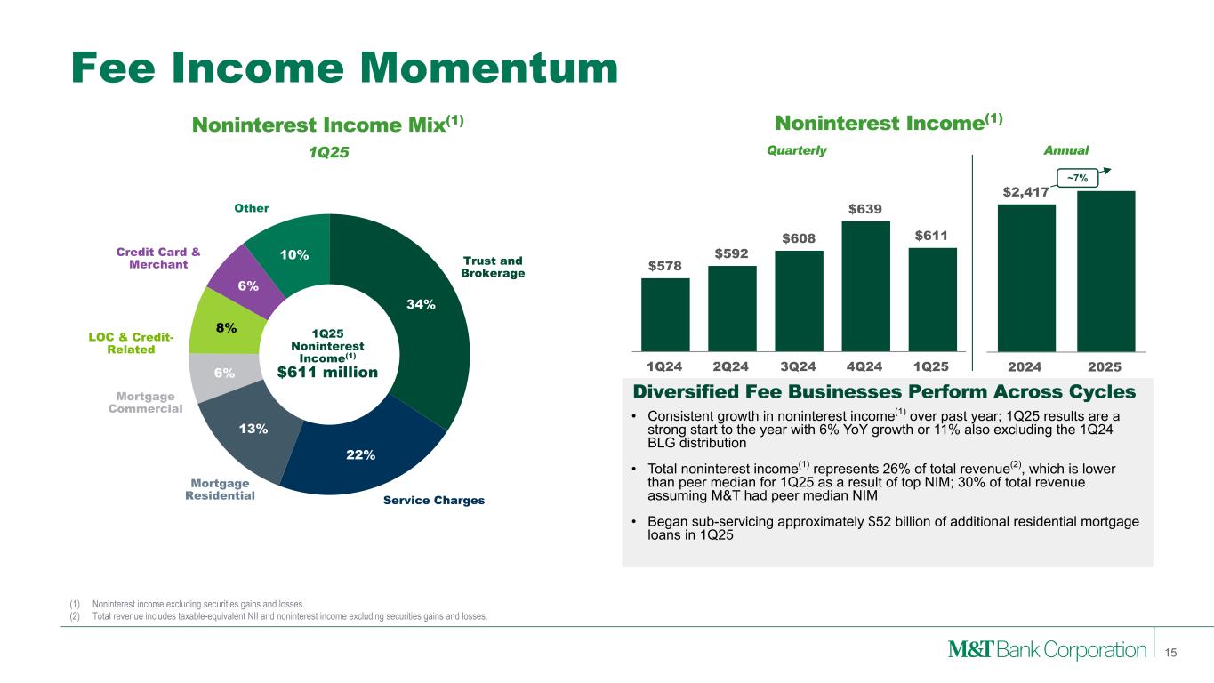Diversified Business Model Experienced teams provide a wide-range of credit, liquidity and capital markets solutions to meet our customer needs, delivered through a local engagement model and industry expertise on a national scale. Strategically built for the communities in which we operate. High-touch, local sales and service model provides a low-cost, stable funding base, a long-tenured customer base, and the shared benefits of community growth and development. 14 Institutional Services Expanding on strength of its reputation for industry leading service and strong reputation with existing network of deal influencers. Wealth Management Provides planning-led advice, leveraging Wilmington Trust’s national capabilities and the enhanced experience that LPL brings, to grow customers across the wealth continuum. Note: ‘All Other’ category not shown above. Represents 2% ($35 million) of NII, 3% ($21 million) of fees, 2% ($56 million) of revenue, <0.25% (<$0.2 billion) of loans and 5% ($8 billion) of deposits. (1) Net interest income is the difference between actual taxable-equivalent interest earned on assets and interest paid on liabilities by a segment and a funding charge (credit) based on the Company’s internal funds transfer pricing methodology. (2) See Appendix 1 and 2 for reconciliation of GAAP with these non-GAAP measures. Commercial Bank Retail Bank Institutional Services & Wealth Management Net Interest Income(1) $529 million $972 milion $171 million $1,707 million31% 57% 10% Fee Income $173 million $208 million $209 million $611 million28% 34% 34% Revenue $702 million $1,180 million $380 million $2,318 million30% 51% 16% Average Loans $79 billion $52 billion $4 billion $135 billion58% 39% 3% Average Deposits $46 billion $89 billion $19 billion $161 billion28% 55% 12% ROTA(2) 1.18% 2.57% 12.01% 1.21% ROTCE(2) 13.3% 30.5% 78.4% 12.5% Efficiency Ratio(2) 50.0% 53.9% 56.5% 60.5% 1Q25, % of Total M&T Total M&T