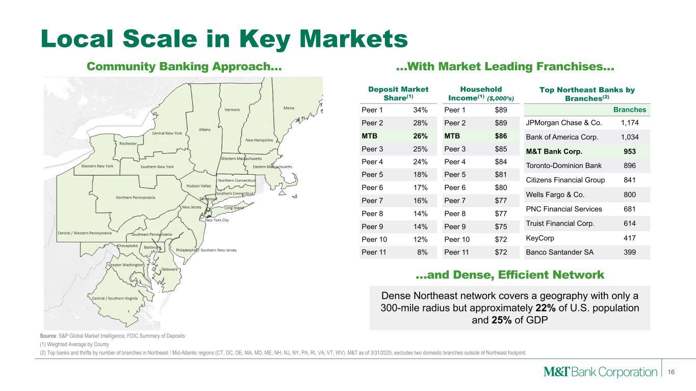 $2,417 2024 2025 34% 22% 13% 6% 8% 6% 10% Fee Income Momentum 15 • Consistent growth in noninterest income(1) over past year; 1Q25 results are a strong start to the year with 6% YoY growth or 11% also excluding the 1Q24 BLG distribution • Total noninterest income(1) represents 26% of total revenue(2), which is lower than peer median for 1Q25 as a result of top NIM; 30% of total revenue assuming M&T had peer median NIM • Began sub-servicing approximately $52 billion of additional residential mortgage loans in 1Q25 Noninterest Income Mix(1) 1Q25 Noninterest Income(1) Trust and Brokerage Mortgage Residential Mortgage Commercial Service Charges LOC & Credit- Related Credit Card & Merchant Other 1Q25 Noninterest Income(1) $611 million Diversified Fee Businesses Perform Across Cycles (1) Noninterest income excluding securities gains and losses. (2) Total revenue includes taxable-equivalent NII and noninterest income excluding securities gains and losses. Quarterly Annual ~7% $578 $592 $608 $639 $611 1Q24 2Q24 3Q24 4Q24 1Q25