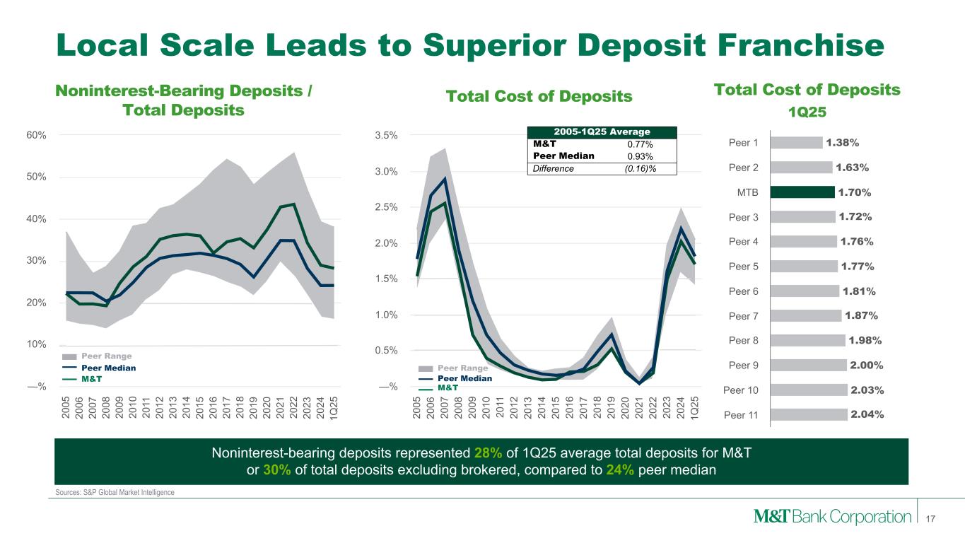 Local Scale in Key Markets 16 Source: S&P Global Market Intelligence, FDIC Summary of Deposits (1) Weighted Average by County (2) Top banks and thrifts by number of branches in Northeast / Mid-Atlantic regions (CT, DC, DE, MA, MD, ME, NH, NJ, NY, PA, RI, VA, VT, WV). M&T as of 3/31/2025, excludes two domestic branches outside of Northeast footprint. Household Income(1) ($,000’s) Peer 1 $89 Peer 2 $89 MTB $86 Peer 3 $85 Peer 4 $84 Peer 5 $81 Peer 6 $80 Peer 7 $77 Peer 8 $77 Peer 9 $75 Peer 10 $72 Peer 11 $72 Top Northeast Banks by Branches(2) Branches JPMorgan Chase & Co. 1,174 Bank of America Corp. 1,034 M&T Bank Corp. 953 Toronto-Dominion Bank 896 Citizens Financial Group 841 Wells Fargo & Co. 800 PNC Financial Services 681 Truist Financial Corp. 614 KeyCorp 417 Banco Santander SA 399 Dense Northeast network covers a geography with only a 300-mile radius but approximately 22% of U.S. population and 25% of GDP Community Banking Approach… …and Dense, Efficient Network Deposit Market Share(1) Peer 1 34 % Peer 2 28 % MTB 26 % Peer 3 25 % Peer 4 24 % Peer 5 18 % Peer 6 17 % Peer 7 16 % Peer 8 14 % Peer 9 14 % Peer 10 12 % Peer 11 8 % …With Market Leading Franchises…