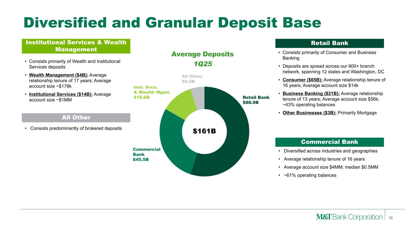 20 05 20 06 20 07 20 08 20 09 20 10 20 11 20 12 20 13 20 14 20 15 20 16 20 17 20 18 20 19 20 20 20 21 20 22 20 23 20 24 1Q 25 —% 0.5% 1.0% 1.5% 2.0% 2.5% 3.0% 3.5% 20 05 20 06 20 07 20 08 20 09 20 10 20 11 20 12 20 13 20 14 20 15 20 16 20 17 20 18 20 19 20 20 20 21 20 22 20 23 20 24 1Q 25 —% 10% 20% 30% 40% 50% 60% Sources: S&P Global Market Intelligence Local Scale Leads to Superior Deposit Franchise Noninterest-bearing deposits represented 28% of 1Q25 average total deposits for M&T or 30% of total deposits excluding brokered, compared to 24% peer median 2005-1Q25 Average M&T 0.77% Peer Median 0.93% Difference (0.16)% Noninterest-Bearing Deposits / Total Deposits Total Cost of Deposits 17 M&T Peer Median Peer Range Total Cost of Deposits 1Q25 M&T Peer Median Peer Range 1.38% 1.63% 1.70% 1.72% 1.76% 1.77% 1.81% 1.87% 1.98% 2.00% 2.03% 2.04% Peer 1 Peer 2 MTB Peer 3 Peer 4 Peer 5 Peer 6 Peer 7 Peer 8 Peer 9 Peer 10 Peer 11
