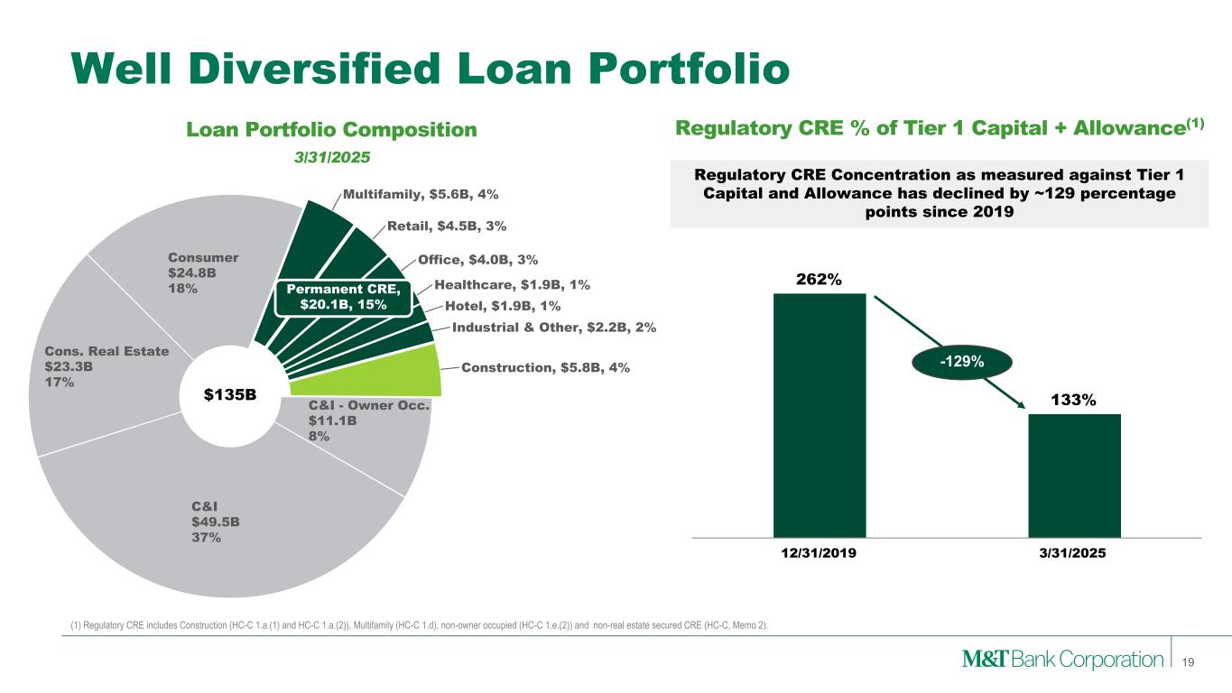 Retail Bank $88.9B Commercial Bank $45.5B Inst. Svcs. & Wealth Mgmt. $18.6B All Other $8.2B Diversified and Granular Deposit Base • Diversified across industries and geographies • Average relationship tenure of 16 years • Average account size $4MM; median $0.5MM • ~61% operating balances Average Deposits 1Q25 Institutional Services & Wealth Management Retail Bank Commercial Bank • Consists primarily of Consumer and Business Banking • Deposits are spread across our 900+ branch network, spanning 12 states and Washington, DC • Consumer ($65B): Average relationship tenure of 16 years; Average account size $14k • Business Banking ($21B): Average relationship tenure of 13 years; Average account size $56k; ~43% operating balances • Other Businesses ($3B): Primarily Mortgage • Consists primarily of Wealth and Institutional Services deposits • Wealth Management ($4B): Average relationship tenure of 17 years; Average account size ~$178k • Institutional Services ($14B): Average account size ~$1MM 18 $161B All Other • Consists predominantly of brokered deposits