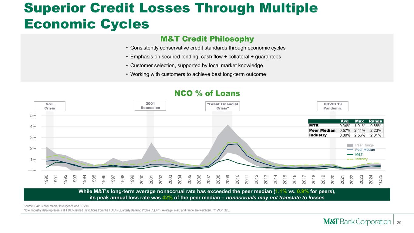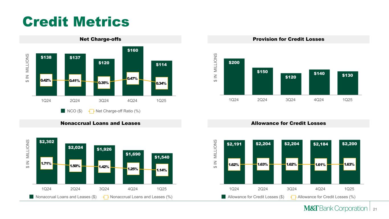 Source: S&P Global Market Intelligence and FRY9C. Note: Industry data represents all FDIC-insured institutions from the FDIC’s Quarterly Banking Profile (“QBP”). Average, max, and range are weighted FY1990-1Q25. Superior Credit Losses Through Multiple Economic Cycles M&T Credit Philosophy NCO % of Loans • Consistently conservative credit standards through economic cycles • Emphasis on secured lending: cash flow + collateral + guarantees • Customer selection, supported by local market knowledge • Working with customers to achieve best long-term outcome “Great Financial Crisis” 2001 Recession S&L Crisis While M&T’s long-term average nonaccrual rate has exceeded the peer median (1.1% vs. 0.9% for peers), its peak annual loss rate was 42% of the peer median – nonaccruals may not translate to losses 20 COVID 19 Pandemic Avg Max Range MTB 0.34% 1.01% 0.88% Peer Median 0.57% 2.41% 2.23% Industry 0.80% 2.56% 2.31% M&T Peer Median Peer Range Industry 19 90 19 91 19 92 19 93 19 94 19 95 19 96 19 97 19 98 19 99 20 00 20 01 20 02 20 03 20 04 20 05 20 06 20 07 20 08 20 09 20 10 20 11 20 12 20 13 20 14 20 15 20 16 20 17 20 18 20 19 20 20 20 21 20 22 20 23 20 24 1Q 25 —% 1% 2% 3% 4% 5%