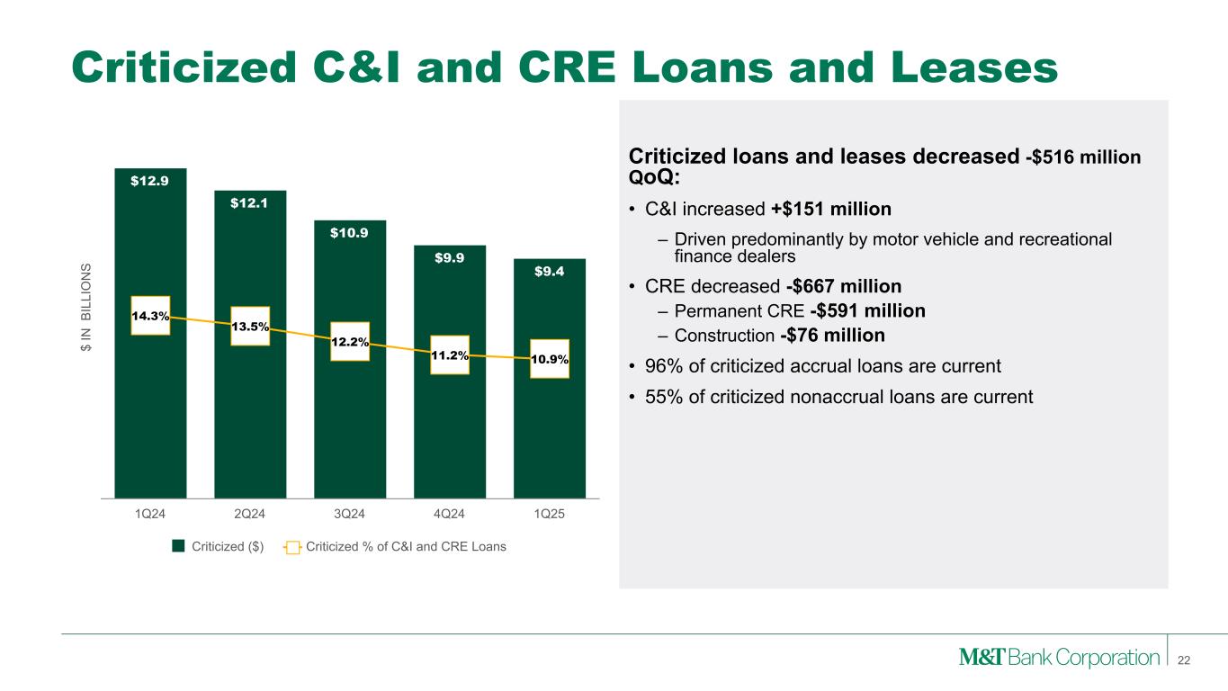 $ IN M IL LI O N S $138 $137 $120 $160 $114 0.42% 0.41% 0.35% 0.47% 0.34% NCO ($) Net Charge-off Ratio (%) 1Q24 2Q24 3Q24 4Q24 1Q25 $ IN M IL LI O N S $200 $150 $120 $140 $130 1Q24 2Q24 3Q24 4Q24 1Q25 $ IN M IL LI O N S $2,302 $2,024 $1,926 $1,690 $1,540 1.71% 1.50% 1.42% 1.25% 1.14% Nonaccrual Loans and Leases ($) Nonaccrual Loans and Leases (%) 1Q24 2Q24 3Q24 4Q24 1Q25 $ IN M IL LI O N S $2,191 $2,204 $2,204 $2,184 $2,200 1.62% 1.63% 1.62% 1.61% 1.63% Allowance for Credit Losses ($) Allowance for Credit Losses (%) 1Q24 2Q24 3Q24 4Q24 1Q25 Credit Metrics Nonaccrual Loans and Leases Net Charge-offs Provision for Credit Losses Allowance for Credit Losses 21