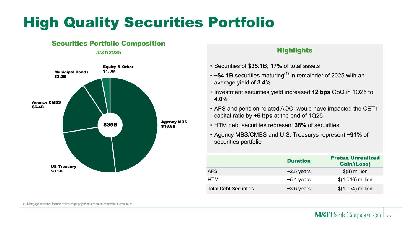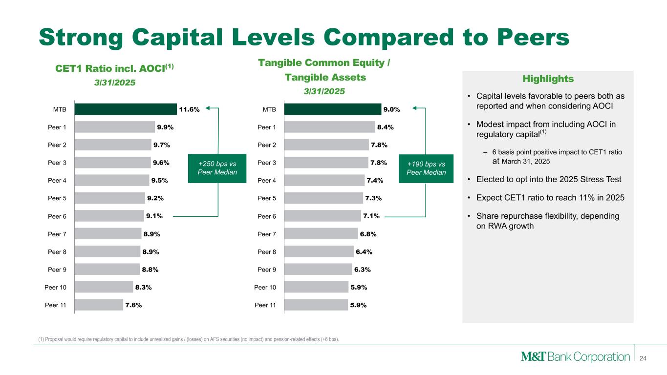 Agency MBS $16.9B US Treasury $8.5B Agency CMBS $6.4B Municipal Bonds $2.3B Equity & Other $1.0B High Quality Securities Portfolio (1) Mortgage securities include estimated prepayment under market forward interest rates. Securities Portfolio Composition 3/31/2025 • Securities of $35.1B; 17% of total assets • ~$4.1B securities maturing(1) in remainder of 2025 with an average yield of 3.4% • Investment securities yield increased 12 bps QoQ in 1Q25 to 4.0% • AFS and pension-related AOCI would have impacted the CET1 capital ratio by +6 bps at the end of 1Q25 • HTM debt securities represent 38% of securities • Agency MBS/CMBS and U.S. Treasurys represent ~91% of securities portfolio Duration Pretax Unrealized Gain/(Loss) AFS ~2.5 years $(8) million HTM ~5.4 years $(1,046) million Total Debt Securities ~3.6 years $(1,054) million Highlights 23 $35B