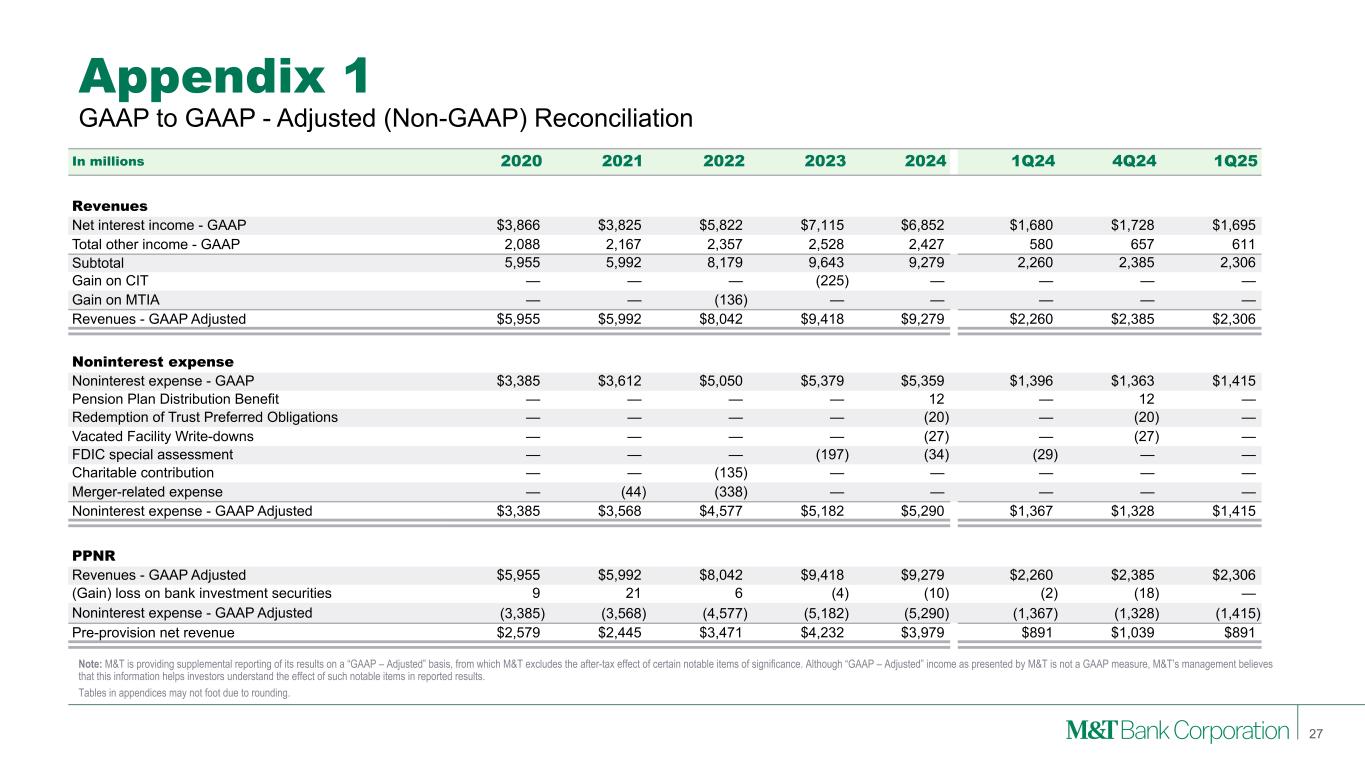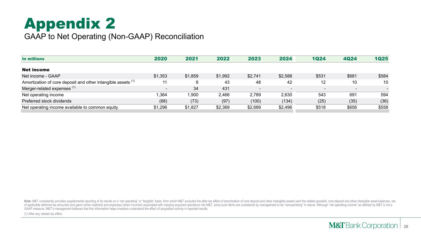 Appendix 1 Note: M&T is providing supplemental reporting of its results on a “GAAP – Adjusted” basis, from which M&T excludes the after-tax effect of certain notable items of significance. Although “GAAP – Adjusted” income as presented by M&T is not a GAAP measure, M&T’s management believes that this information helps investors understand the effect of such notable items in reported results. Tables in appendices may not foot due to rounding. GAAP to GAAP - Adjusted (Non-GAAP) Reconciliation 27 In millions 2020 2021 2022 2023 2024 1Q24 4Q24 1Q25 Revenues Net interest income - GAAP $3,866 $3,825 $5,822 $7,115 $6,852 $1,680 $1,728 $1,695 Total other income - GAAP 2,088 2,167 2,357 2,528 2,427 580 657 611 Subtotal 5,955 5,992 8,179 9,643 9,279 2,260 2,385 2,306 Gain on CIT — — — (225) — — — — Gain on MTIA — — (136) — — — — — Revenues - GAAP Adjusted $5,955 $5,992 $8,042 $9,418 $9,279 $2,260 $2,385 $2,306 Noninterest expense Noninterest expense - GAAP $3,385 $3,612 $5,050 $5,379 $5,359 $1,396 $1,363 $1,415 Pension Plan Distribution Benefit — — — — 12 — 12 — Redemption of Trust Preferred Obligations — — — — (20) — (20) — Vacated Facility Write-downs — — — — (27) — (27) — FDIC special assessment — — — (197) (34) (29) — — Charitable contribution — — (135) — — — — — Merger-related expense — (44) (338) — — — — — Noninterest expense - GAAP Adjusted $3,385 $3,568 $4,577 $5,182 $5,290 $1,367 $1,328 $1,415 PPNR Revenues - GAAP Adjusted $5,955 $5,992 $8,042 $9,418 $9,279 $2,260 $2,385 $2,306 (Gain) loss on bank investment securities 9 21 6 (4) (10) (2) (18) — Noninterest expense - GAAP Adjusted (3,385) (3,568) (4,577) (5,182) (5,290) (1,367) (1,328) (1,415) Pre-provision net revenue $2,579 $2,445 $3,471 $4,232 $3,979 $891 $1,039 $891