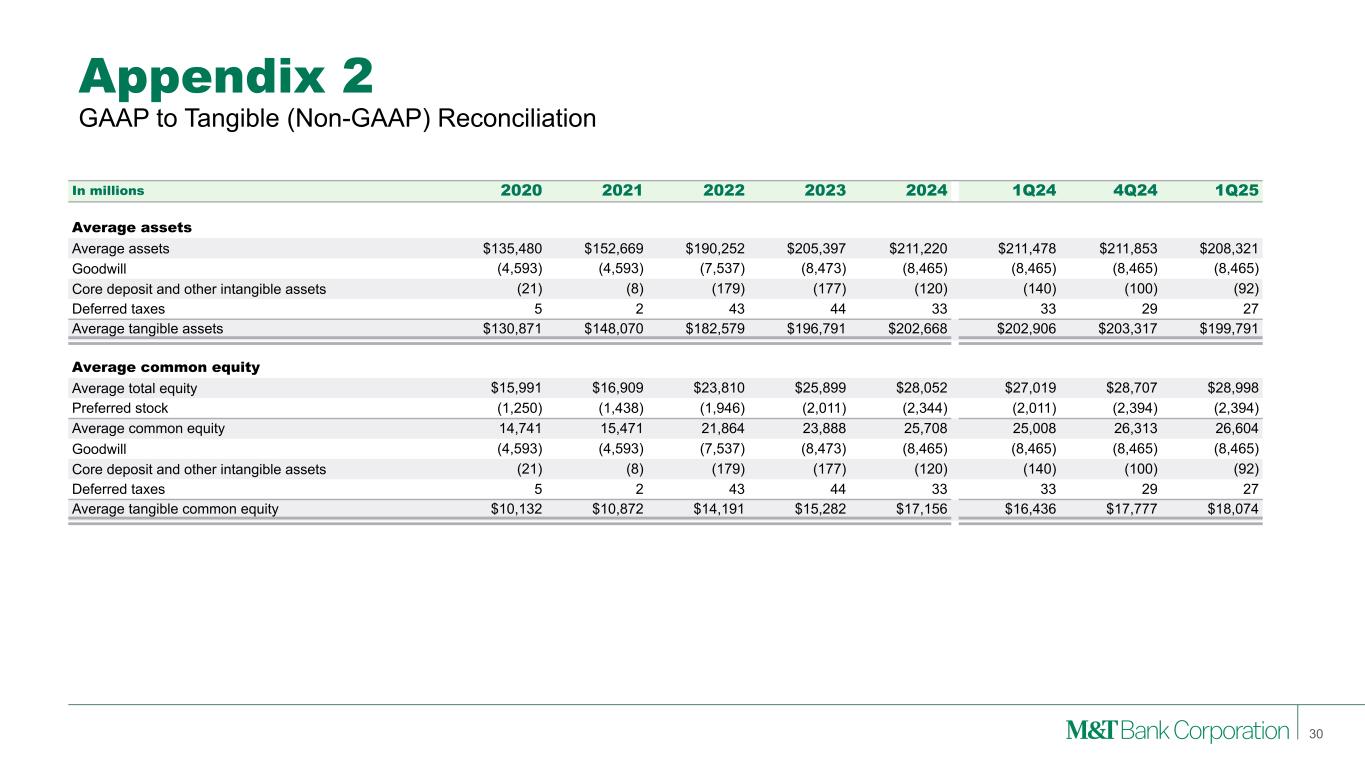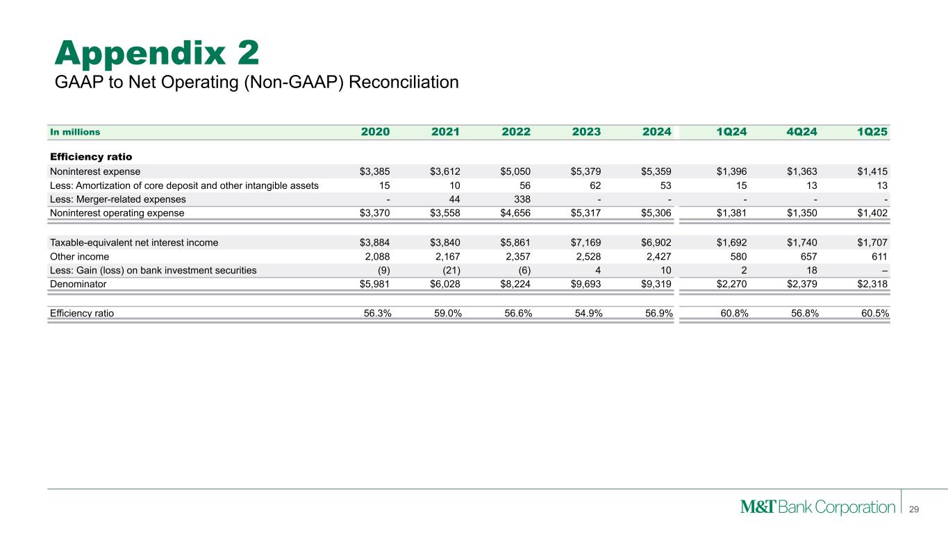 Appendix 2 Note: M&T consistently provides supplemental reporting of its results on a “net operating” or “tangible” basis, from which M&T excludes the after-tax effect of amortization of core deposit and other intangible assets (and the related goodwill, core deposit and other intangible asset balances, net of applicable deferred tax amounts) and gains (when realized) and expenses (when incurred) associated with merging acquired operations into M&T, since such items are considered by management to be “nonoperating” in nature. Although “net operating income” as defined by M&T is not a GAAP measure, M&T’s management believes that this information helps investors understand the effect of acquisition activity in reported results. (1) After any related tax effect 28 GAAP to Net Operating (Non-GAAP) Reconciliation In millions 2020 2021 2022 2023 2024 1Q24 4Q24 1Q25 Net income Net income - GAAP $1,353 $1,859 $1,992 $2,741 $2,588 $531 $681 $584 Amortization of core deposit and other intangible assets (1) 11 8 43 48 42 12 10 10 Merger-related expenses (1) - 34 431 - - - - - Net operating income 1,364 1,900 2,466 2,789 2,630 543 691 594 Preferred stock dividends (68) (73) (97) (100) (134) (25) (35) (36) Net operating income available to common equity $1,296 $1,827 $2,369 $2,689 $2,496 $518 $656 $558