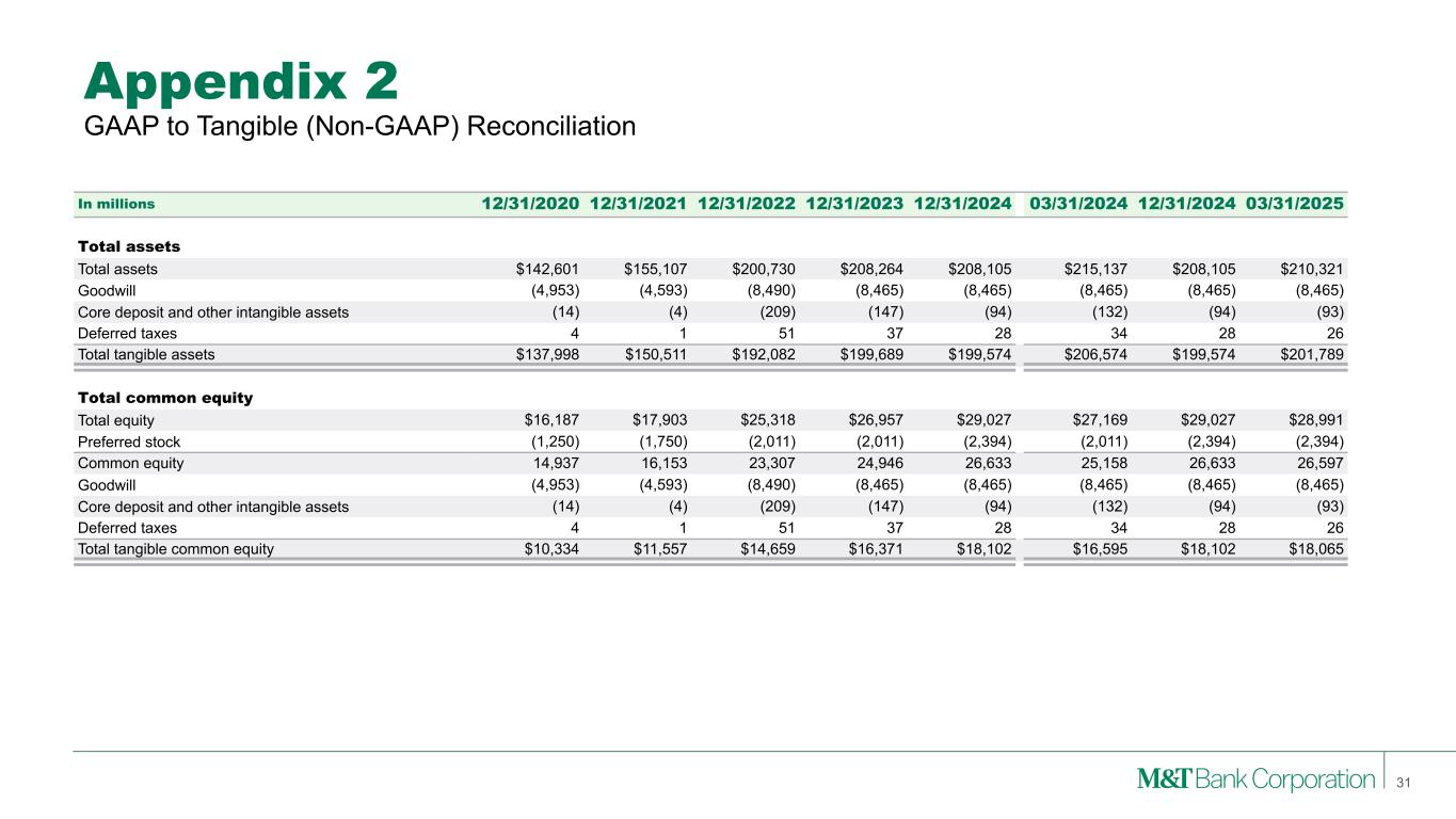 Appendix 2 GAAP to Tangible (Non-GAAP) Reconciliation 30 In millions 2020 2021 2022 2023 2024 1Q24 4Q24 1Q25 Average assets Average assets $135,480 $152,669 $190,252 $205,397 $211,220 $211,478 $211,853 $208,321 Goodwill (4,593) (4,593) (7,537) (8,473) (8,465) (8,465) (8,465) (8,465) Core deposit and other intangible assets (21) (8) (179) (177) (120) (140) (100) (92) Deferred taxes 5 2 43 44 33 33 29 27 Average tangible assets $130,871 $148,070 $182,579 $196,791 $202,668 $202,906 $203,317 $199,791 Average common equity Average total equity $15,991 $16,909 $23,810 $25,899 $28,052 $27,019 $28,707 $28,998 Preferred stock (1,250) (1,438) (1,946) (2,011) (2,344) (2,011) (2,394) (2,394) Average common equity 14,741 15,471 21,864 23,888 25,708 25,008 26,313 26,604 Goodwill (4,593) (4,593) (7,537) (8,473) (8,465) (8,465) (8,465) (8,465) Core deposit and other intangible assets (21) (8) (179) (177) (120) (140) (100) (92) Deferred taxes 5 2 43 44 33 33 29 27 Average tangible common equity $10,132 $10,872 $14,191 $15,282 $17,156 $16,436 $17,777 $18,074