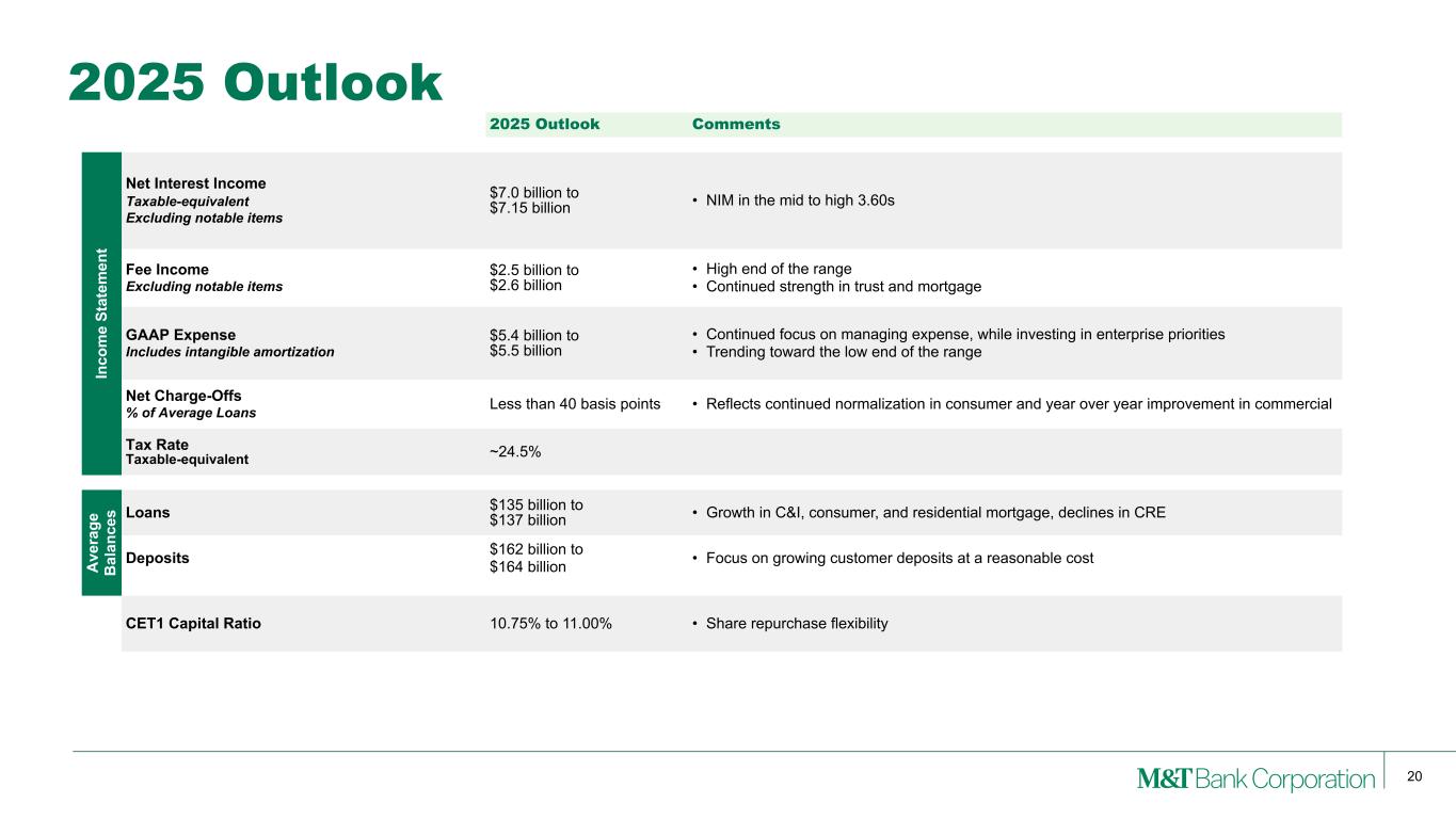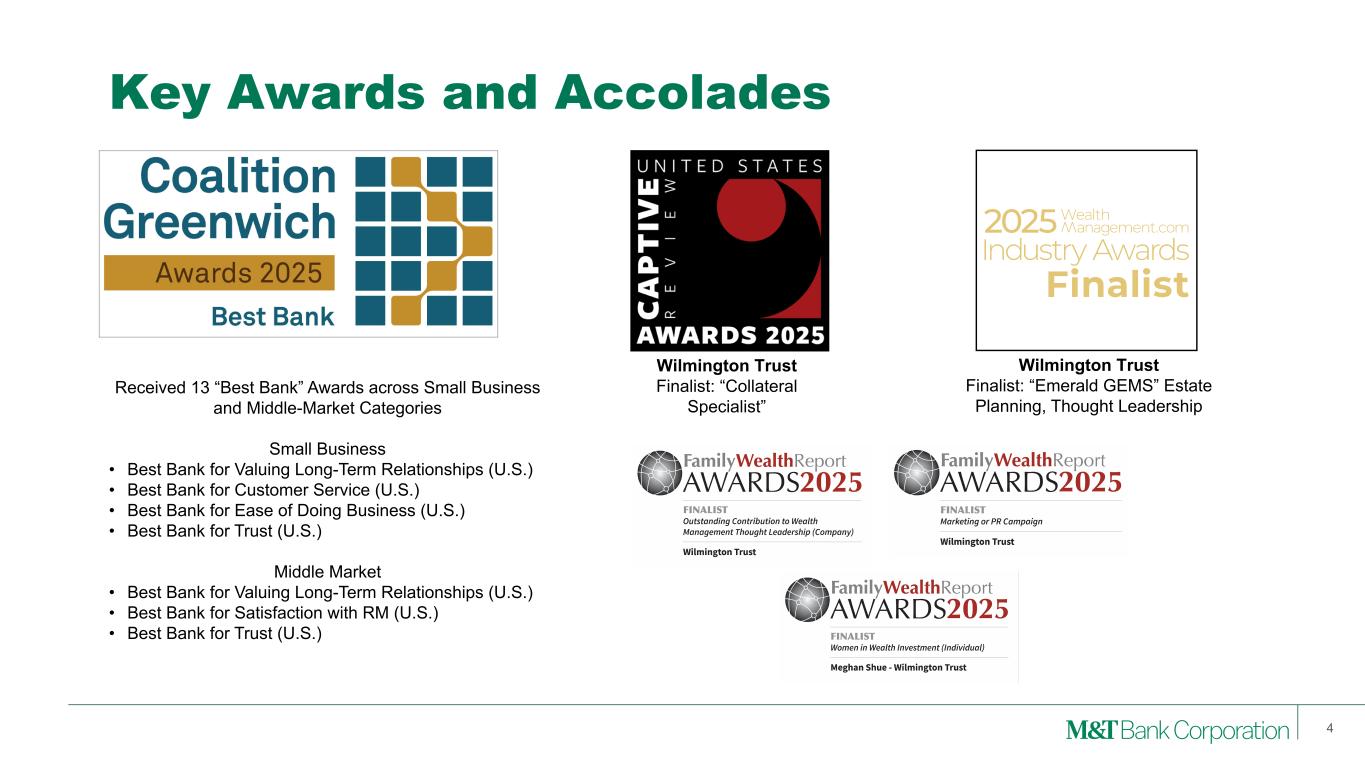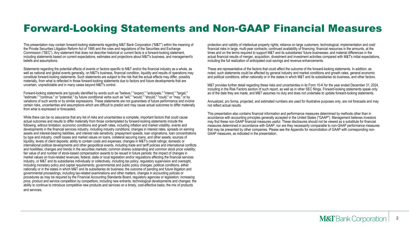 2 This presentation may contain forward-looking statements regarding M&T Bank Corporation (“M&T”) within the meaning of the Private Securities Litigation Reform Act of 1995 and the rules and regulations of the Securities and Exchange Commission (“SEC”). Any statement that does not describe historical or current facts is a forward-looking statement, including statements based on current expectations, estimates and projections about M&T's business, and management's beliefs and assumptions. Statements regarding the potential effects of events or factors specific to M&T and/or the financial industry as a whole, as well as national and global events generally, on M&T's business, financial condition, liquidity and results of operations may constitute forward-looking statements. Such statements are subject to the risk that the actual effects may differ, possibly materially, from what is reflected in those forward-looking statements due to factors and future developments that are uncertain, unpredictable and in many cases beyond M&T's control. Forward-looking statements are typically identified by words such as "believe," "expect," "anticipate," "intend," "target," "estimate," "continue," or "potential," by future conditional verbs such as "will," "would," "should," "could," or "may," or by variations of such words or by similar expressions. These statements are not guarantees of future performance and involve certain risks, uncertainties and assumptions which are difficult to predict and may cause actual outcomes to differ materially from what is expressed or forecasted. While there can be no assurance that any list of risks and uncertainties is complete, important factors that could cause actual outcomes and results to differ materially from those contemplated by forward-looking statements include the following, without limitation: economic conditions and growth rates, including inflation and market volatility; events and developments in the financial services industry, including industry conditions; changes in interest rates, spreads on earning assets and interest-bearing liabilities, and interest rate sensitivity; prepayment speeds, loan originations, loan concentrations by type and industry, credit losses and market values on loans, collateral securing loans, and other assets; sources of liquidity; levels of client deposits; ability to contain costs and expenses; changes in M&T's credit ratings; domestic or international political developments and other geopolitical events, including trade and tariff policies and international conflicts and hostilities; changes and trends in the securities markets; common shares outstanding and common stock price volatility; fair value of and number of stock-based compensation awards to be issued in future periods; the impact of changes in market values on trust-related revenues; federal, state or local legislation and/or regulations affecting the financial services industry, or M&T and its subsidiaries individually or collectively, including tax policy; regulatory supervision and oversight, including monetary policy and capital requirements; governmental and public policy changes; political conditions, either nationally or in the states in which M&T and its subsidiaries do business; the outcome of pending and future litigation and governmental proceedings, including tax-related examinations and other matters; changes in accounting policies or procedures as may be required by the Financial Accounting Standards Board, regulatory agencies or legislation; increasing price, product and service competition by competitors, including new entrants; technological developments and changes; the ability to continue to introduce competitive new products and services on a timely, cost-effective basis; the mix of products and services; protection and validity of intellectual property rights; reliance on large customers; technological, implementation and cost/ financial risks in large, multi-year contracts; continued availability of financing; financial resources in the amounts, at the times and on the terms required to support M&T and its subsidiaries' future businesses; and material differences in the actual financial results of merger, acquisition, divestment and investment activities compared with M&T's initial expectations, including the full realization of anticipated cost savings and revenue enhancements. These are representative of the factors that could affect the outcome of the forward-looking statements. In addition, as noted, such statements could be affected by general industry and market conditions and growth rates, general economic and political conditions, either nationally or in the states in which M&T and its subsidiaries do business, and other factors. M&T provides further detail regarding these risks and uncertainties in its Form 10-K for the year ended December 31, 2024, including in the Risk Factors section of such report, as well as in other SEC filings. Forward-looking statements speak only as of the date they are made, and M&T assumes no duty and does not undertake to update forward-looking statements. Annualized, pro forma, projected, and estimated numbers are used for illustrative purposes only, are not forecasts and may not reflect actual results. This presentation also contains financial information and performance measures determined by methods other than in accordance with accounting principles generally accepted in the United States ("GAAP"). Management believes investors may find these non-GAAP financial measures useful. These disclosures should not be viewed as a substitute for financial measures determined in accordance with GAAP, nor are they necessarily comparable to non-GAAP performance measures that may be presented by other companies. Please see the Appendix for reconciliation of GAAP with corresponding non- GAAP measures, as indicated in the presentation. Forward-Looking Statements and Non-GAAP Financial Measures