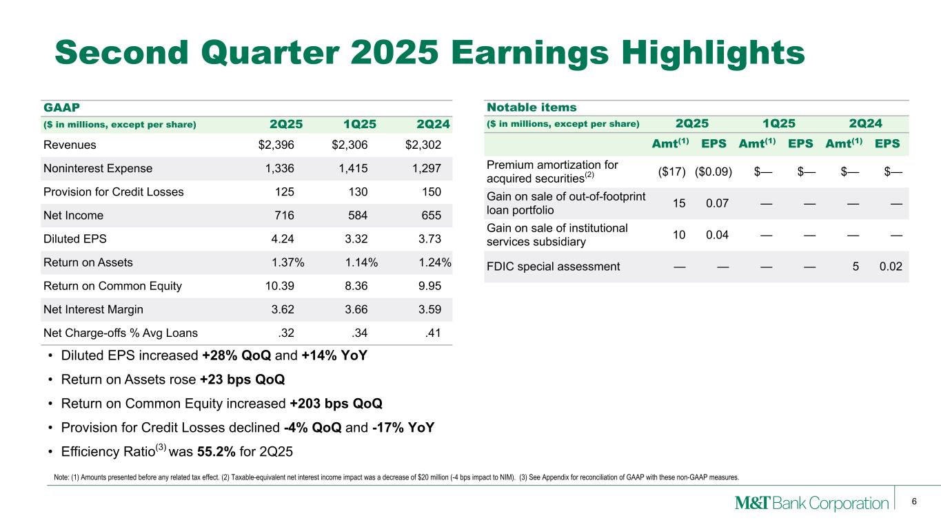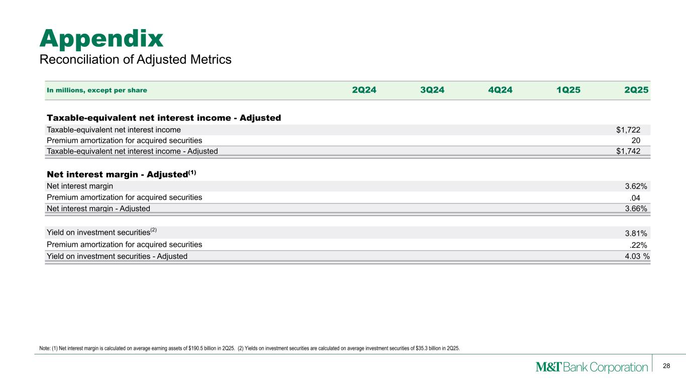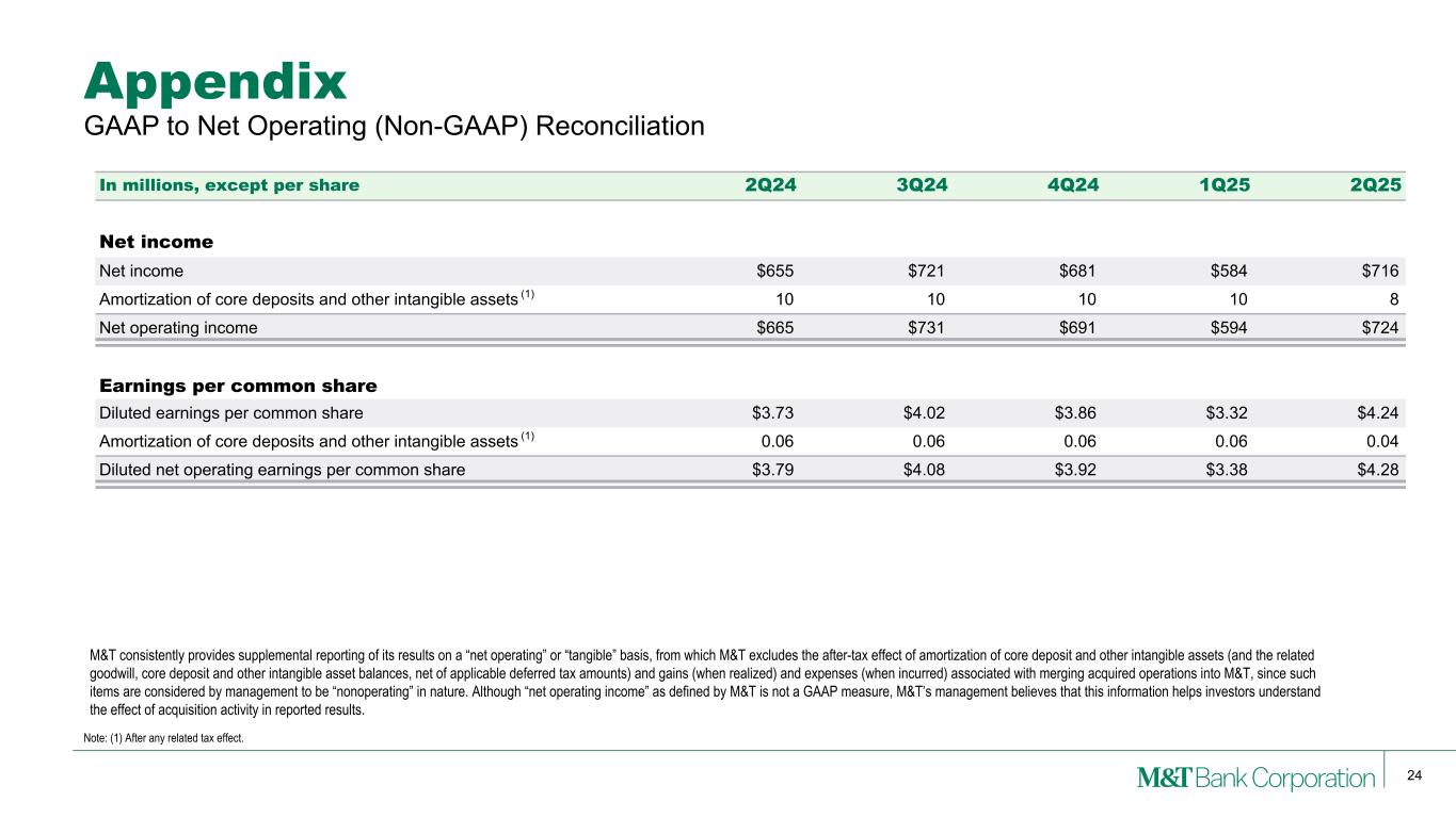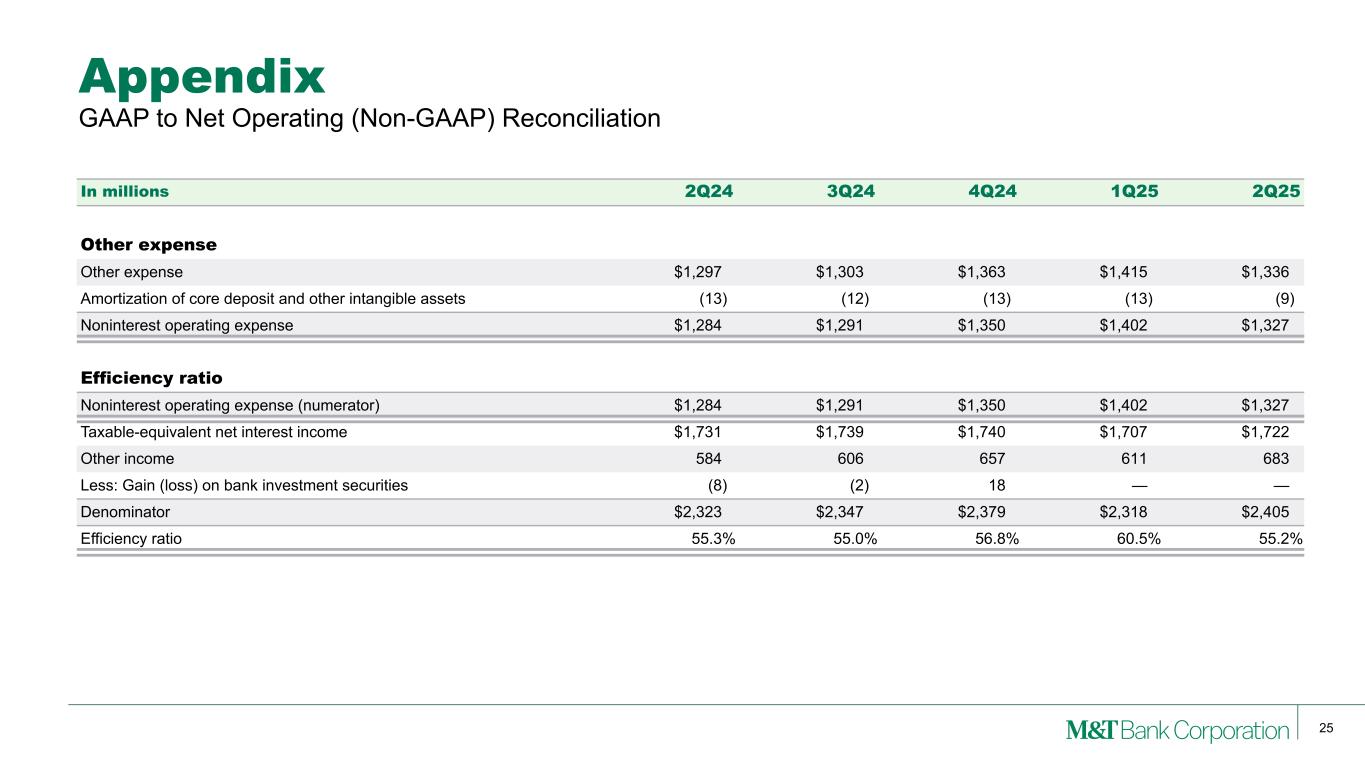 24 M&T consistently provides supplemental reporting of its results on a “net operating” or “tangible” basis, from which M&T excludes the after-tax effect of amortization of core deposit and other intangible assets (and the related goodwill, core deposit and other intangible asset balances, net of applicable deferred tax amounts) and gains (when realized) and expenses (when incurred) associated with merging acquired operations into M&T, since such items are considered by management to be “nonoperating” in nature. Although “net operating income” as defined by M&T is not a GAAP measure, M&T’s management believes that this information helps investors understand the effect of acquisition activity in reported results. Appendix Note: (1) After any related tax effect. GAAP to Net Operating (Non-GAAP) Reconciliation In millions, except per share 2Q24 3Q24 4Q24 1Q25 2Q25 Net income Net income $655 $721 $681 $584 $716 Amortization of core deposits and other intangible assets (1) 10 10 10 10 8 Net operating income $665 $731 $691 $594 $724 Earnings per common share Diluted earnings per common share $3.73 $4.02 $3.86 $3.32 $4.24 Amortization of core deposits and other intangible assets (1) 0.06 0.06 0.06 0.06 0.04 Diluted net operating earnings per common share $3.79 $4.08 $3.92 $3.38 $4.28