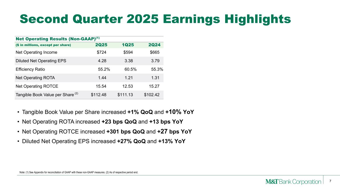 6 • Diluted EPS increased +28% QoQ and +14% YoY • Return on Assets rose +23 bps QoQ • Return on Common Equity increased +203 bps QoQ • Provision for Credit Losses declined -4% QoQ and -17% YoY • Efficiency Ratio(3) was 55.2% for 2Q25 Notable items ($ in millions, except per share) 2Q25 1Q25 2Q24 Amt(1) EPS Amt(1) EPS Amt(1) EPS Premium amortization for acquired securities(2) ($17) ($0.09) $— $— $— $— Gain on sale of out-of-footprint loan portfolio 15 0.07 — — — — Gain on sale of institutional services subsidiary 10 0.04 — — — — FDIC special assessment — — — — 5 0.02 Second Quarter 2025 Earnings Highlights GAAP ($ in millions, except per share) 2Q25 1Q25 2Q24 Revenues $2,396 $2,306 $2,302 Noninterest Expense 1,336 1,415 1,297 Provision for Credit Losses 125 130 150 Net Income 716 584 655 Diluted EPS 4.24 3.32 3.73 Return on Assets 1.37% 1.14% 1.24% Return on Common Equity 10.39 8.36 9.95 Net Interest Margin 3.62 3.66 3.59 Net Charge-offs % Avg Loans .32 .34 .41 Note: (1) Amounts presented before any related tax effect. (2) Taxable-equivalent net interest income impact was a decrease of $20 million (-4 bps impact to NIM). (3) See Appendix for reconciliation of GAAP with these non-GAAP measures.