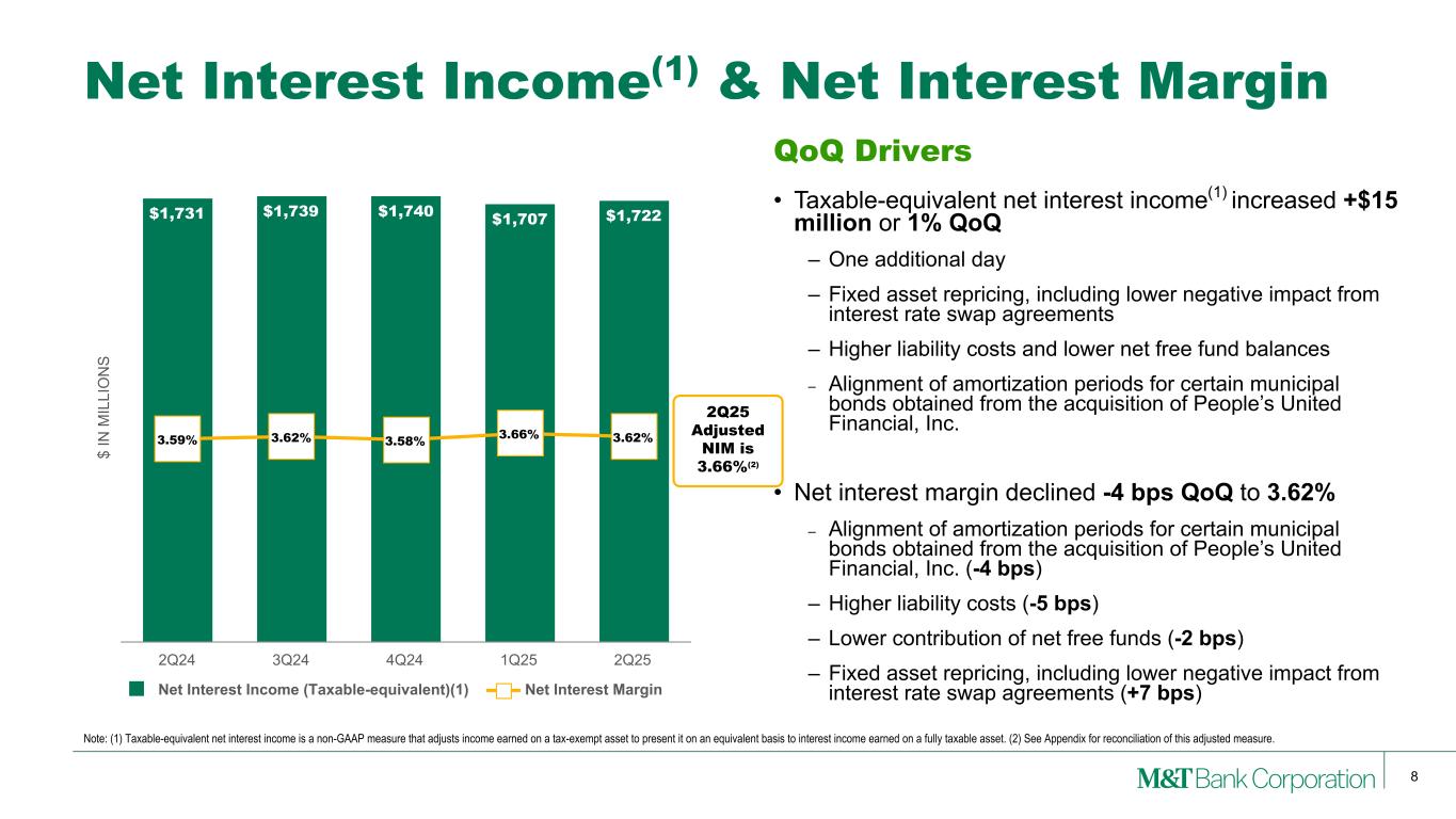 7 Note: (1) See Appendix for reconciliation of GAAP with these non-GAAP measures. (2) As of respective period end. Second Quarter 2025 Earnings Highlights Net Operating Results (Non-GAAP)(1) ($ in millions, except per share) 2Q25 1Q25 2Q24 Net Operating Income $724 $594 $665 Diluted Net Operating EPS 4.28 3.38 3.79 Efficiency Ratio 55.2% 60.5% 55.3% Net Operating ROTA 1.44 1.21 1.31 Net Operating ROTCE 15.54 12.53 15.27 Tangible Book Value per Share (2) $112.48 $111.13 $102.42 • Tangible Book Value per Share increased +1% QoQ and +10% YoY • Net Operating ROTA increased +23 bps QoQ and +13 bps YoY • Net Operating ROTCE increased +301 bps QoQ and +27 bps YoY • Diluted Net Operating EPS increased +27% QoQ and +13% YoY