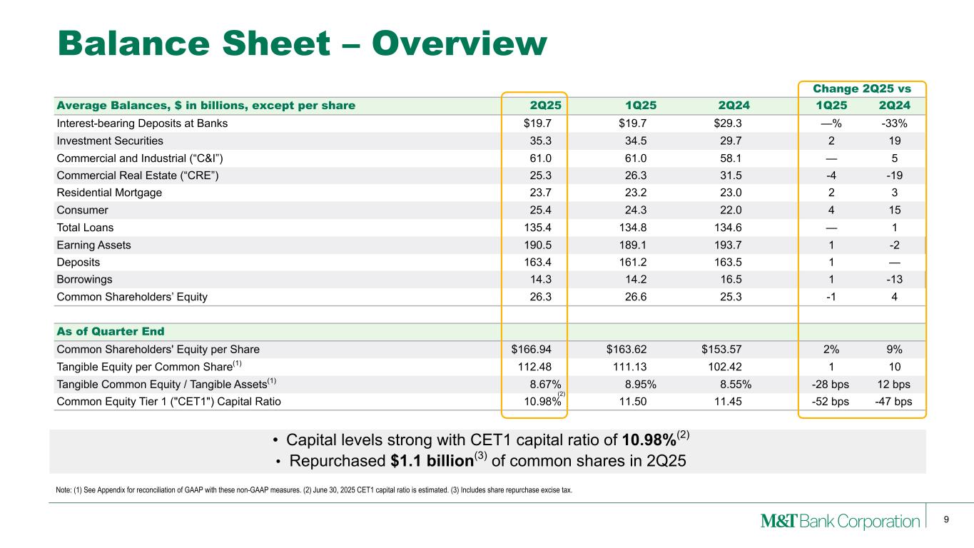 8 Net Interest Income(1) & Net Interest Margin Note: (1) Taxable-equivalent net interest income is a non-GAAP measure that adjusts income earned on a tax-exempt asset to present it on an equivalent basis to interest income earned on a fully taxable asset. (2) See Appendix for reconciliation of this adjusted measure. $ IN M IL LI O N S $1,731 $1,739 $1,740 $1,707 $1,722 3.59% 3.62% 3.58% 3.66% 3.62% Net Interest Income (Taxable-equivalent)(1) Net Interest Margin 2Q24 3Q24 4Q24 1Q25 2Q25 QoQ Drivers • Taxable-equivalent net interest income(1) increased +$15 million or 1% QoQ – One additional day – Fixed asset repricing, including lower negative impact from interest rate swap agreements – Higher liability costs and lower net free fund balances – Alignment of amortization periods for certain municipal bonds obtained from the acquisition of People’s United Financial, Inc. • Net interest margin declined -4 bps QoQ to 3.62% – Alignment of amortization periods for certain municipal bonds obtained from the acquisition of People’s United Financial, Inc. (-4 bps) – Higher liability costs (-5 bps) – Lower contribution of net free funds (-2 bps) – Fixed asset repricing, including lower negative impact from interest rate swap agreements (+7 bps) 2Q25 Adjusted NIM is 3.66%(2)