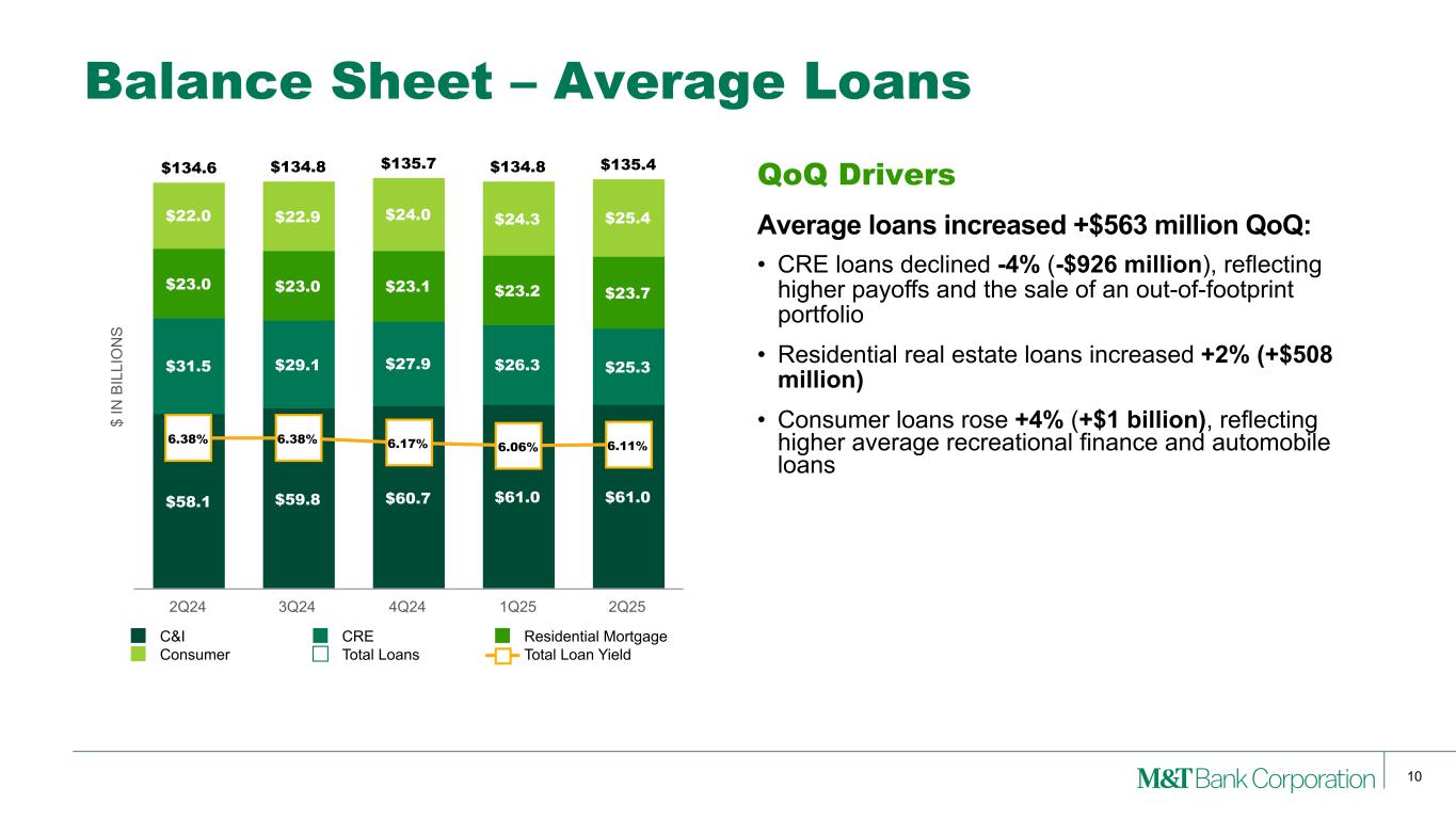 9 • Capital levels strong with CET1 capital ratio of 10.98%(2) • Repurchased $1.1 billion(3) of common shares in 2Q25 Change 2Q25 vs Average Balances, $ in billions, except per share 2Q25 1Q25 2Q24 1Q25 2Q24 Interest-bearing Deposits at Banks $19.7 $19.7 $29.3 —% -33% Investment Securities 35.3 34.5 29.7 2 19 Commercial and Industrial (“C&I”) 61.0 61.0 58.1 — 5 Commercial Real Estate (“CRE”) 25.3 26.3 31.5 -4 -19 Residential Mortgage 23.7 23.2 23.0 2 3 Consumer 25.4 24.3 22.0 4 15 Total Loans 135.4 134.8 134.6 — 1 Earning Assets 190.5 189.1 193.7 1 -2 Deposits 163.4 161.2 163.5 1 — Borrowings 14.3 14.2 16.5 1 -13 Common Shareholders’ Equity 26.3 26.6 25.3 -1 4 As of Quarter End Common Shareholders' Equity per Share $166.94 $163.62 $153.57 2% 9% Tangible Equity per Common Share(1) 112.48 111.13 102.42 1 10 Tangible Common Equity / Tangible Assets(1) 8.67 % 8.95 % 8.55 % -28 bps 12 bps Common Equity Tier 1 ("CET1") Capital Ratio 10.98 % 11.50 11.45 -52 bps -47 bps Balance Sheet – Overview Note: (1) See Appendix for reconciliation of GAAP with these non-GAAP measures. (2) June 30, 2025 CET1 capital ratio is estimated. (3) Includes share repurchase excise tax. (2)