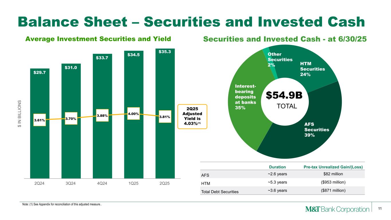 10 Balance Sheet – Average Loans QoQ Drivers Average loans increased +$563 million QoQ: • CRE loans declined -4% (-$926 million), reflecting higher payoffs and the sale of an out-of-footprint portfolio • Residential real estate loans increased +2% (+$508 million) • Consumer loans rose +4% (+$1 billion), reflecting higher average recreational finance and automobile loans $ IN B IL LI O N S $58.1 $59.8 $60.7 $61.0 $61.0 $31.5 $29.1 $27.9 $26.3 $25.3 $23.0 $23.0 $23.1 $23.2 $23.7 $22.0 $22.9 $24.0 $24.3 $25.4 $134.6 $134.8 $135.7 $134.8 $135.4 6.38% 6.38% 6.17% 6.06% 6.11% C&I CRE Residential Mortgage Consumer Total Loans Total Loan Yield 2Q24 3Q24 4Q24 1Q25 2Q25