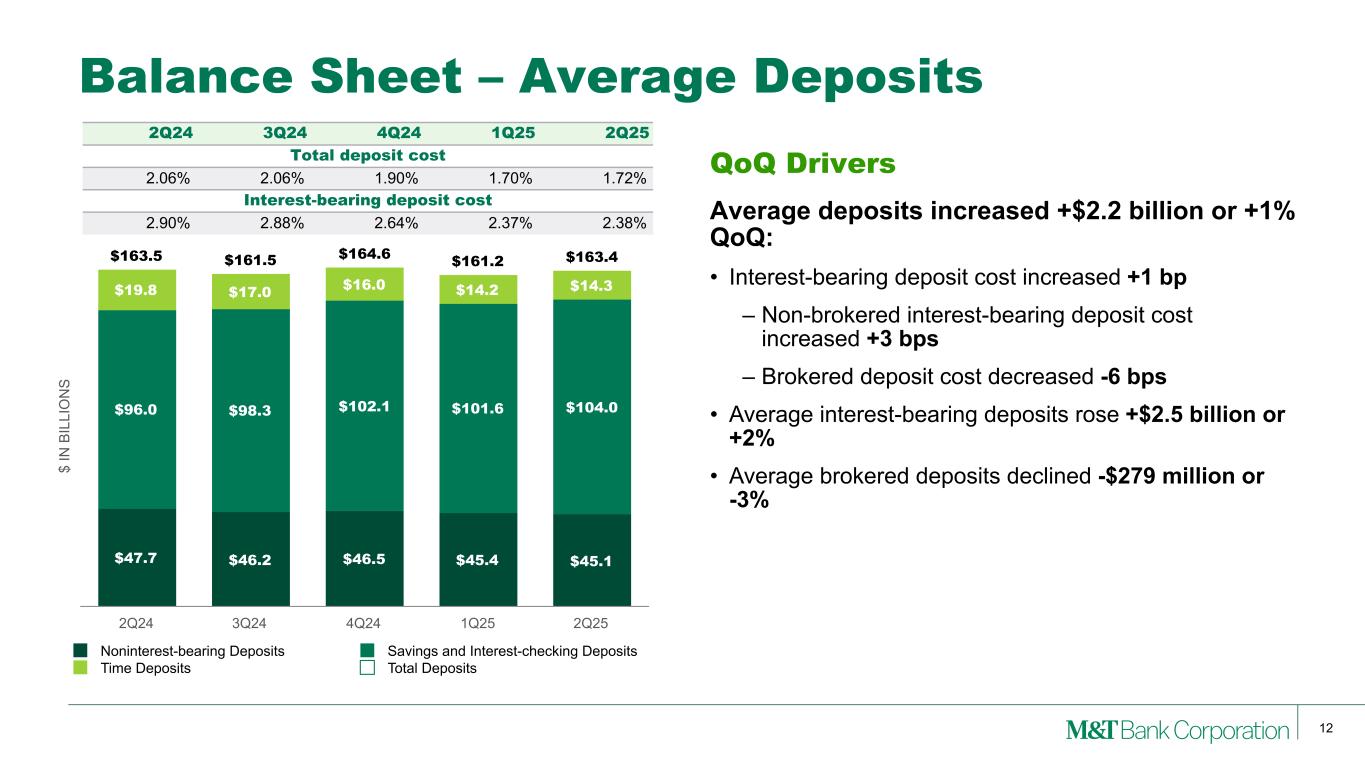 11 Balance Sheet – Securities and Invested Cash Duration Pre-tax Unrealized Gain/(Loss) AFS ~2.6 years $82 million HTM ~5.3 years ($953 million) Total Debt Securities ~3.6 years ($871 million) $ IN B IL LI O N S Average Investment Securities and Yield $29.7 $31.0 $33.7 $34.5 $35.3 3.61% 3.70% 3.88% 4.00% 3.81% 2Q24 3Q24 4Q24 1Q25 2Q25 Interest- bearing deposits at banks 35% Other Securities 2% HTM Securities 24% AFS Securities 39% $54.9B TOTAL2Q25 Adjusted Yield is 4.03%(1) Securities and Invested Cash - at 6/30/25 Note: (1) See Appendix for reconciliation of this adjusted measure..